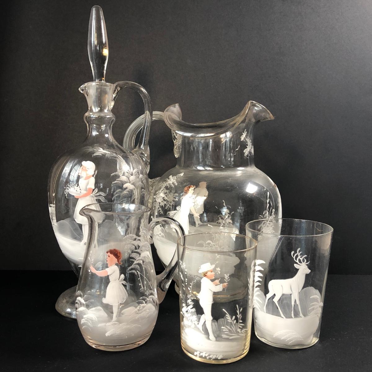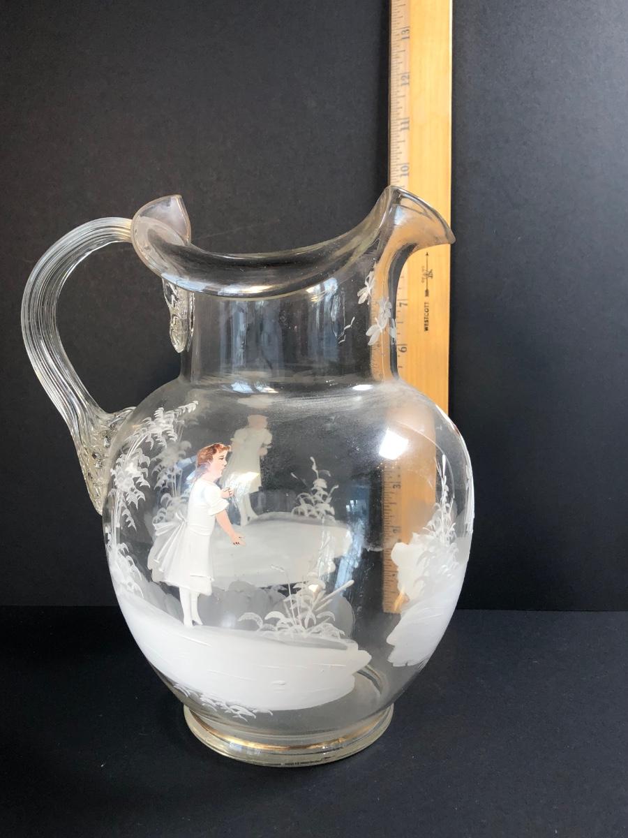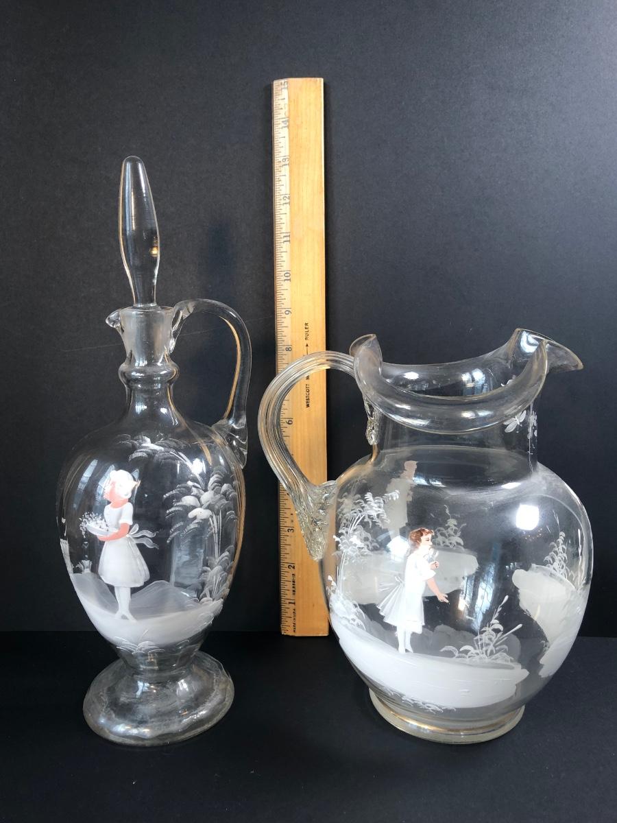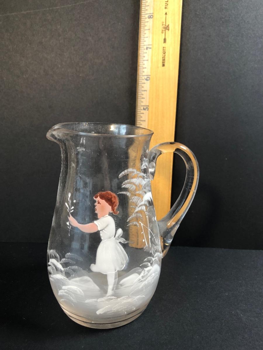 Stunning hand painted glass attributed to Mary Gregory. Includes a decanter with a handle, a large pitcher, a small pitcher and two glasses. Please see all pictures as they are the best representation of the items. The pictures show condition, measurements if taken, and what is included in the lot. Due to the large amount that we photograph and the time frame, we are not always able to take measurements. All items unless noted, are pre-owned and have been used. If you purchased furniture, you must bring help. We do not allow one person to carry large furniture out on their own. Bring help, tools and a truck for the safety of our client’s homes, and your personal safety. Any damages that result to the property including walls, and floors due to moving of the furniture will be charged to the buyer. Company policy. Thank you.