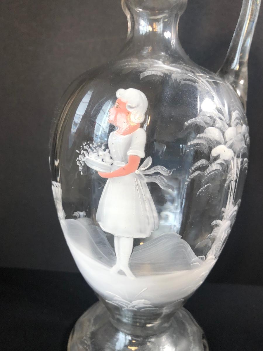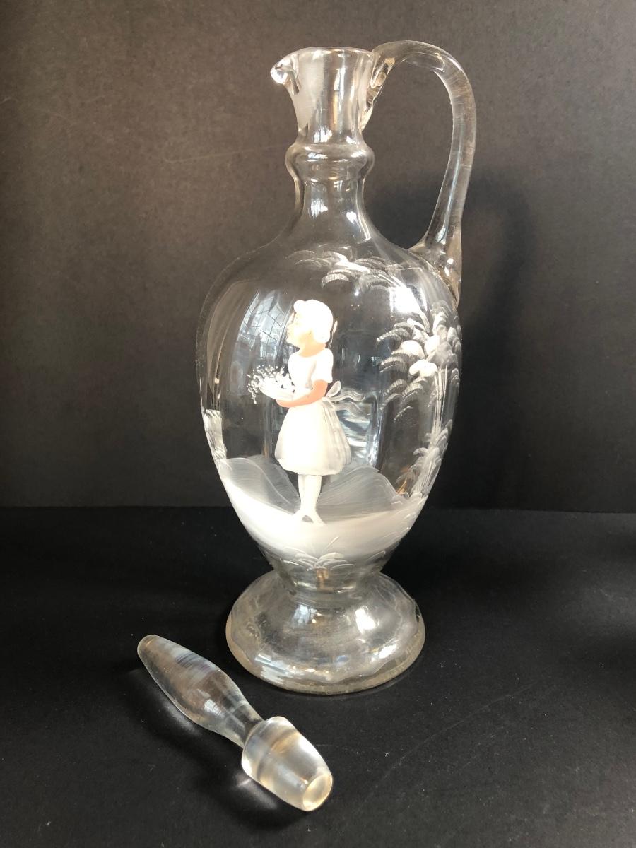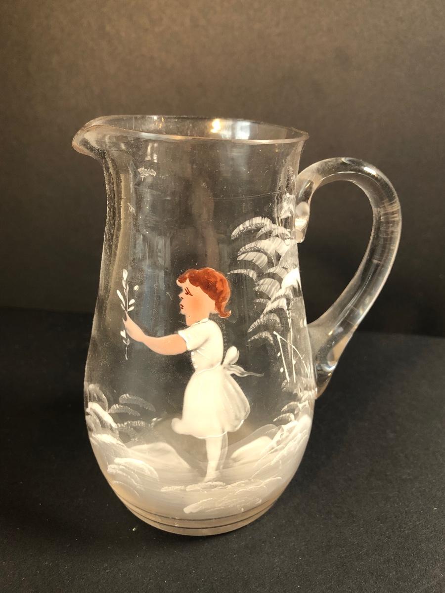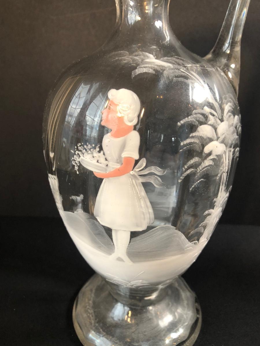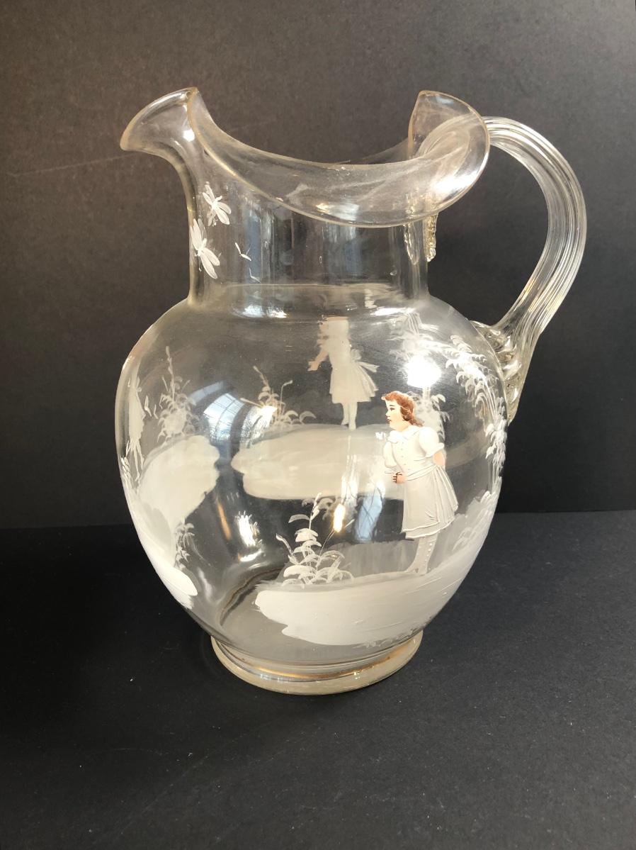 Stunning hand painted glass attributed to Mary Gregory. Includes a decanter with a handle, a large pitcher, a small pitcher and two glasses. Please see all pictures as they are the best representation of the items. The pictures show condition, measurements if taken, and what is included in the lot. Due to the large amount that we photograph and the time frame, we are not always able to take measurements. All items unless noted, are pre-owned and have been used. If you purchased furniture, you must bring help. We do not allow one person to carry large furniture out on their own. Bring help, tools and a truck for the safety of our client’s homes, and your personal safety. Any damages that result to the property including walls, and floors due to moving of the furniture will be charged to the buyer. Company policy. Thank you.