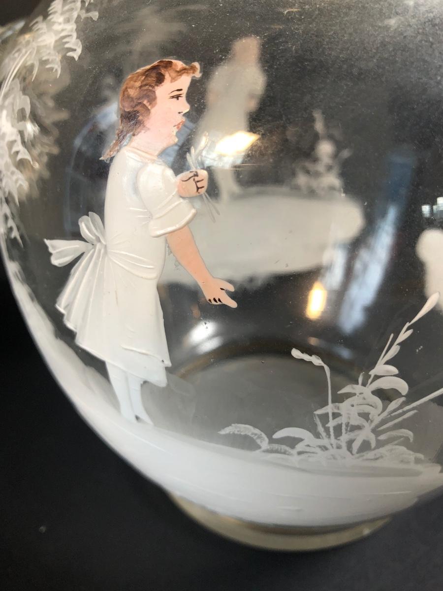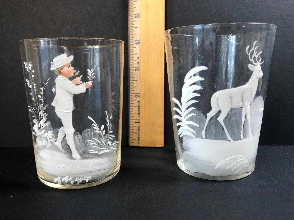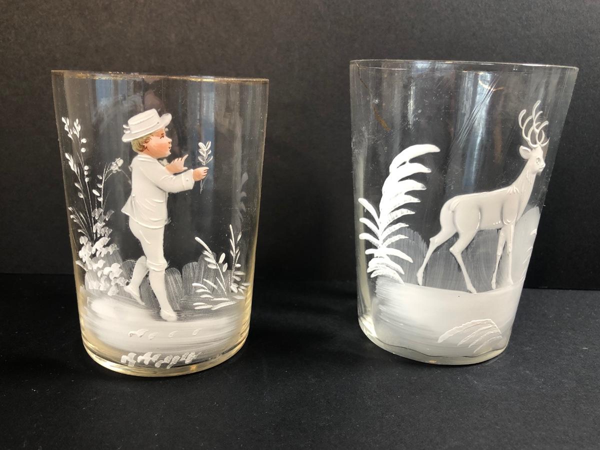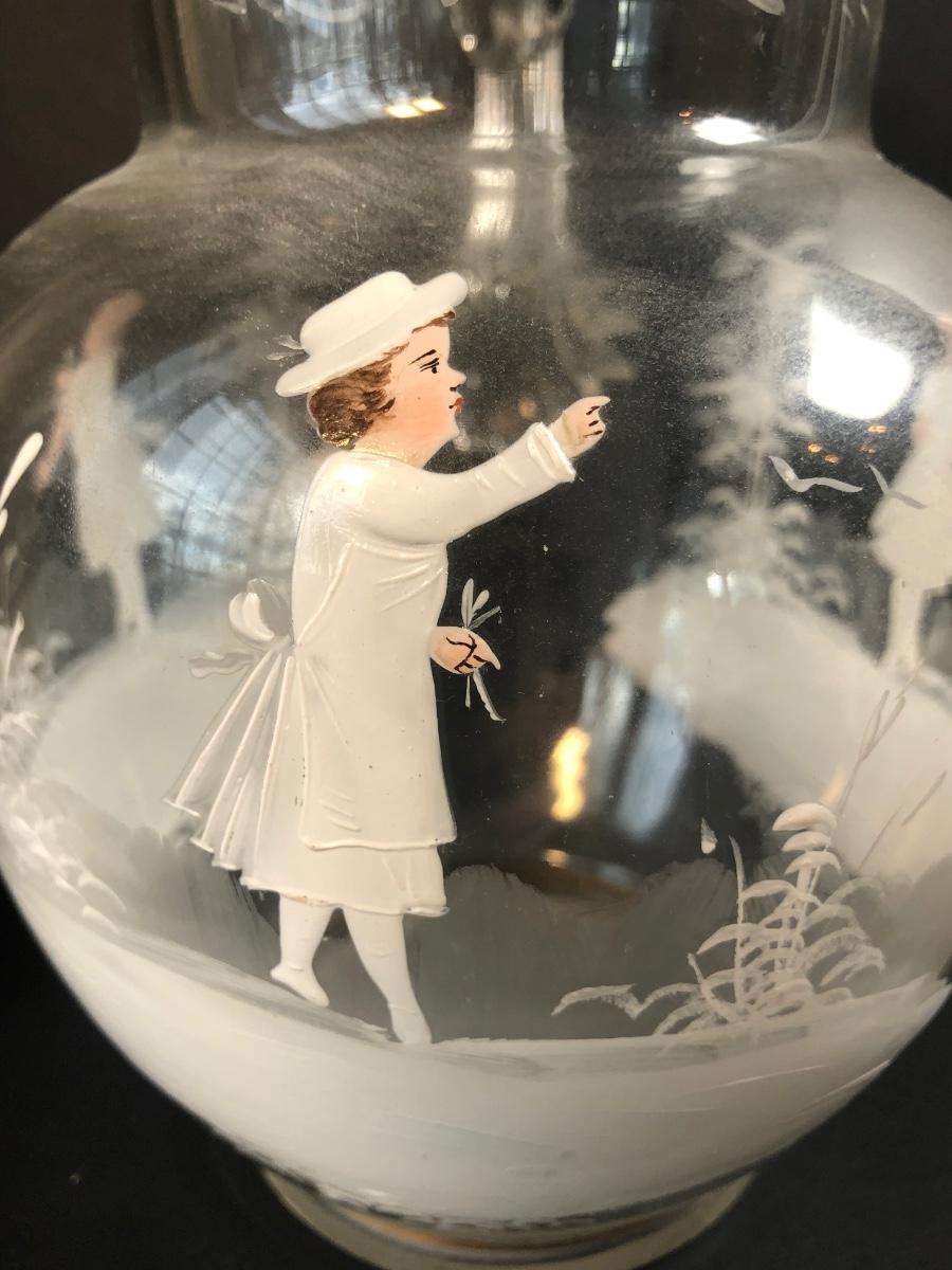 Stunning hand painted glass attributed to Mary Gregory. Includes a decanter with a handle, a large pitcher, a small pitcher and two glasses. Please see all pictures as they are the best representation of the items. The pictures show condition, measurements if taken, and what is included in the lot. Due to the large amount that we photograph and the time frame, we are not always able to take measurements. All items unless noted, are pre-owned and have been used. If you purchased furniture, you must bring help. We do not allow one person to carry large furniture out on their own. Bring help, tools and a truck for the safety of our client’s homes, and your personal safety. Any damages that result to the property including walls, and floors due to moving of the furniture will be charged to the buyer. Company policy. Thank you.