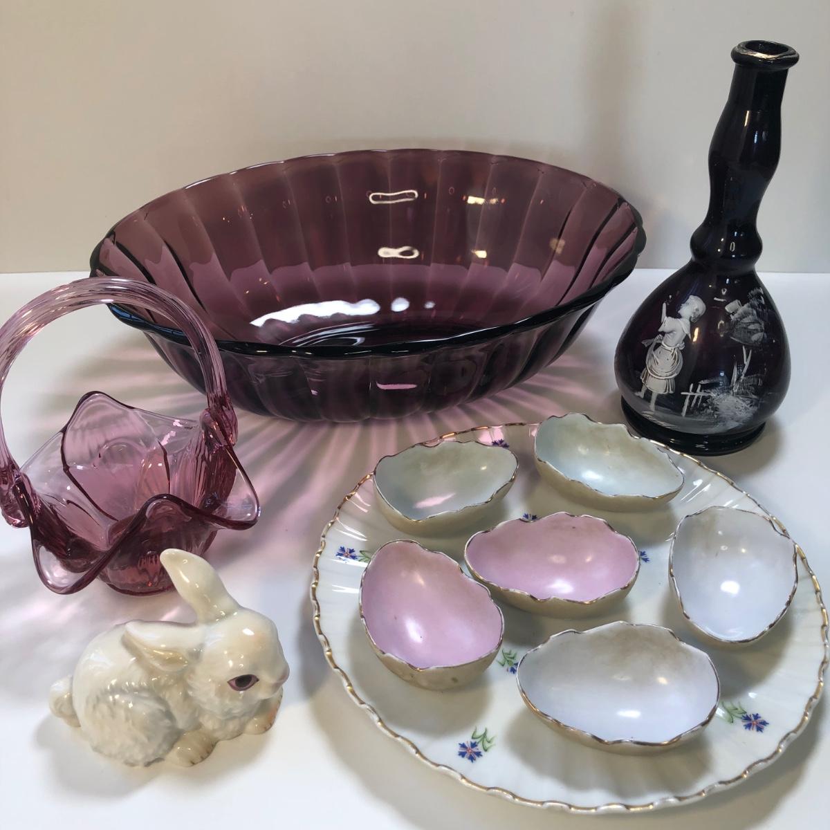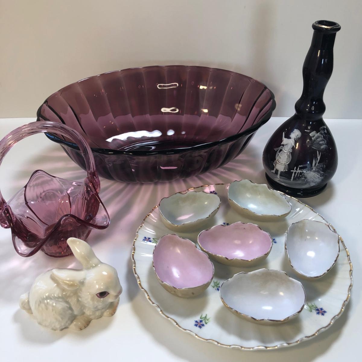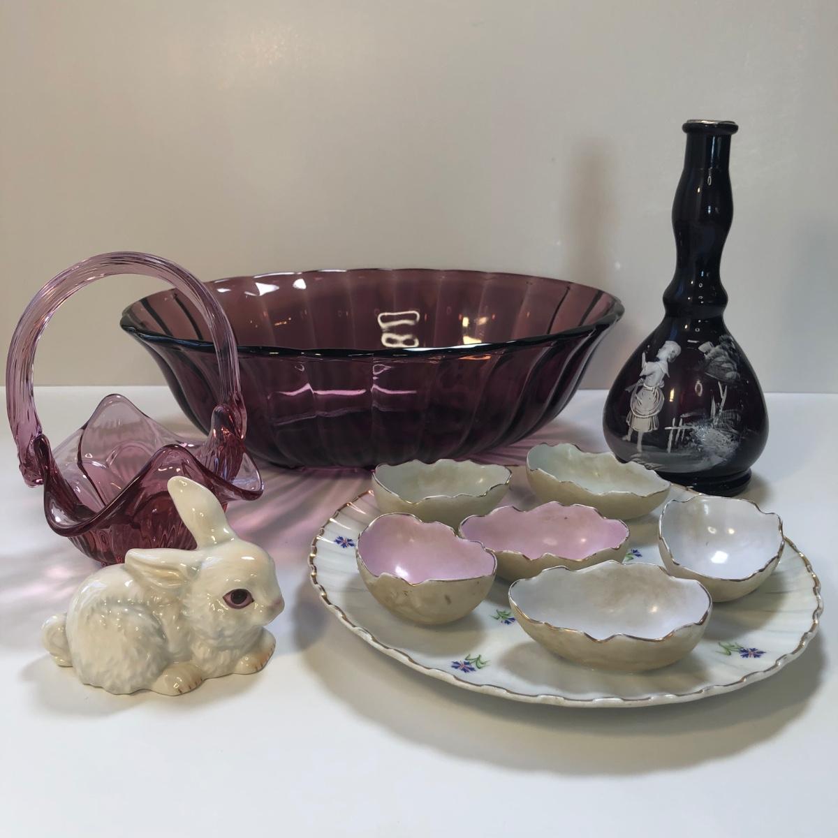 Includes a large purple Fenton glass bowl, a small purple Fenton glass basket, a ceramic rabbit from Goebel, a hand painted purple vase and a china dish made in France to hold eggs.
