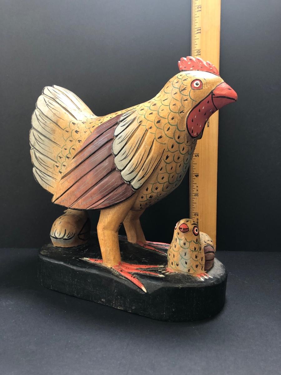 One carved statue of a chicken, measures about 10" tall.