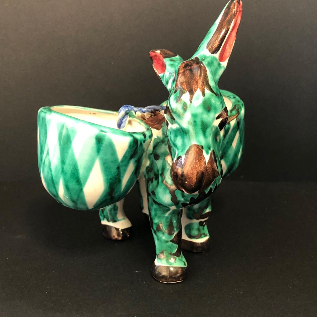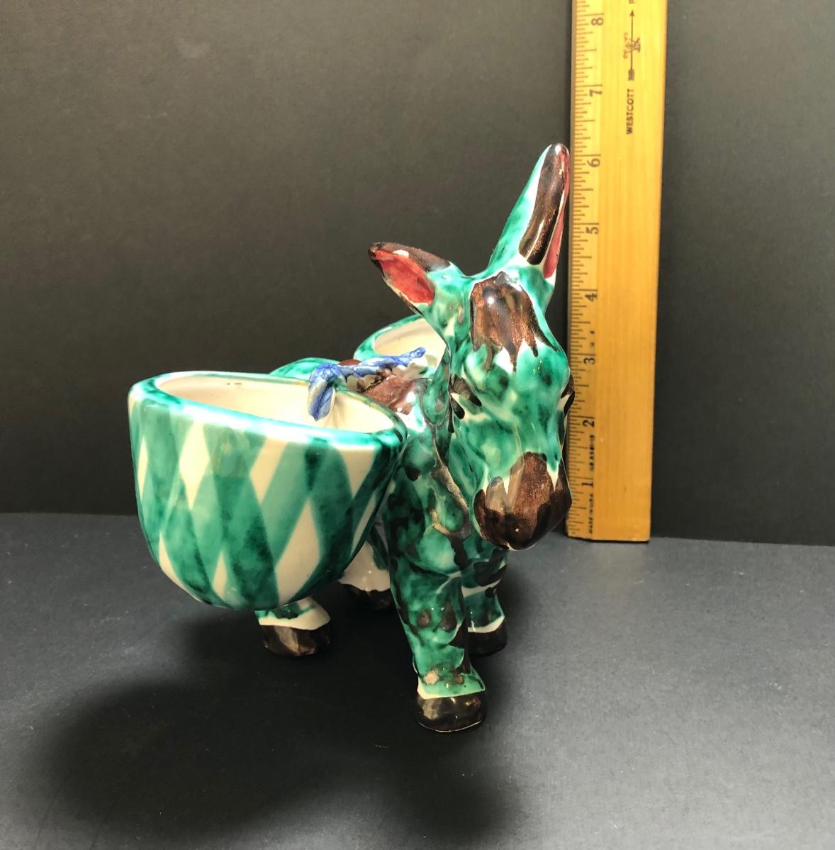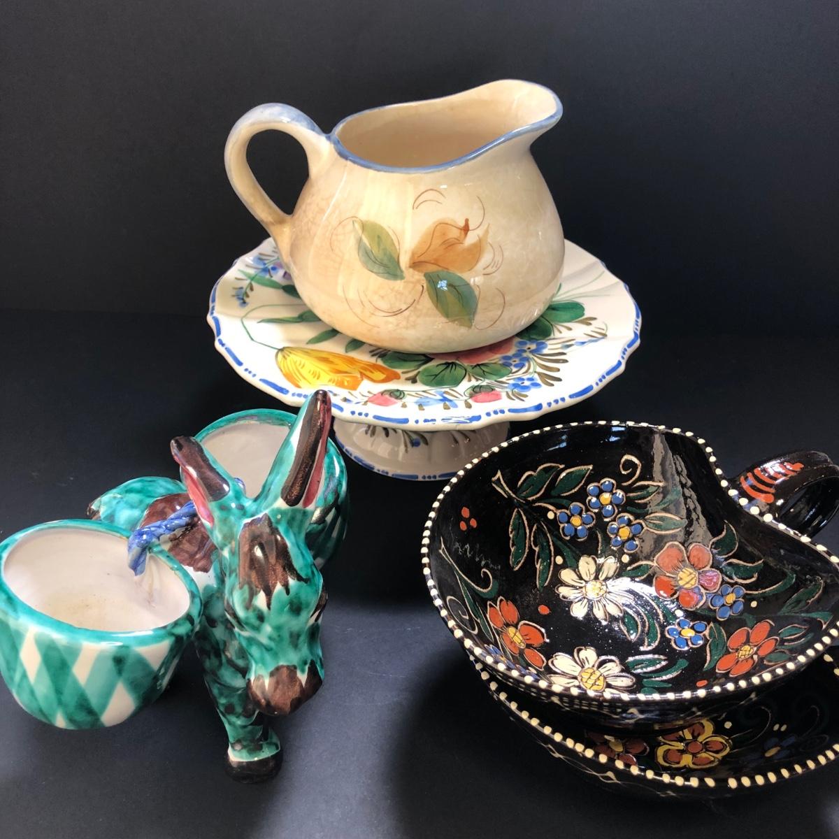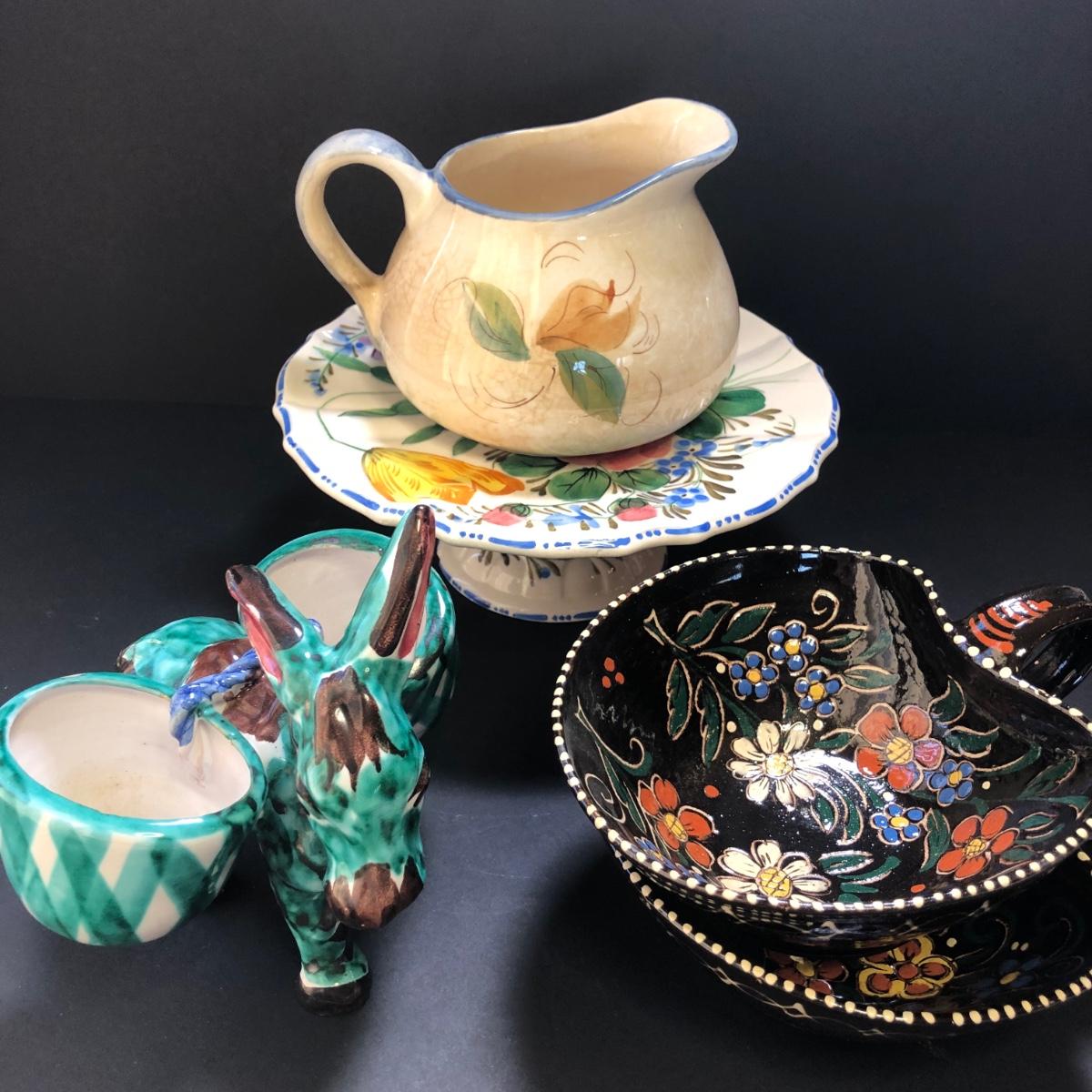 Includes cake stand, pitcher, a donkey planter from Italy, and two matching black dishes with painted flowers.