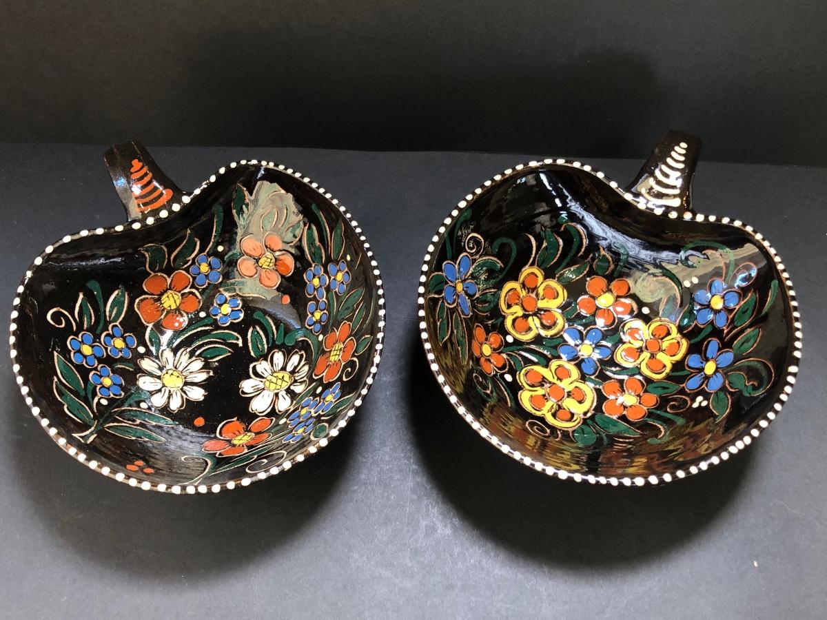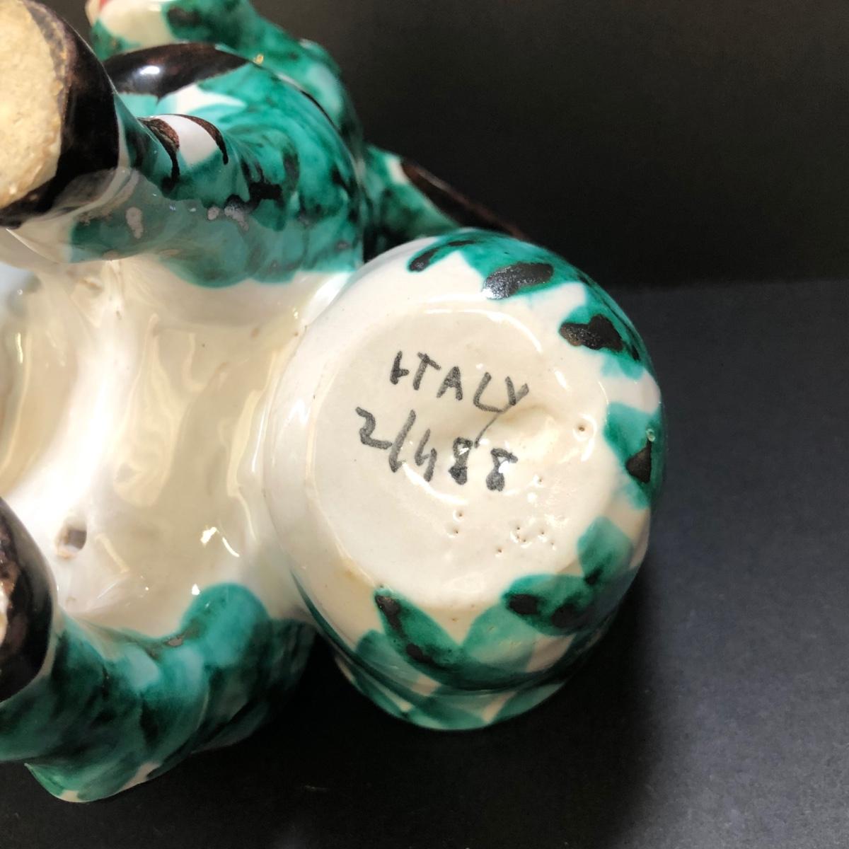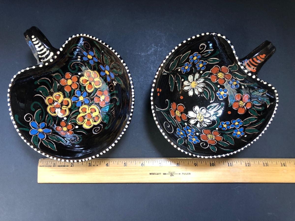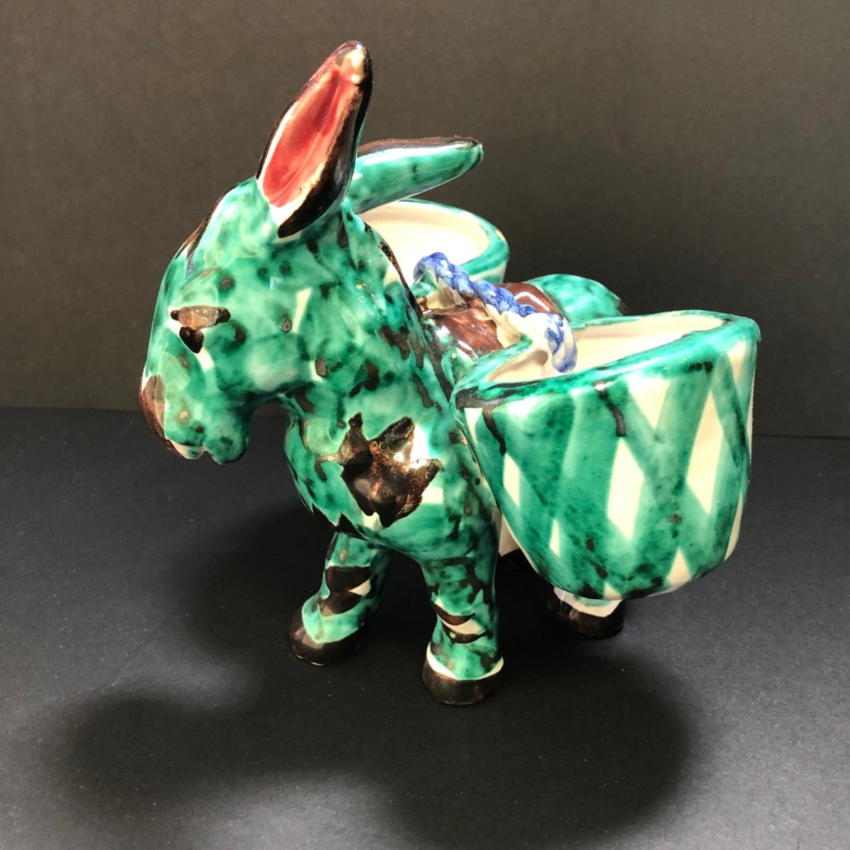 Includes cake stand, pitcher, a donkey planter from Italy, and two matching black dishes with painted flowers.
