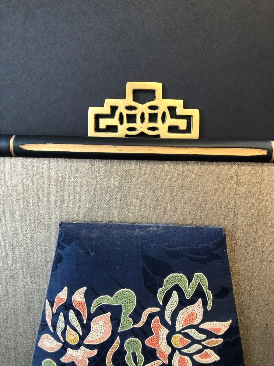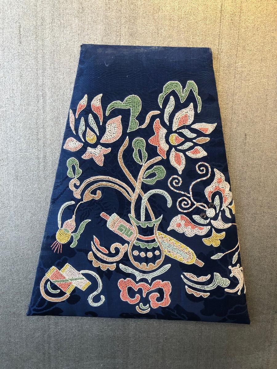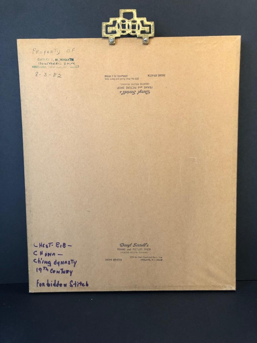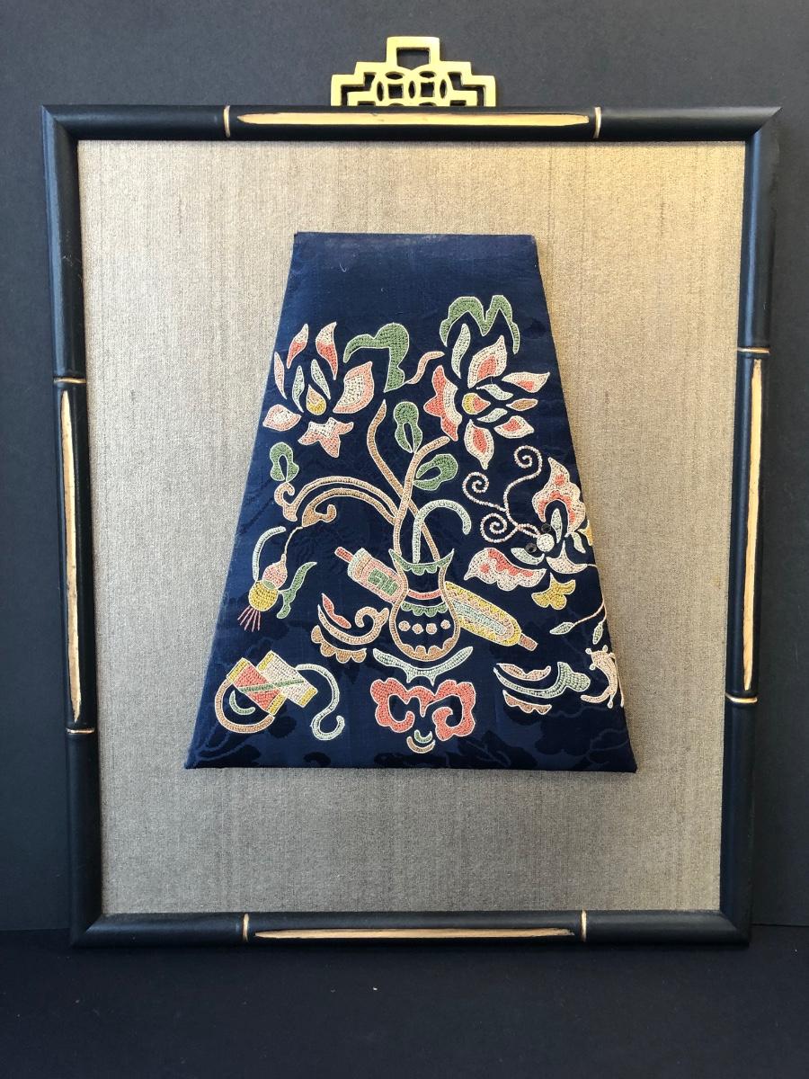 Also includes two framed bird prints, a small clock, a white and floral serving tray. The chest bib is labeled as being from the Ching dynasty in the 19th century and made with the "forbidden stitch."