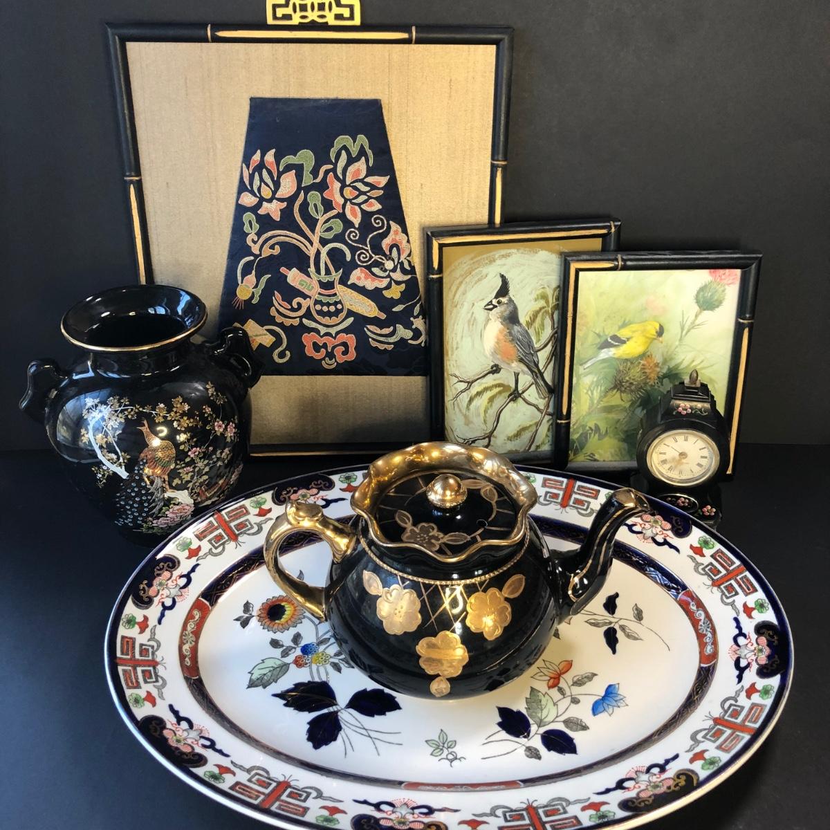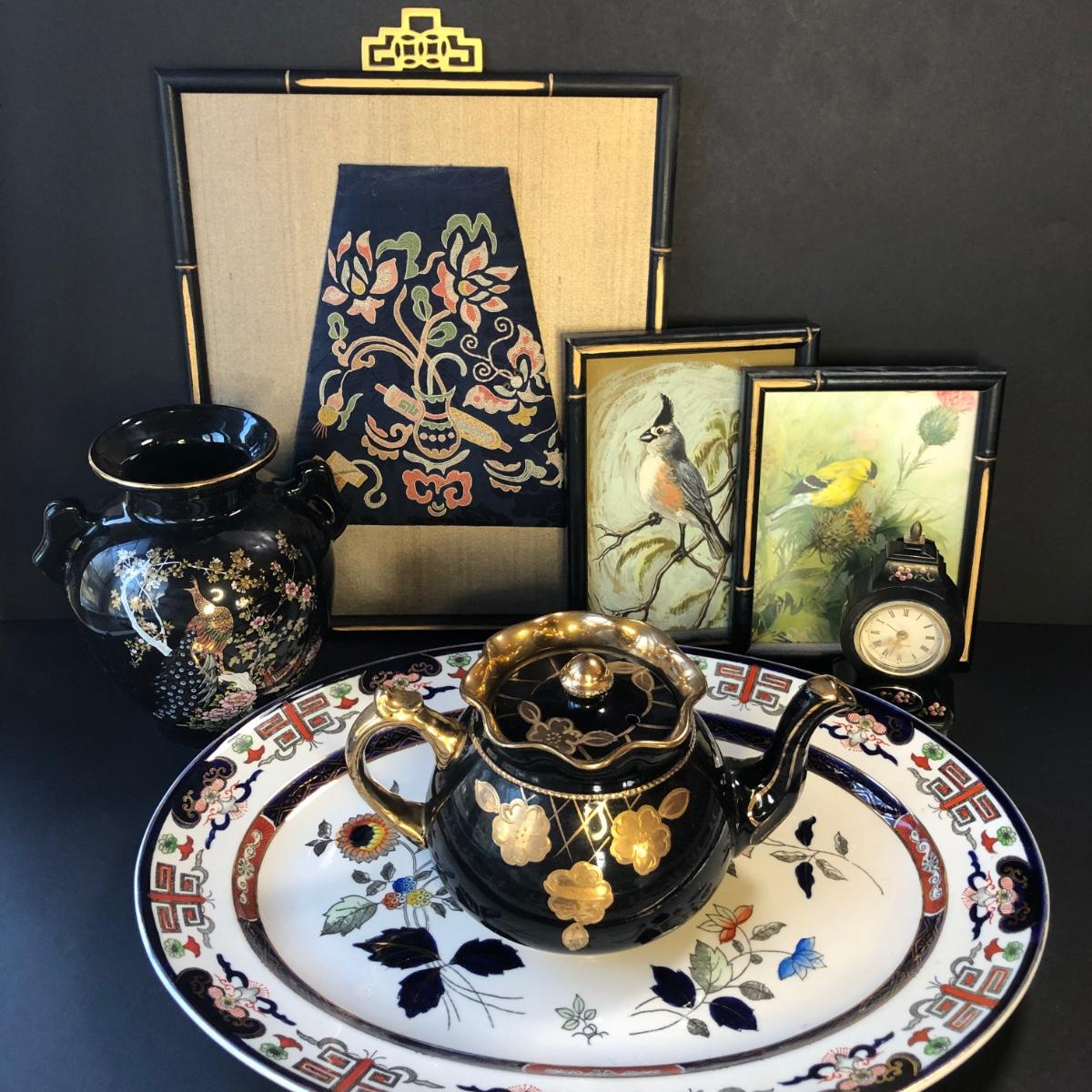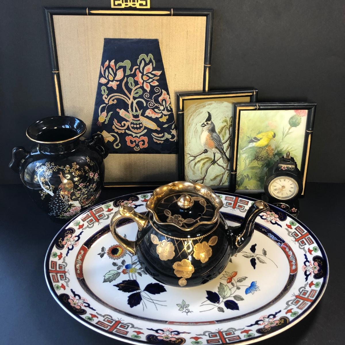 LOT81M: Japanese Vase, Tea Pot, Framed 19th Century Chinese Chest Bib & More