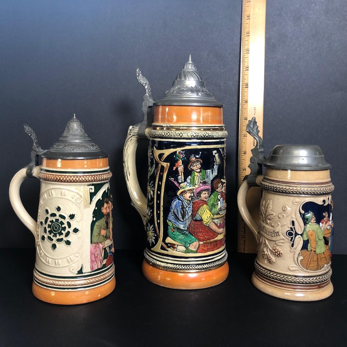 Three medium-sized beer steins. Two are marked from Germany, one has no markings at all.