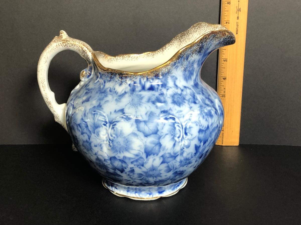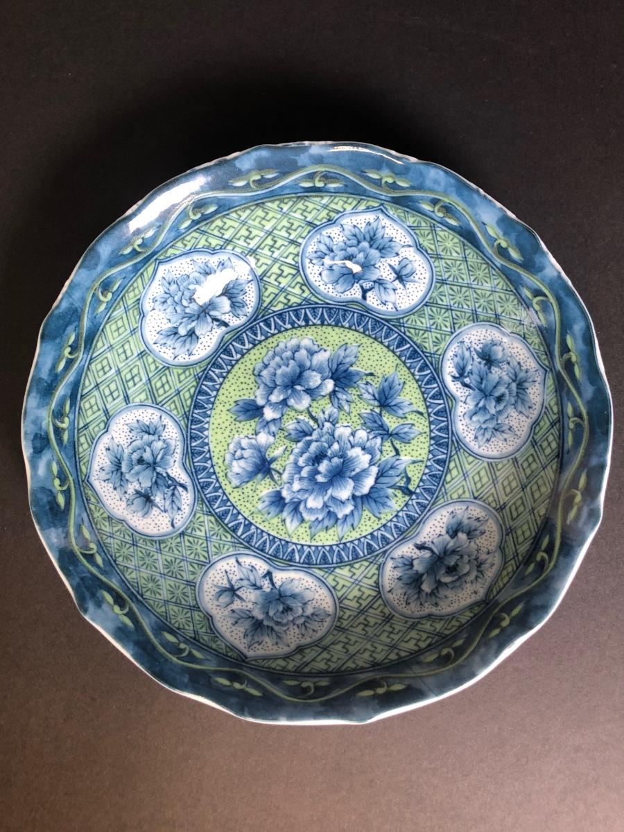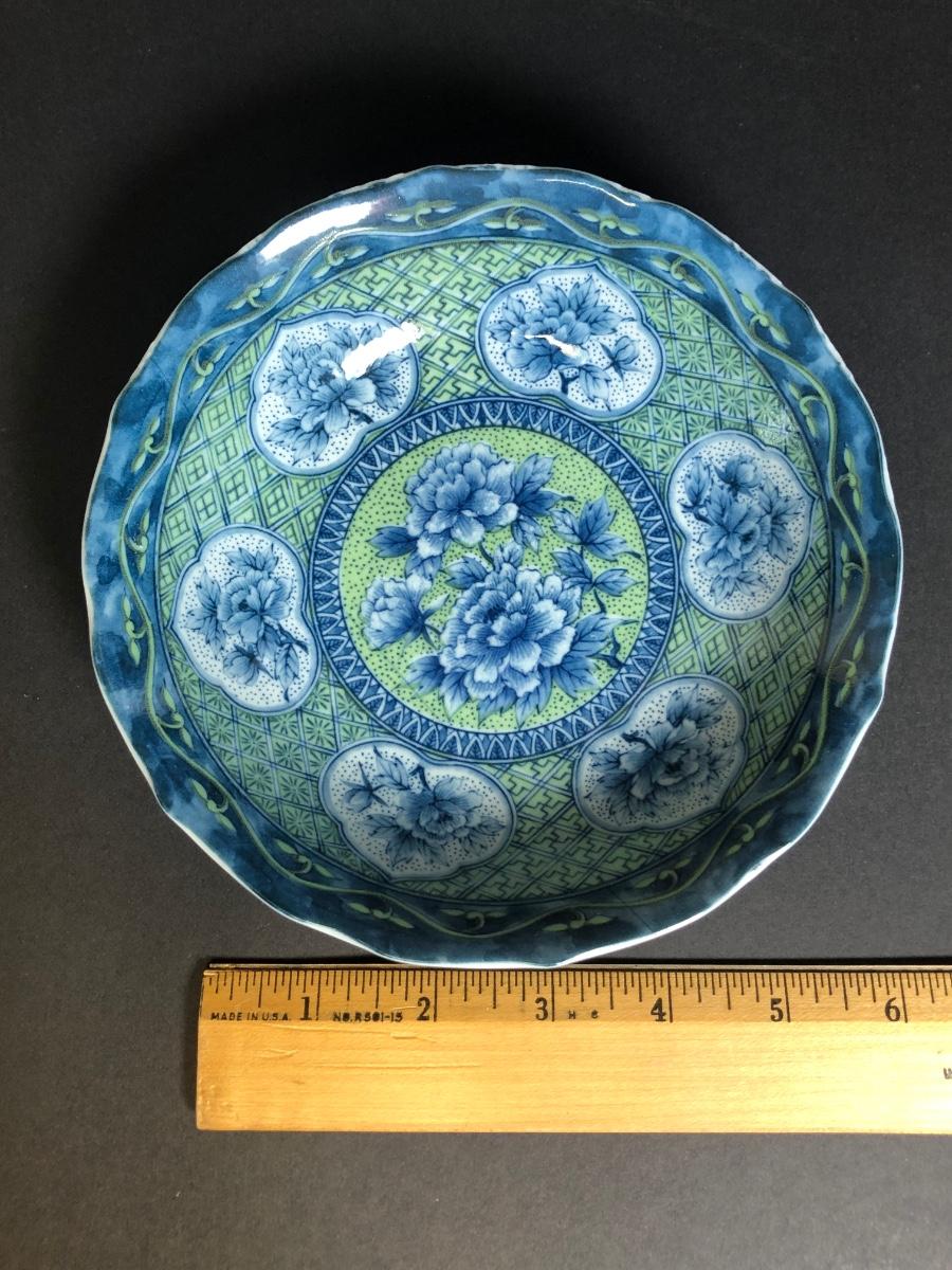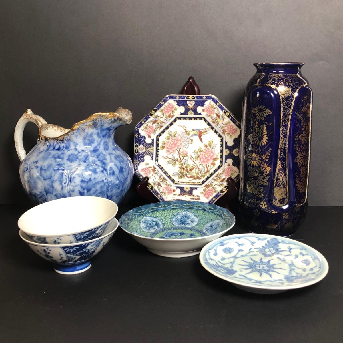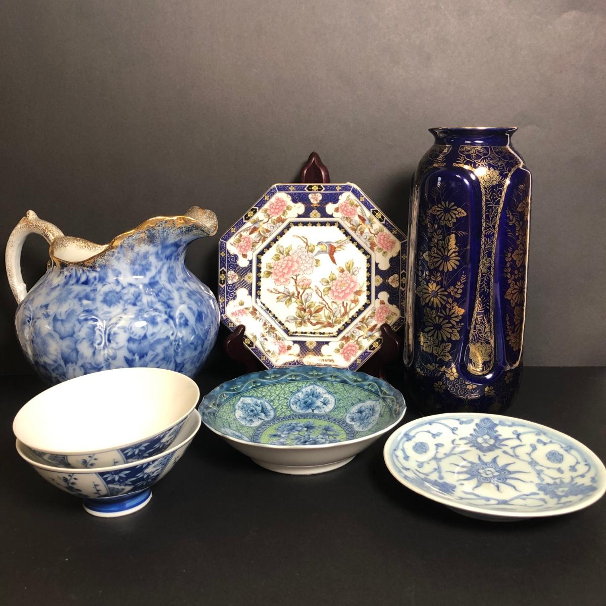 Includes two small blue and white bowls, a pitcher, two plates, a green and blue bowl and a blue and gold glass vase.