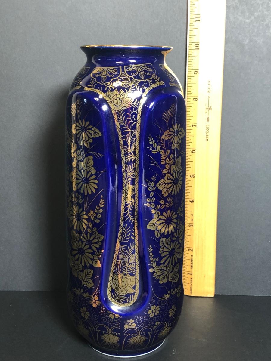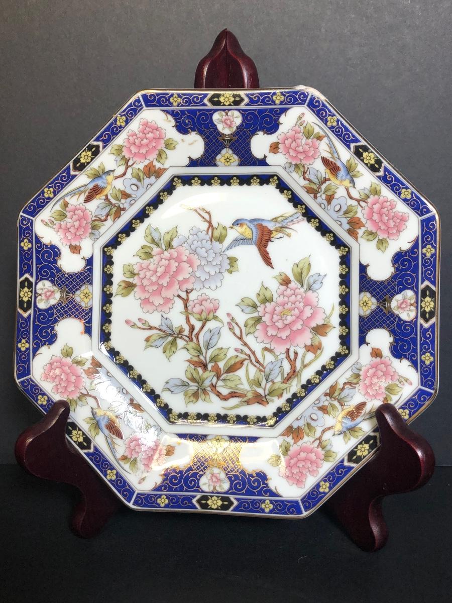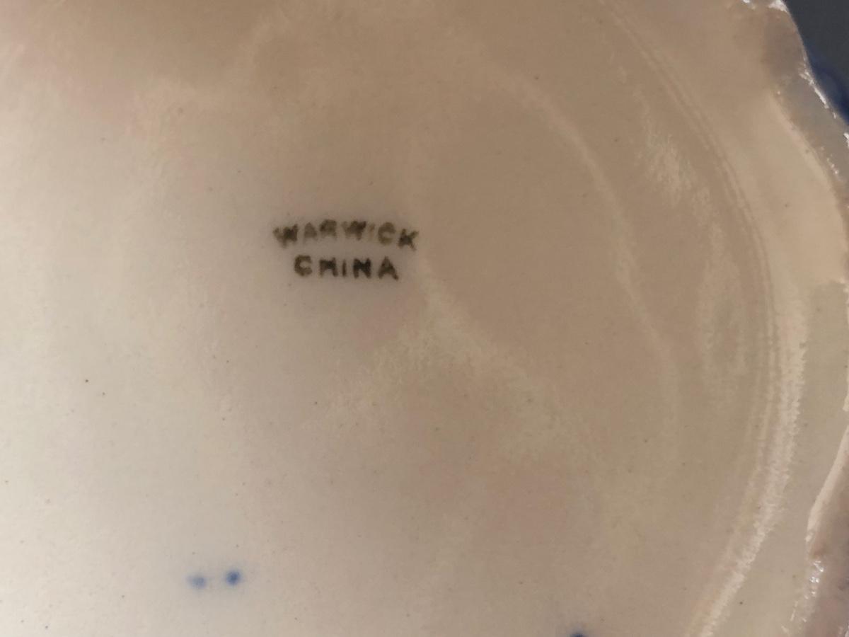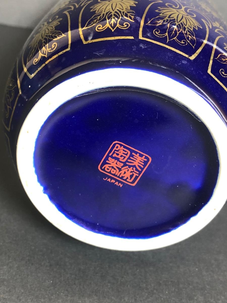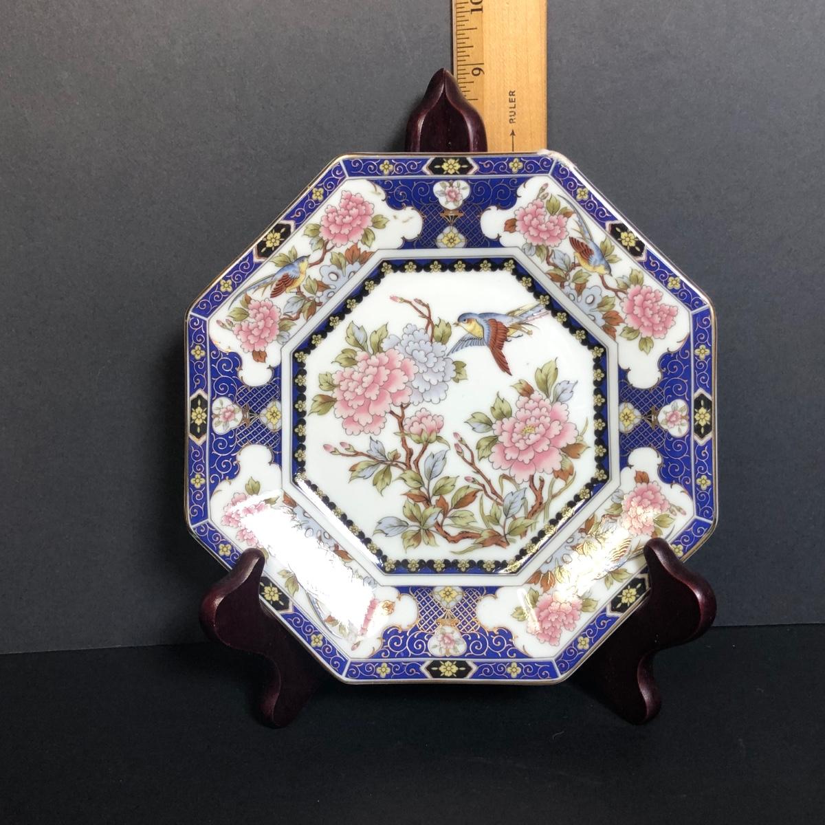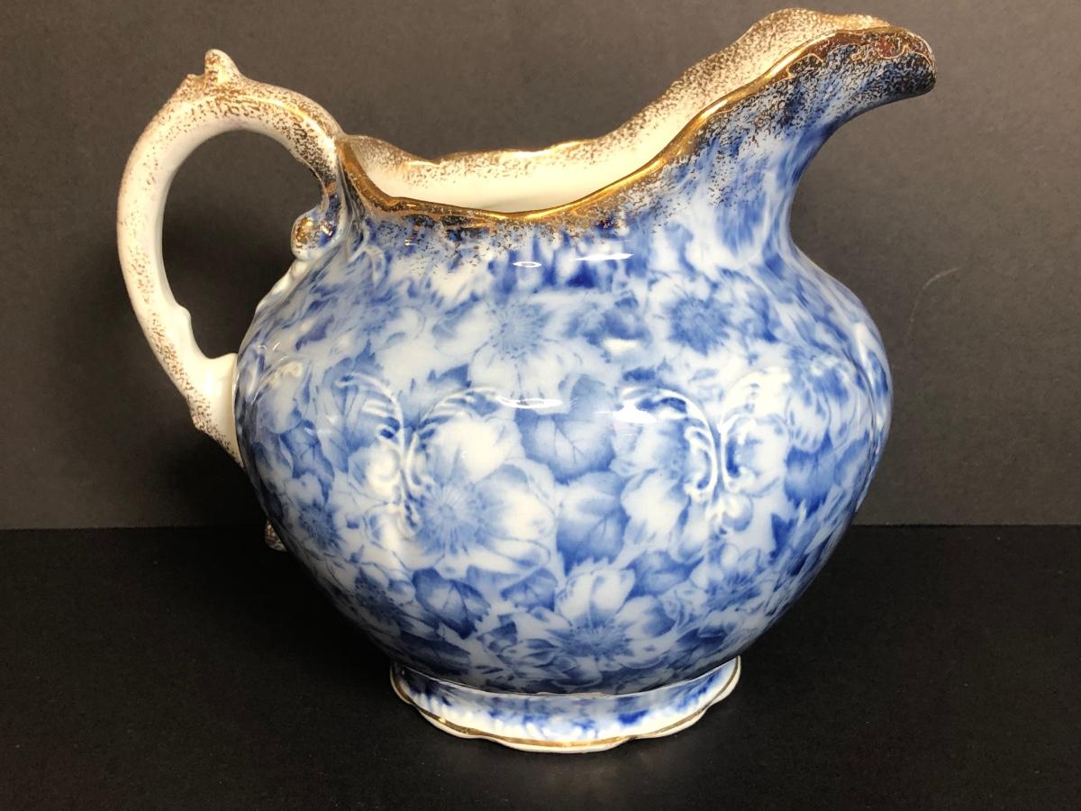 Includes two small blue and white bowls, a pitcher, two plates, a green and blue bowl and a blue and gold glass vase.