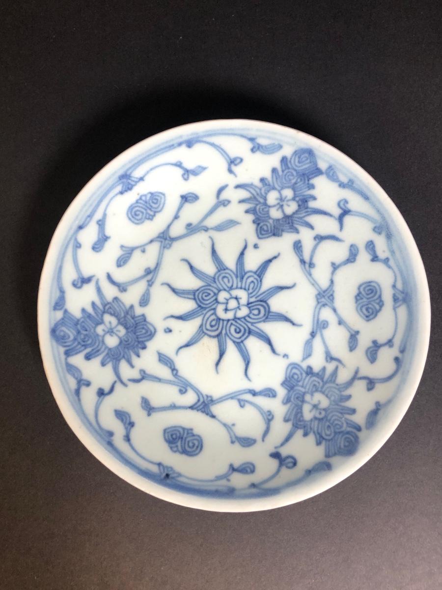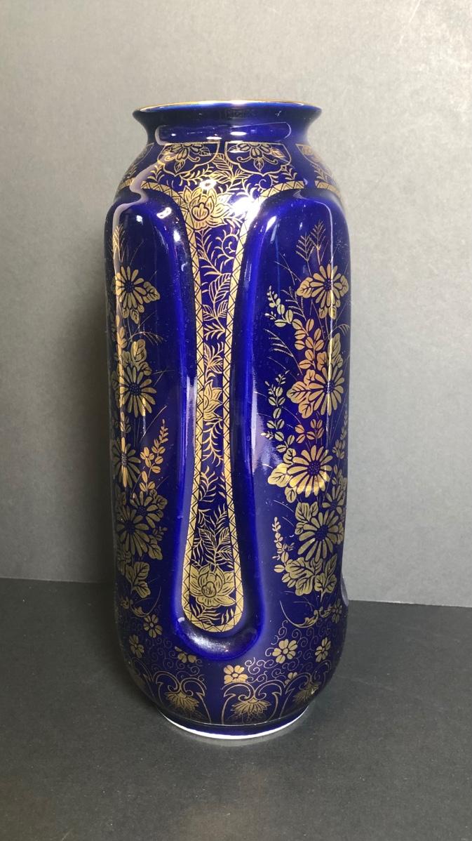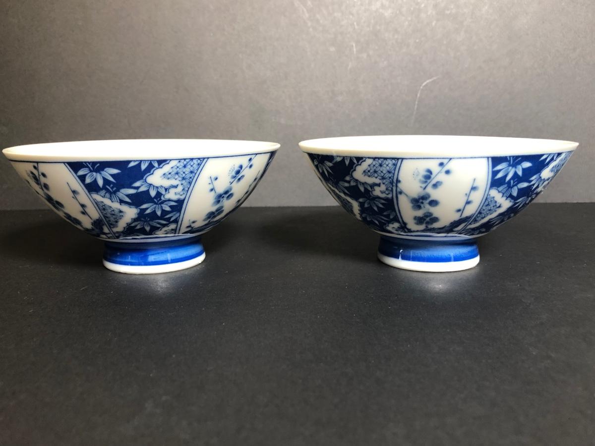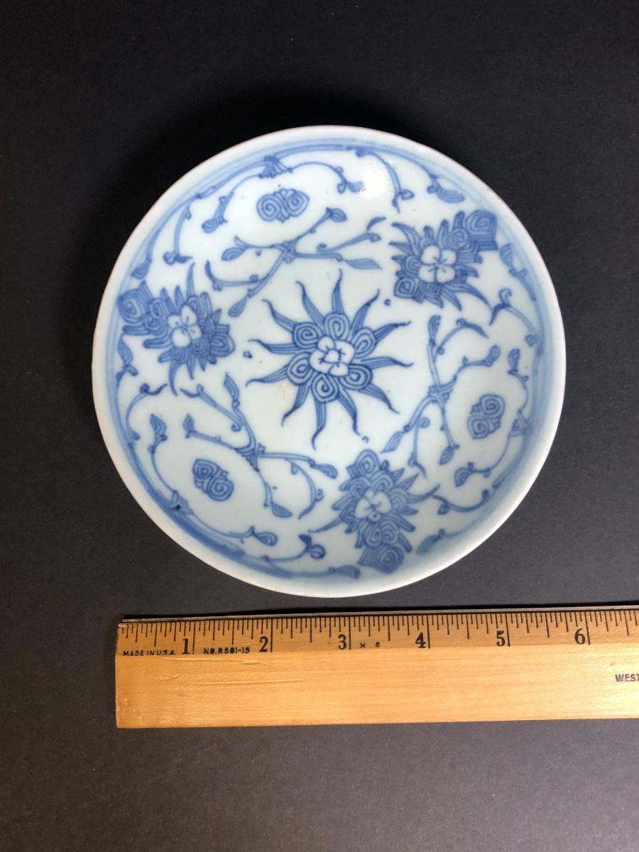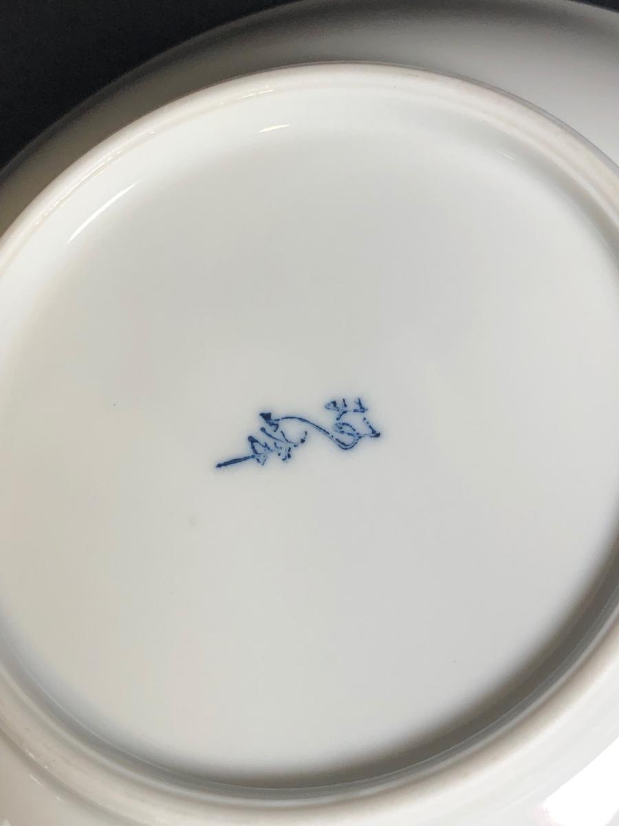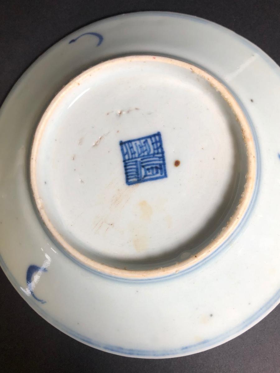 Includes two small blue and white bowls, a pitcher, two plates, a green and blue bowl and a blue and gold glass vase.