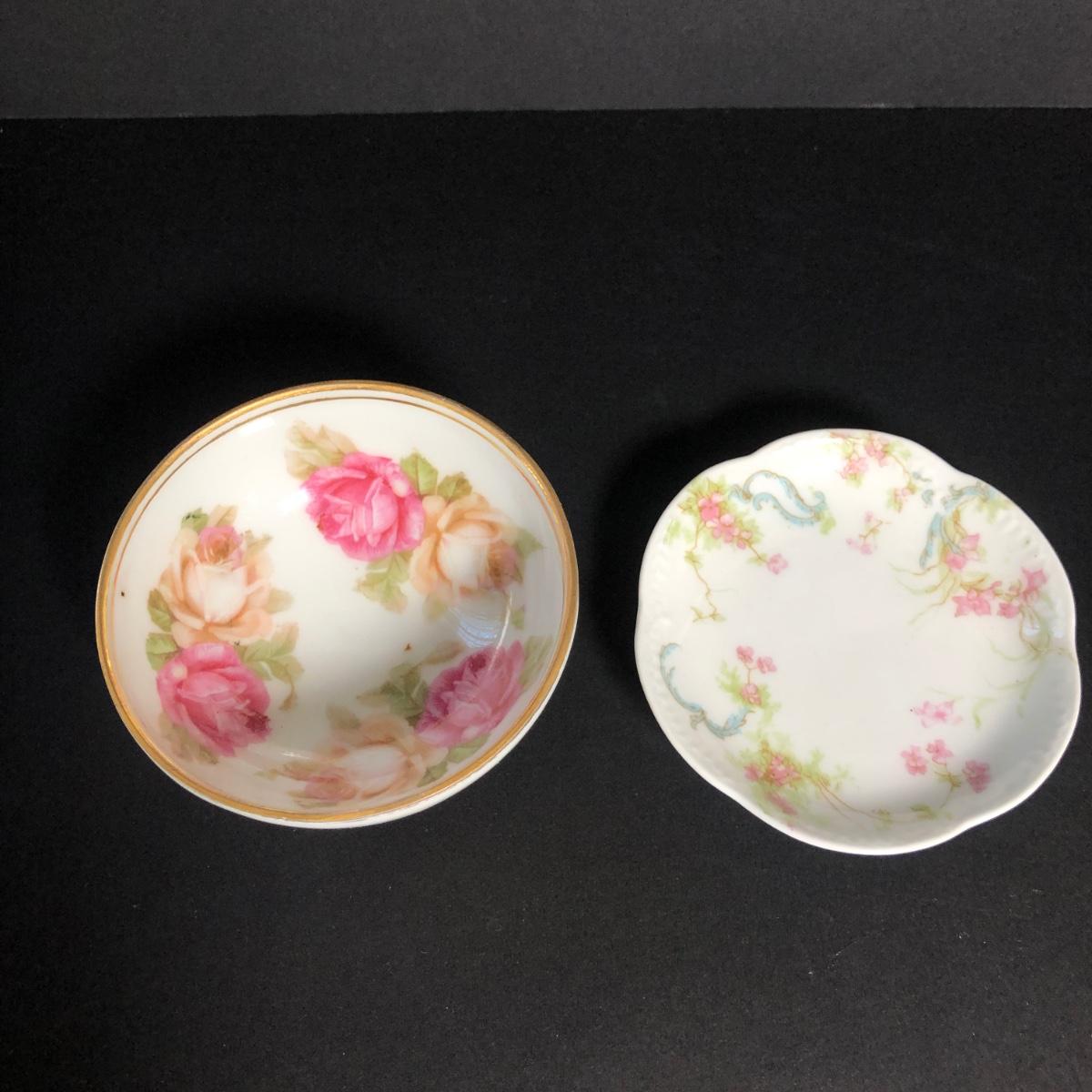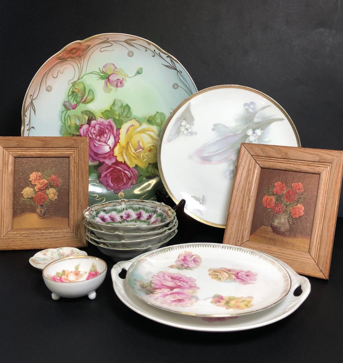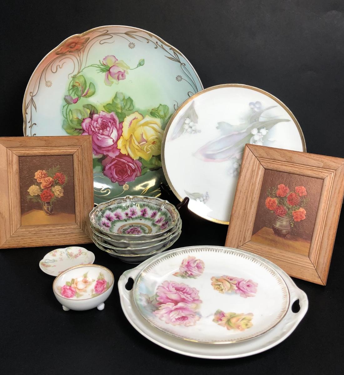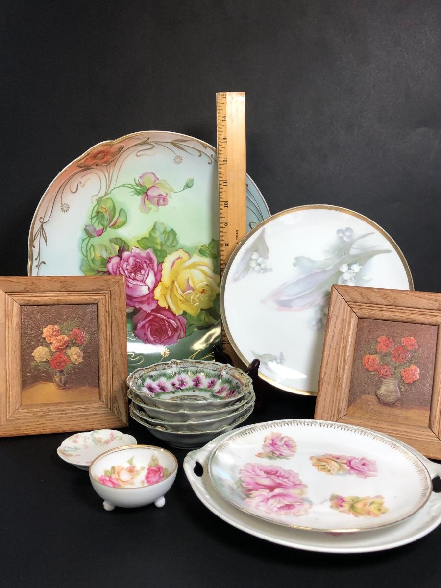 Includes four different decorative plates, three are from Germany one is hand painted and signed Two textured prints measure 6x7 inches. Two small dishes from France & Germany and a set of four small bowls.