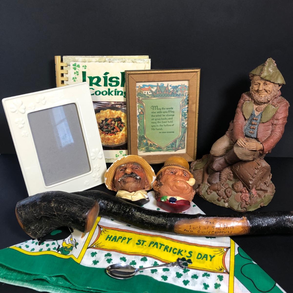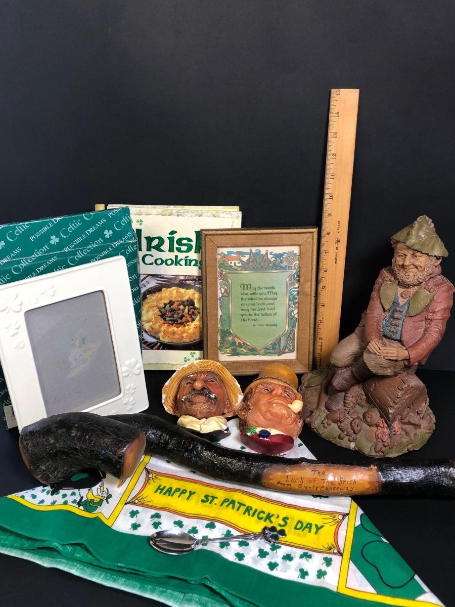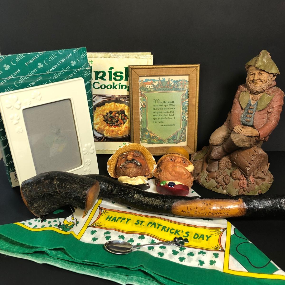 Includes a white Celtic Collection frame and two Bossuns heads: Paddy (1969) and Rumaman (1971). Also Includes an leprechaun statue, Irish Cook book, framed quote, one St. Patrick's day handkerchief, Sheffield bilchrome spoon commemorating Ireland, and one 23 inch club with "The Luck of the Irish from Giants Causeway" bunted into the side. Please see all pictures as they are the best representation of the items. The pictures show condition, measurements if taken, and what is included in the lot. Due to the large amount that we photograph and the time frame, we are not always able to take measurements. All items unless noted, are pre-owned and have been used. If you purchased furniture, you must bring help. We do not allow one person to carry large furniture out on their own. Bring help, tools and a truck for the safety of our client’s homes, and your personal safety. Any damages that result to the property including walls, and floors due to moving of the furniture will be charged to the buyer. Company policy. Thank you.