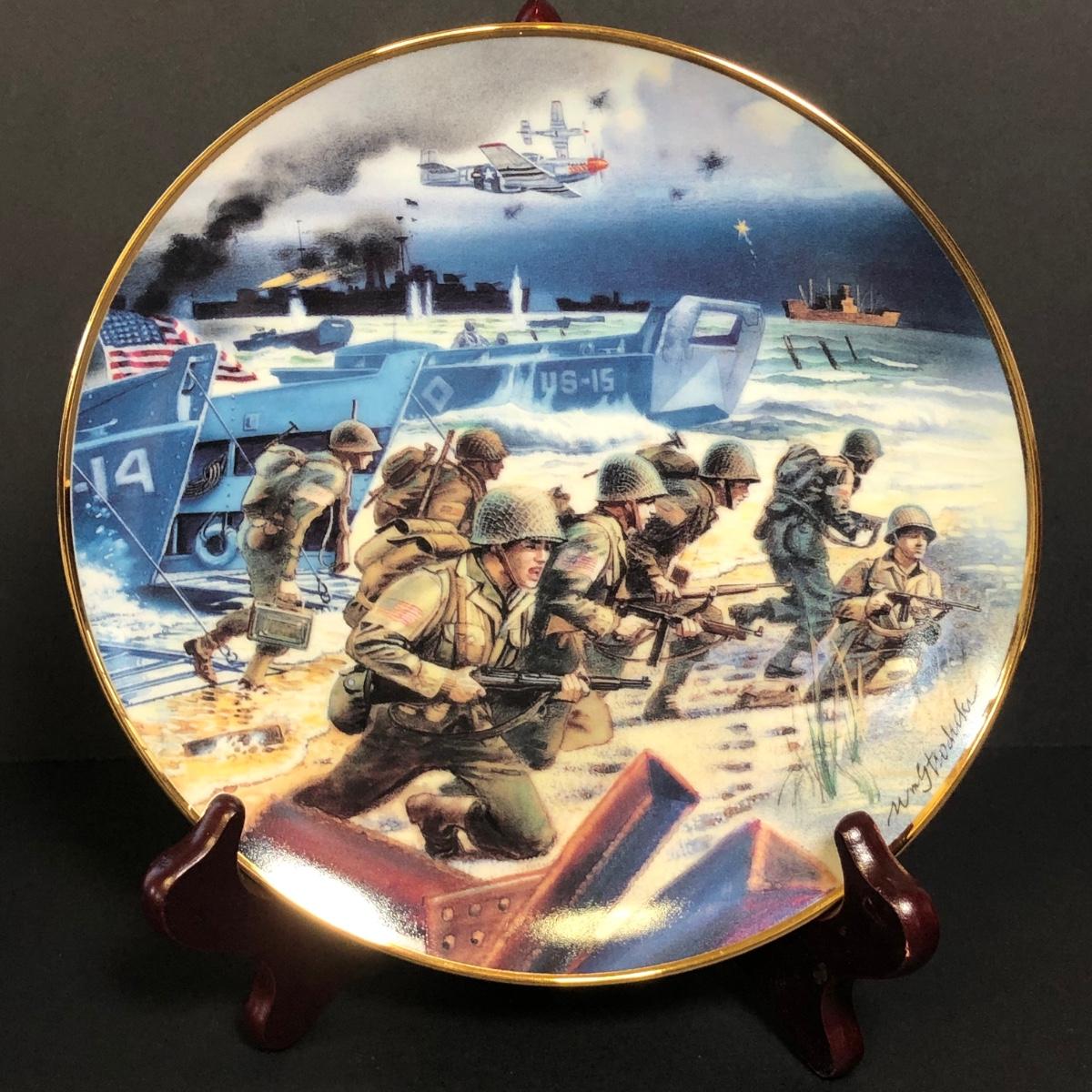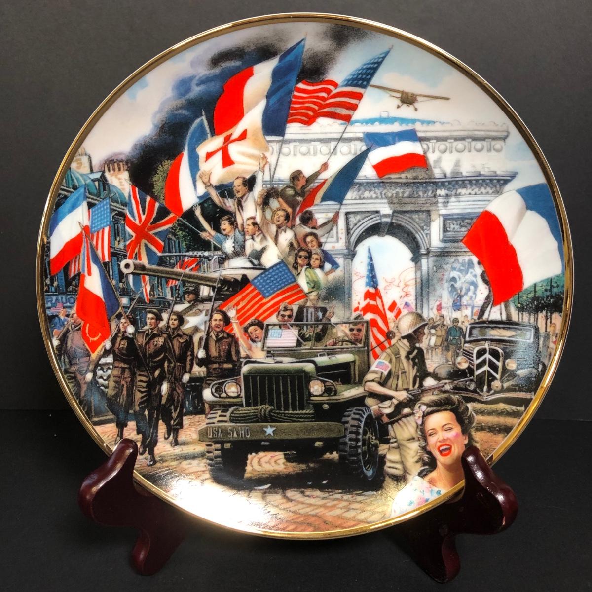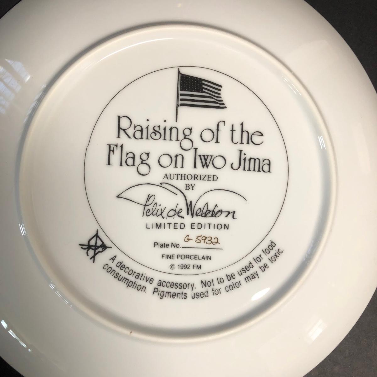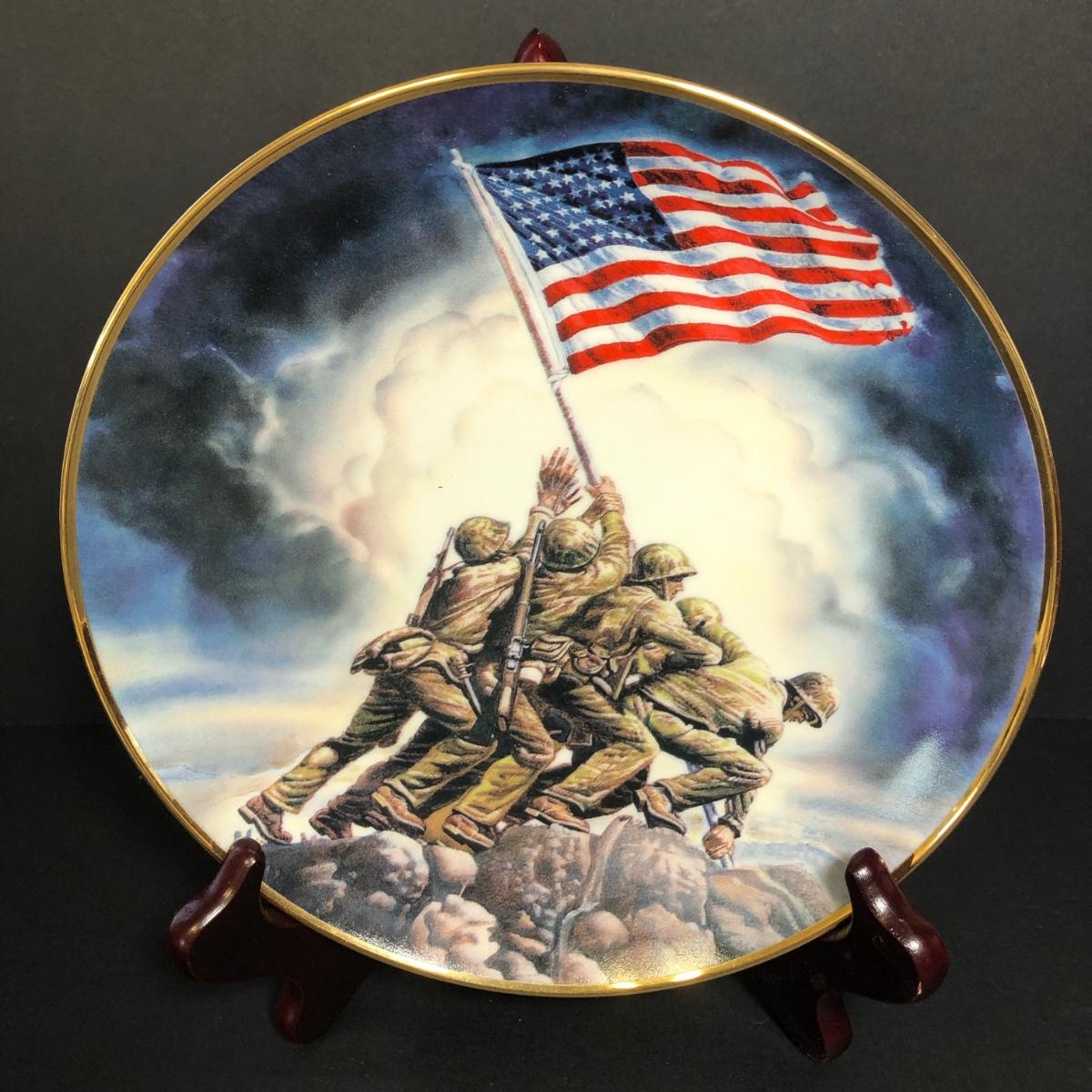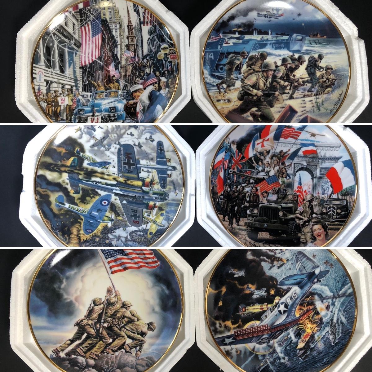 Includes six plates in Styrofoam containers. Limited edition porcelain plates depict the Battle of Midway, Raising of the Flag on Iwo Jima, The Liberation of Paris, The Battle of Britain, Storming the Beaches of Normandy, and VJ Day.