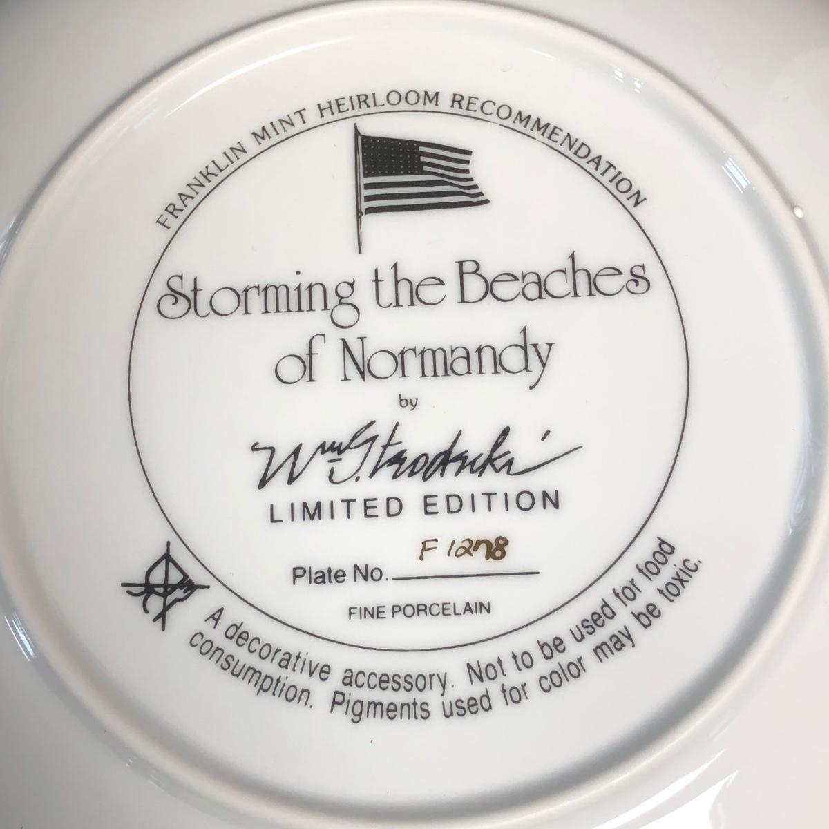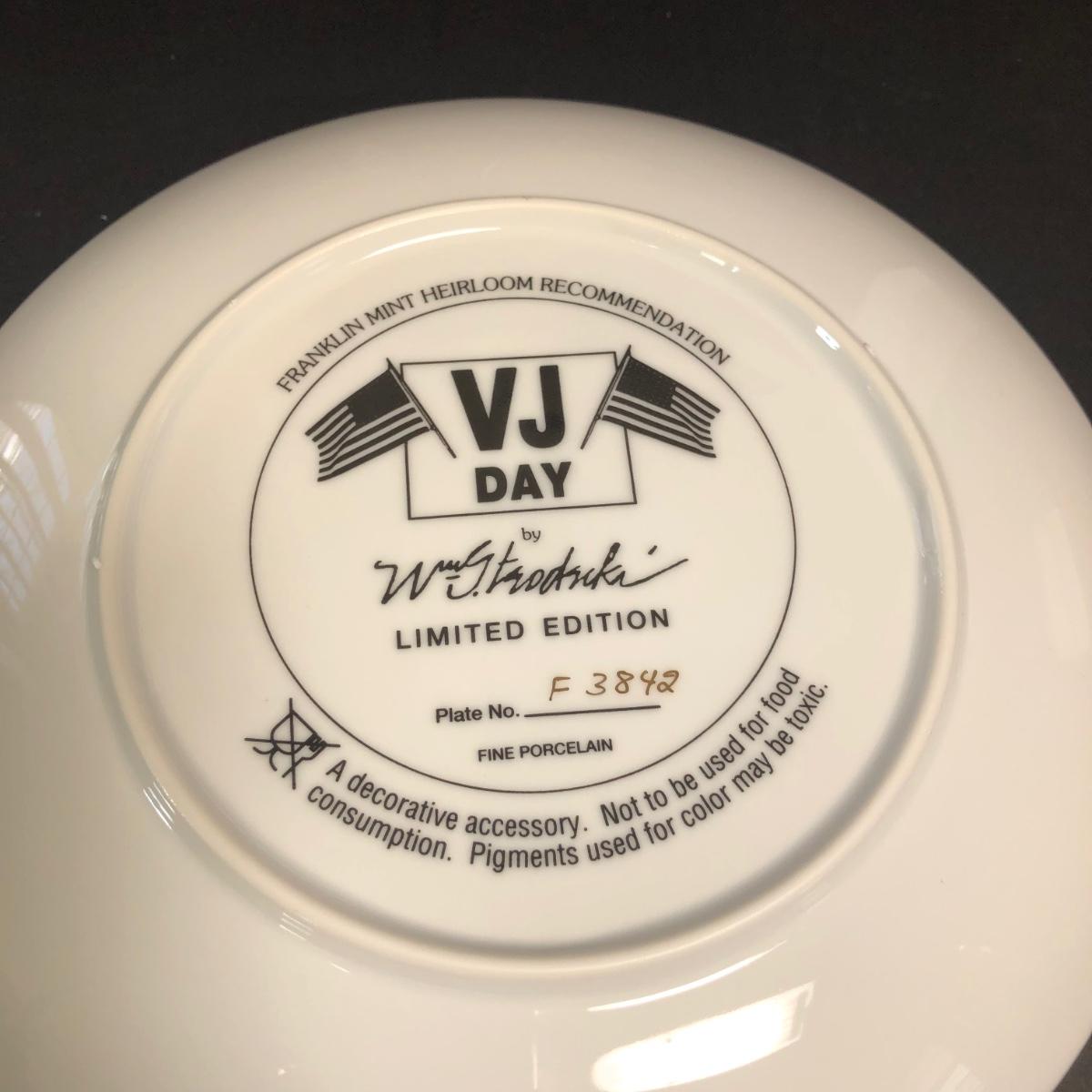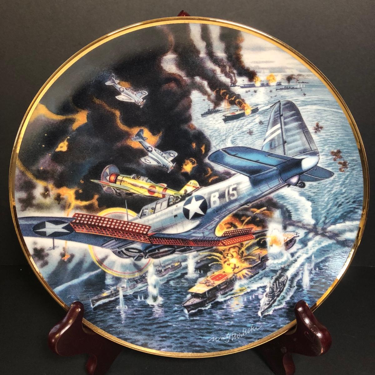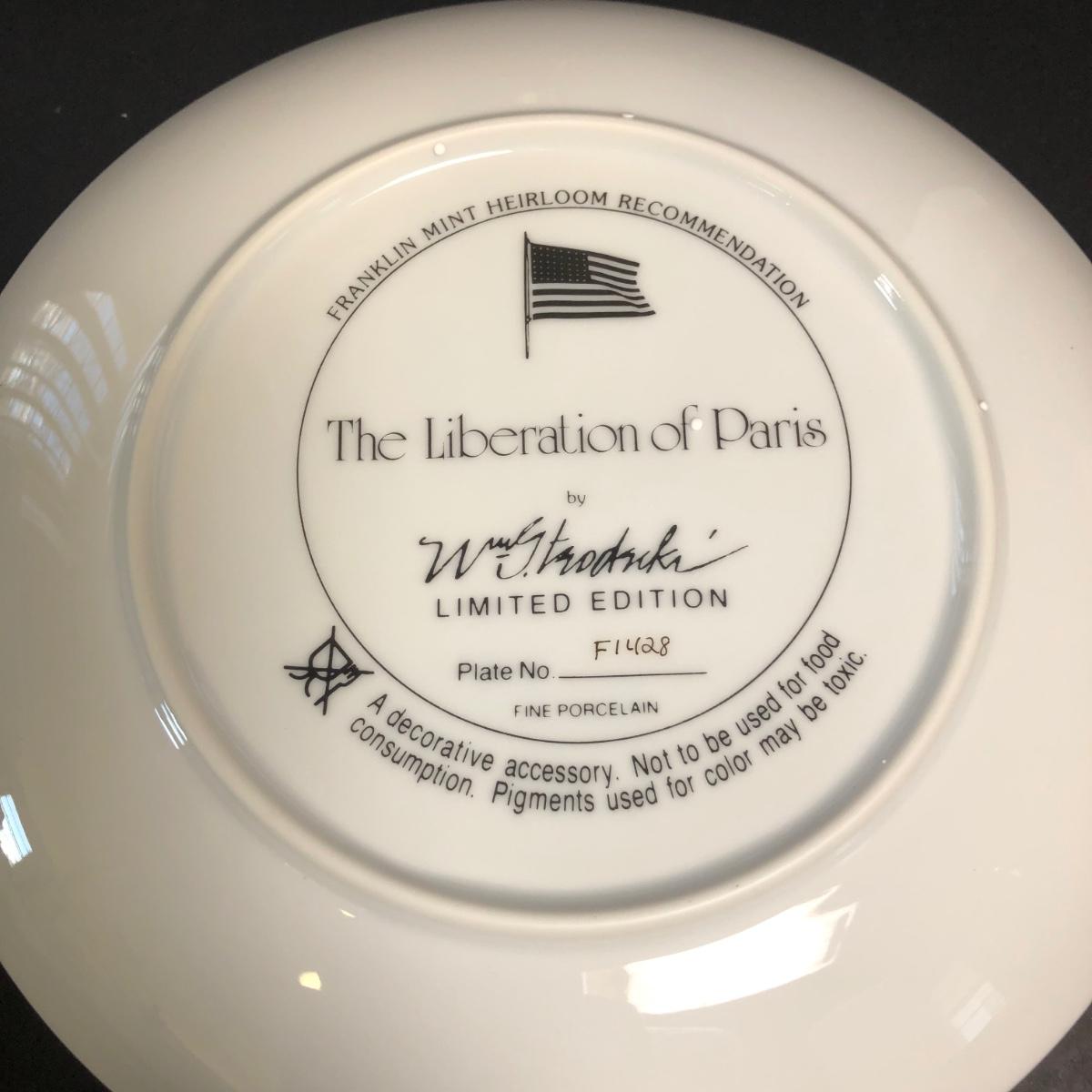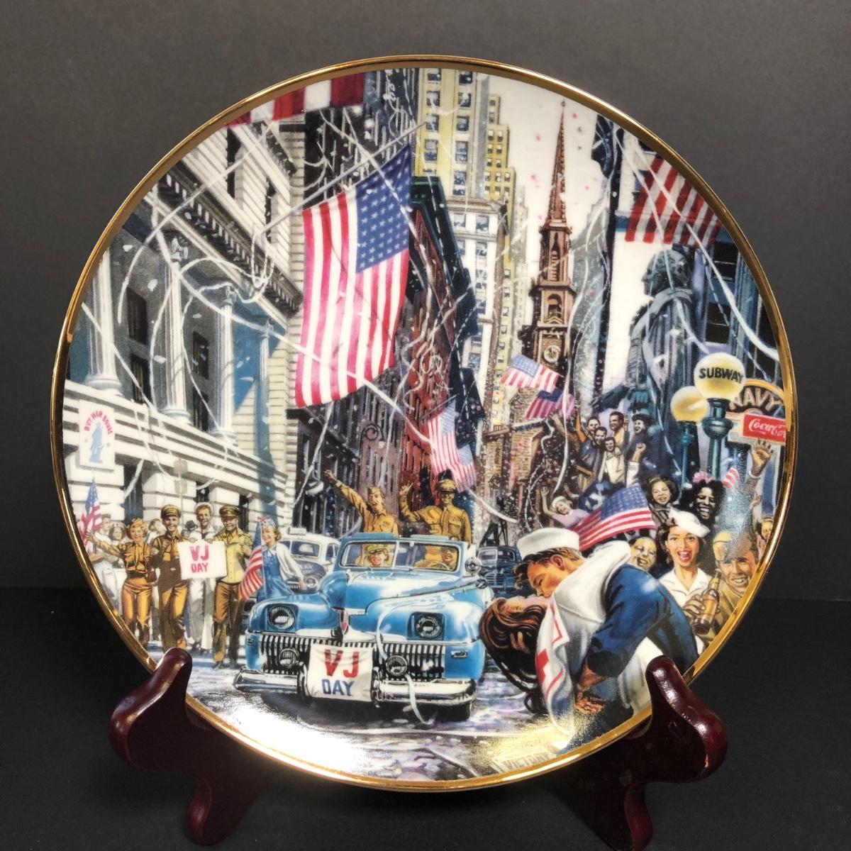 Includes six plates in Styrofoam containers. Limited edition porcelain plates depict the Battle of Midway, Raising of the Flag on Iwo Jima, The Liberation of Paris, The Battle of Britain, Storming the Beaches of Normandy, and VJ Day.