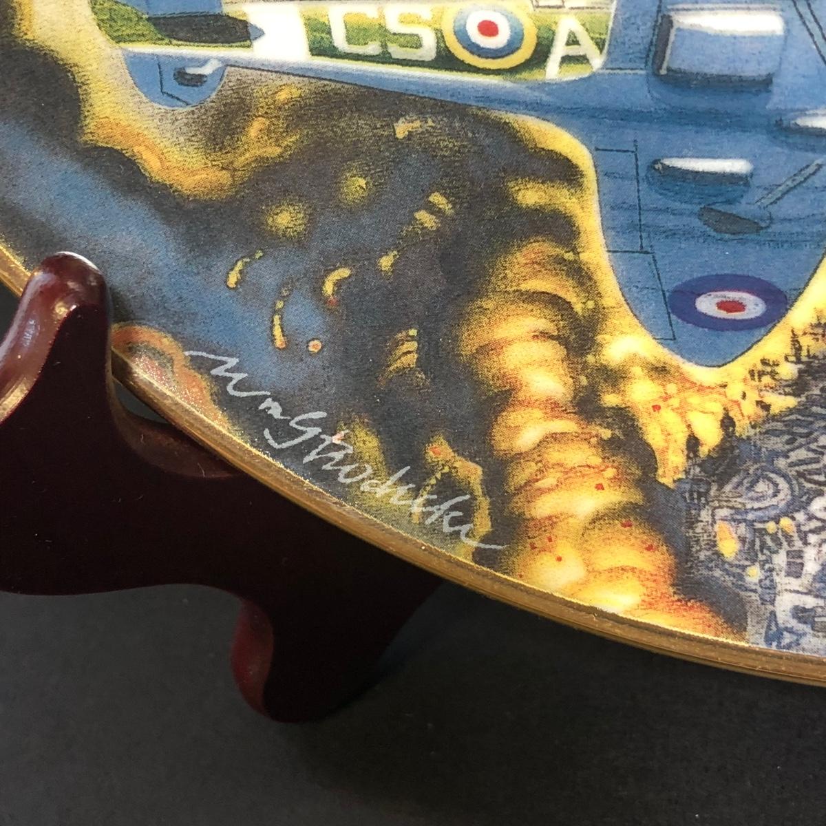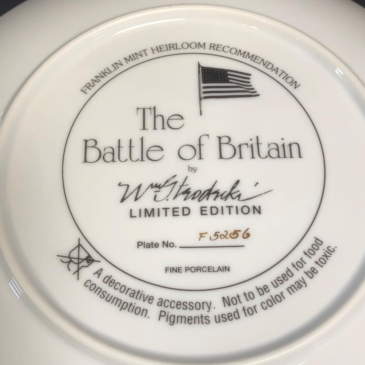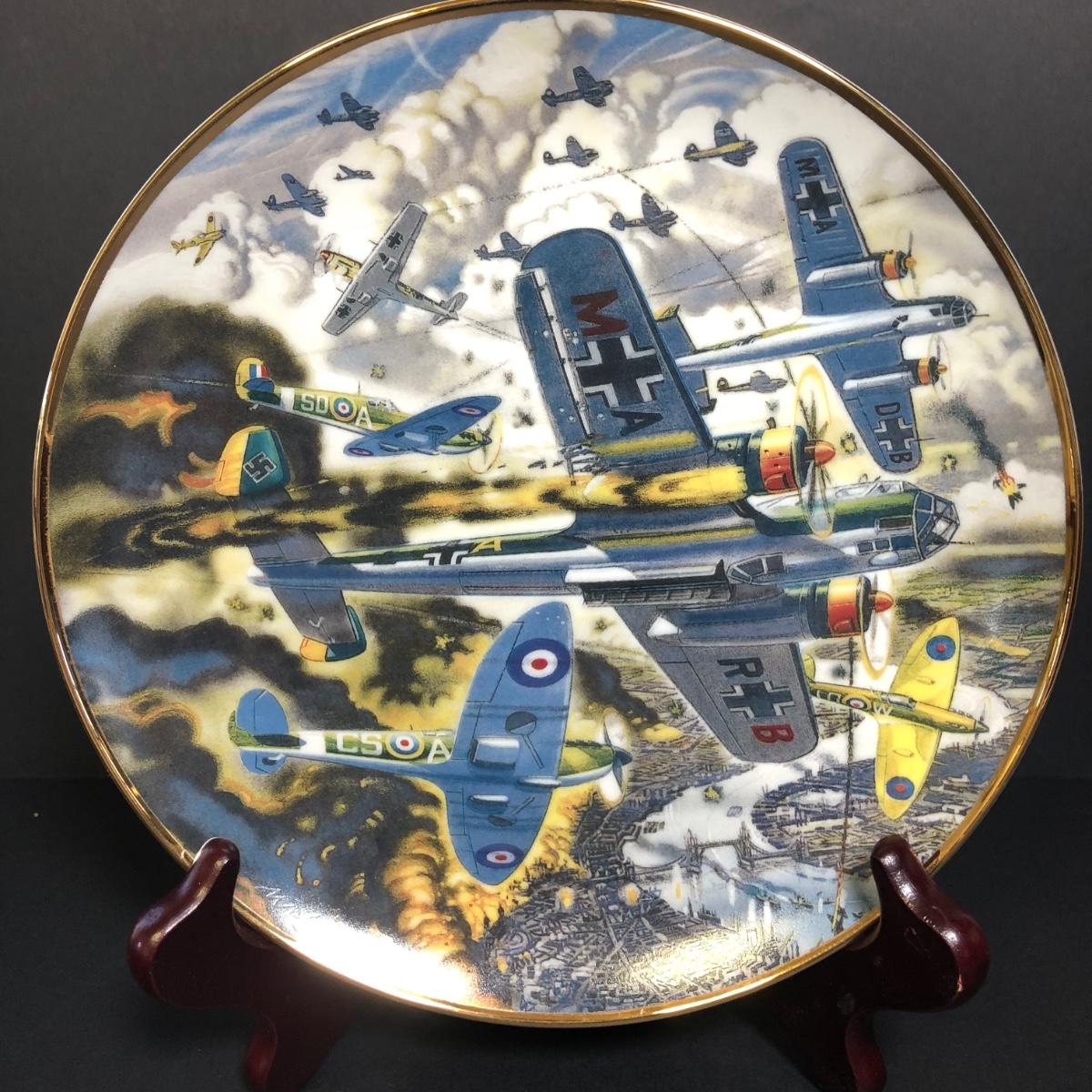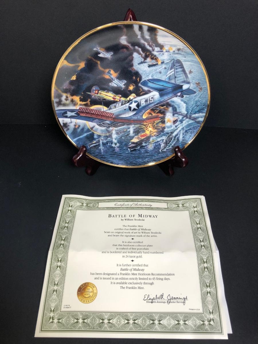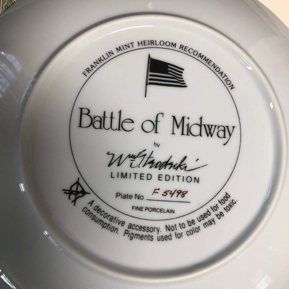 Includes six plates in Styrofoam containers. Limited edition porcelain plates depict the Battle of Midway, Raising of the Flag on Iwo Jima, The Liberation of Paris, The Battle of Britain, Storming the Beaches of Normandy, and VJ Day.