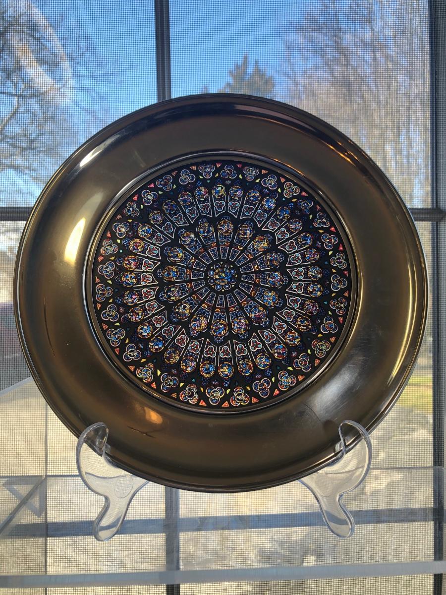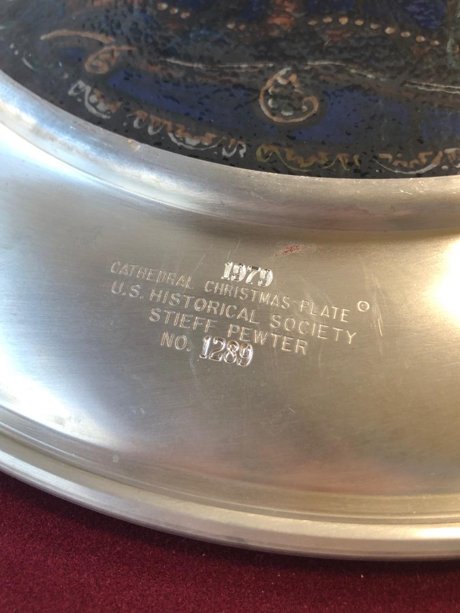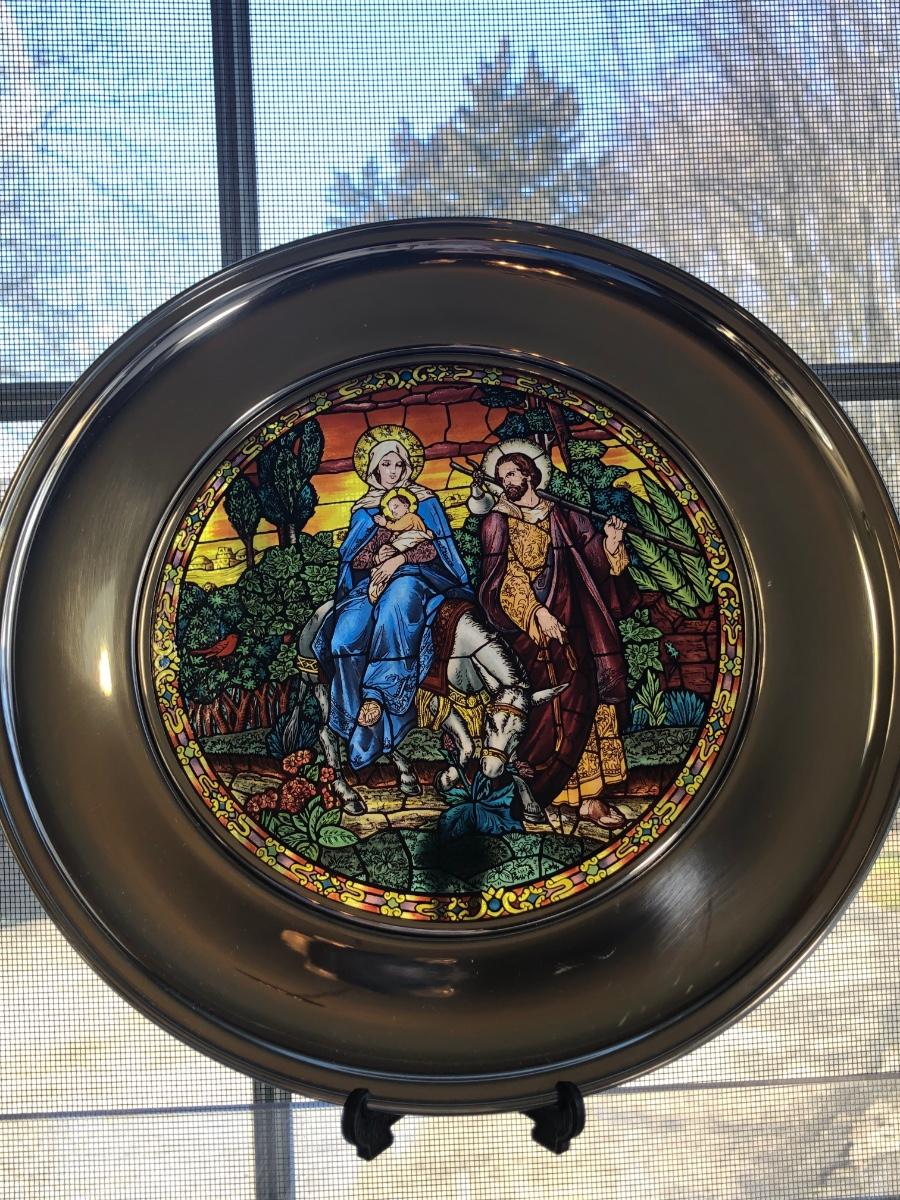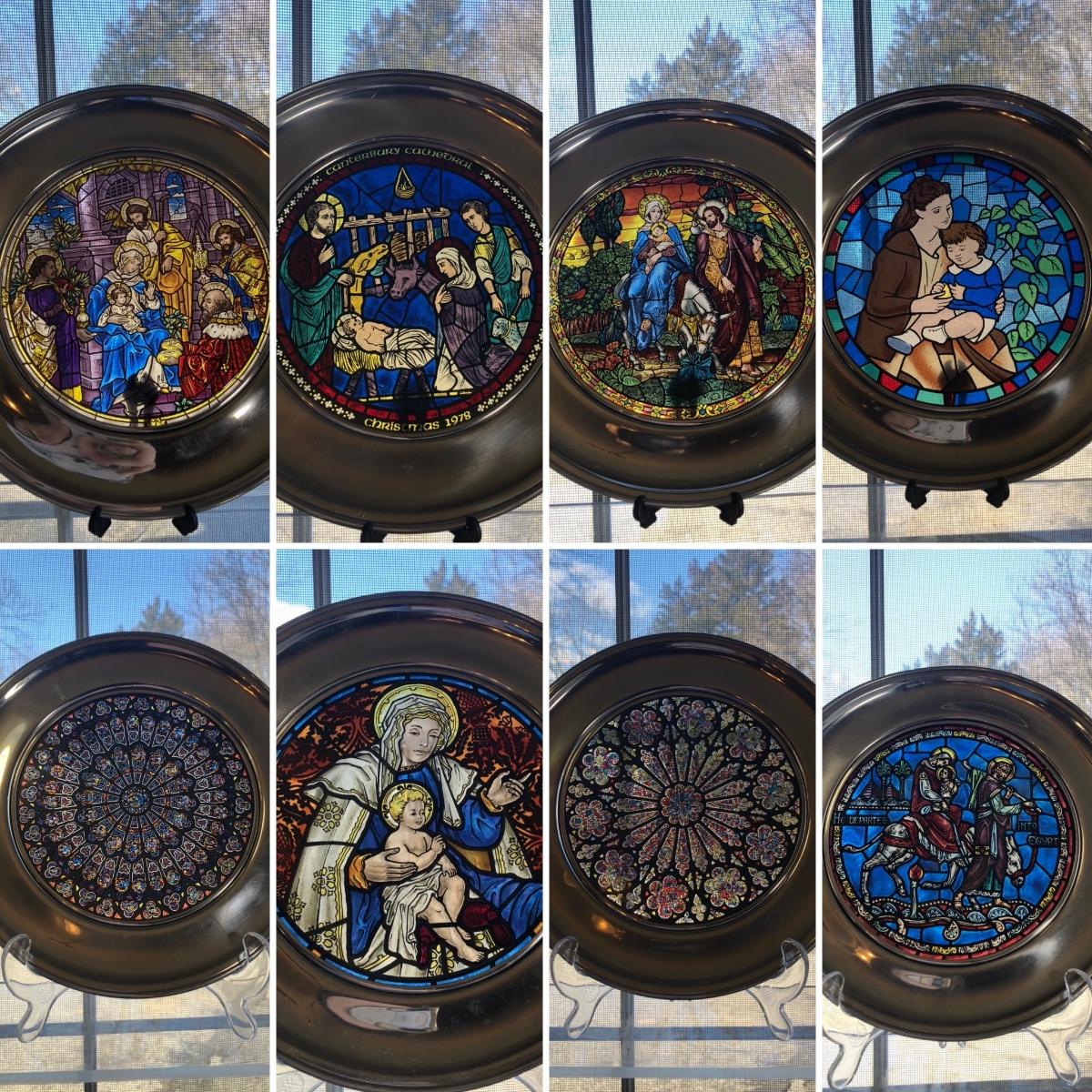 Eight 9.5 inch stained glass & pewter plates depicting different scenes and designs. All include their boxes.