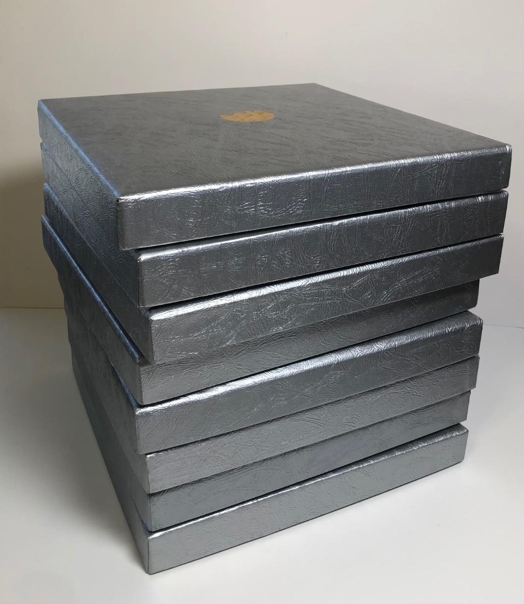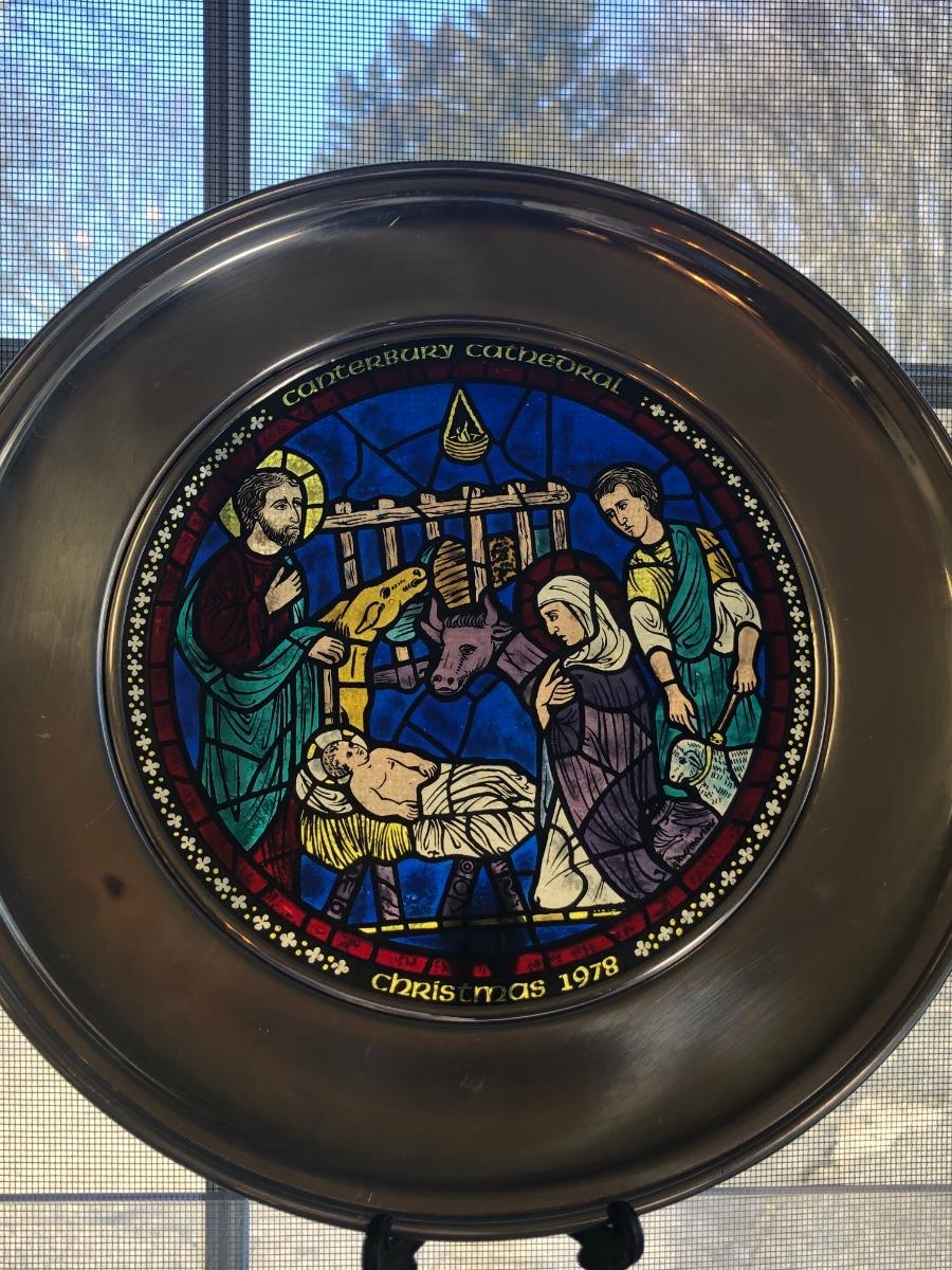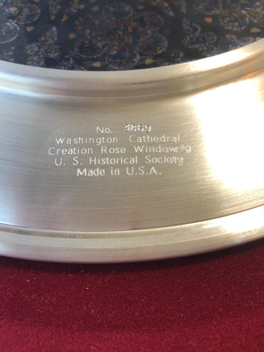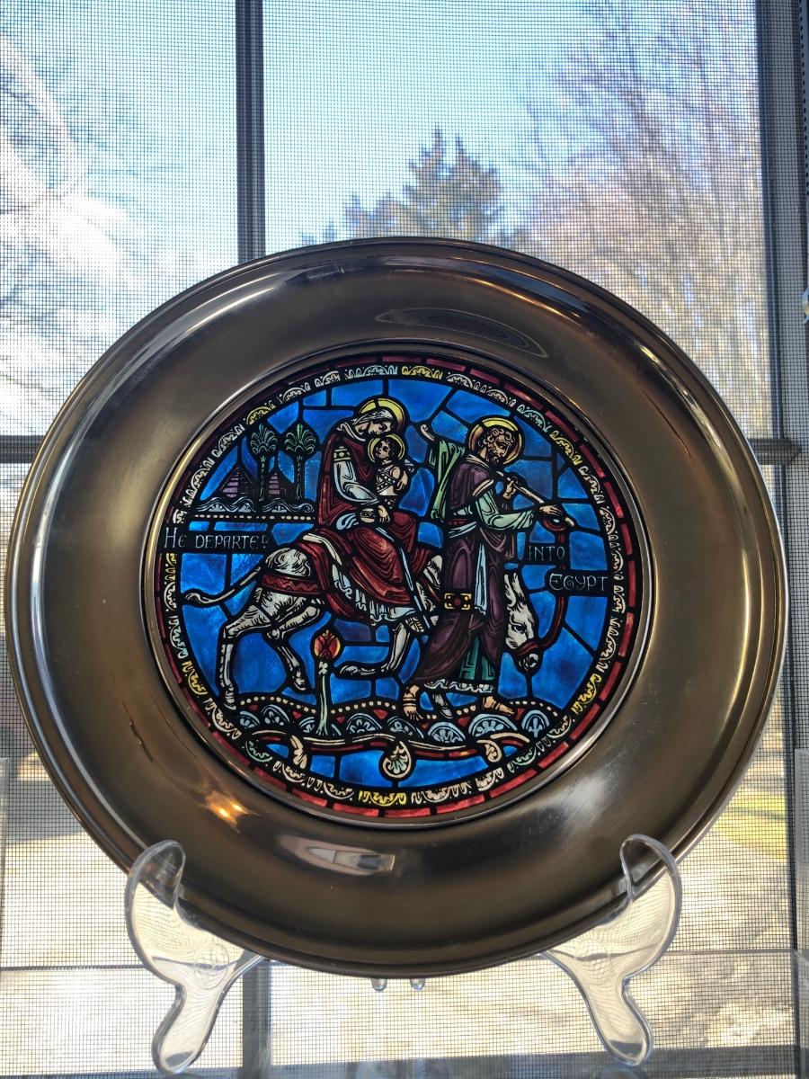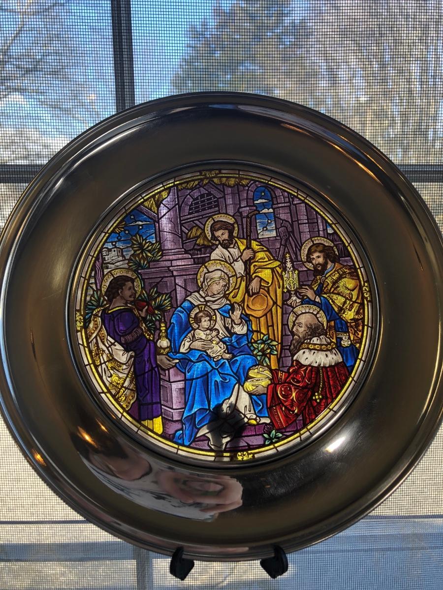 Eight 9.5 inch stained glass & pewter plates depicting different scenes and designs. All include their boxes.