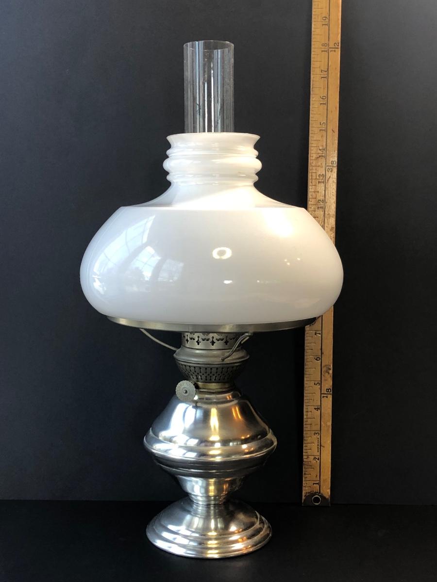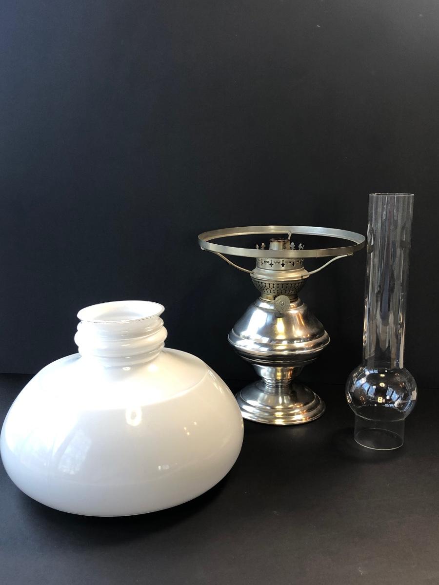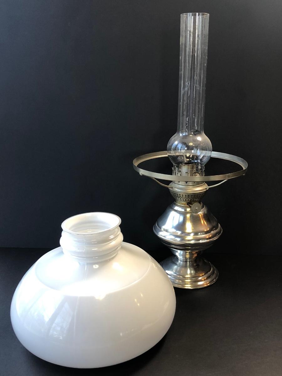 One hurricane style oil lamp. Clear glass is chipped slightly at the top (see photos).