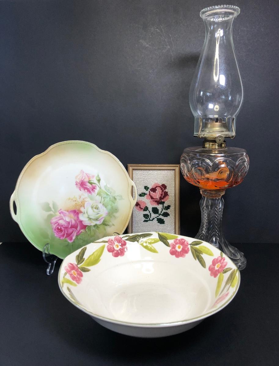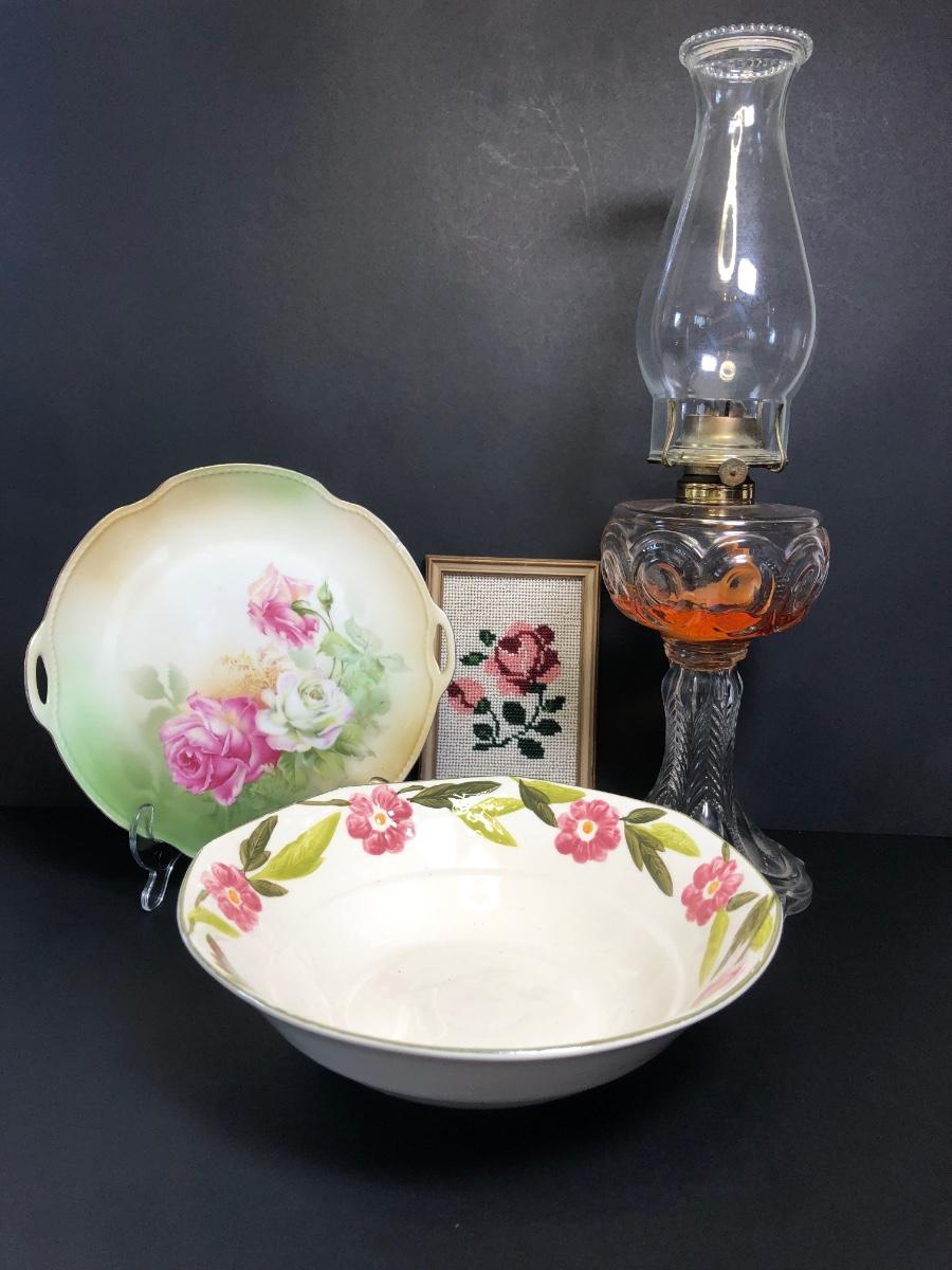 LOT105M: Hurricane Style Oil Lamp, Georgean Group Flower Bowl & More