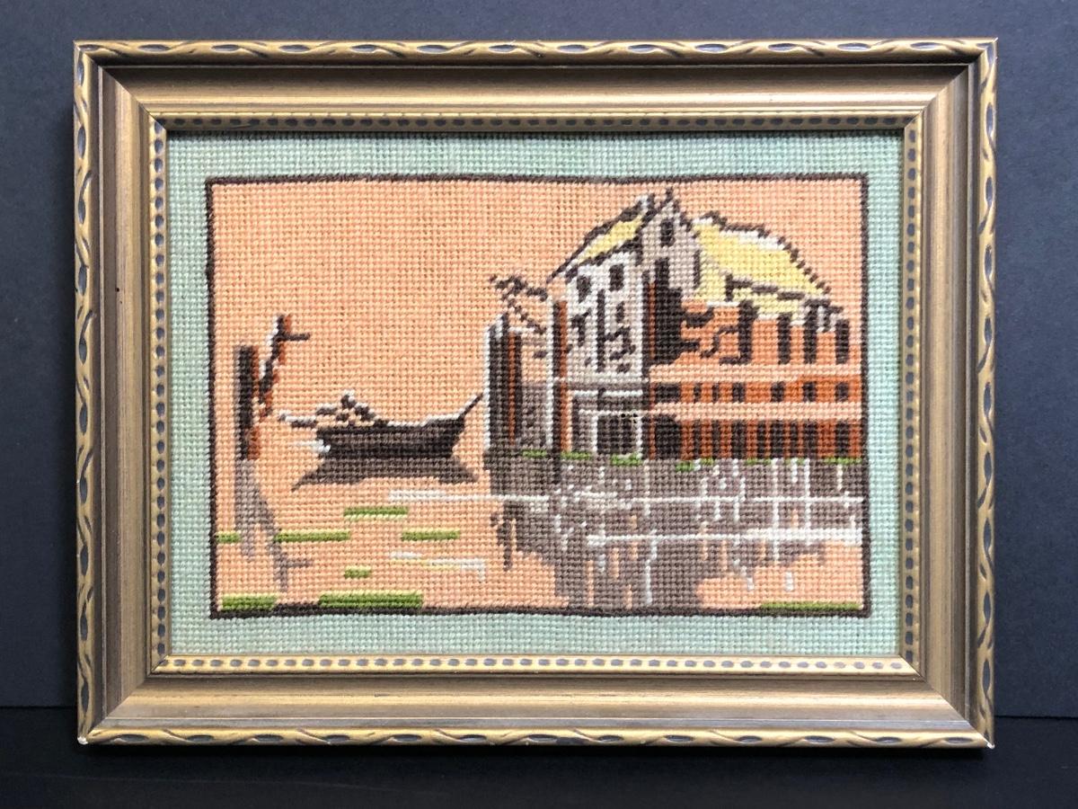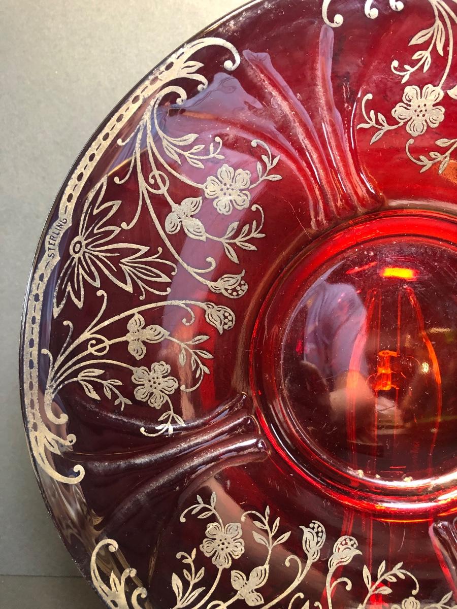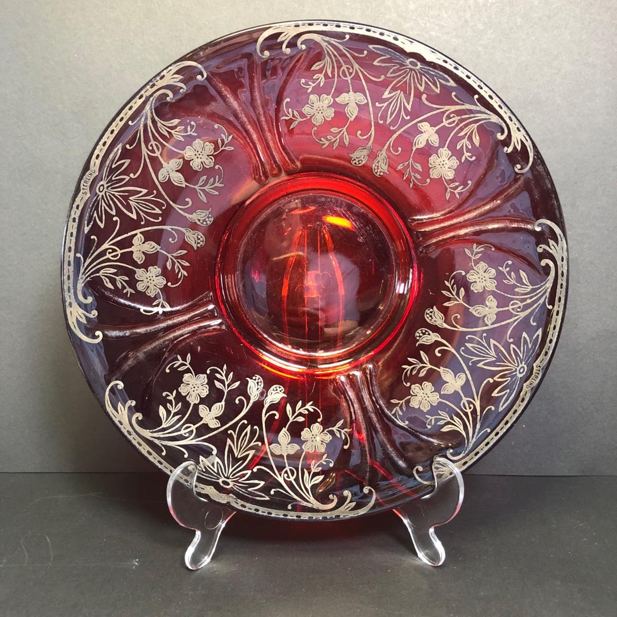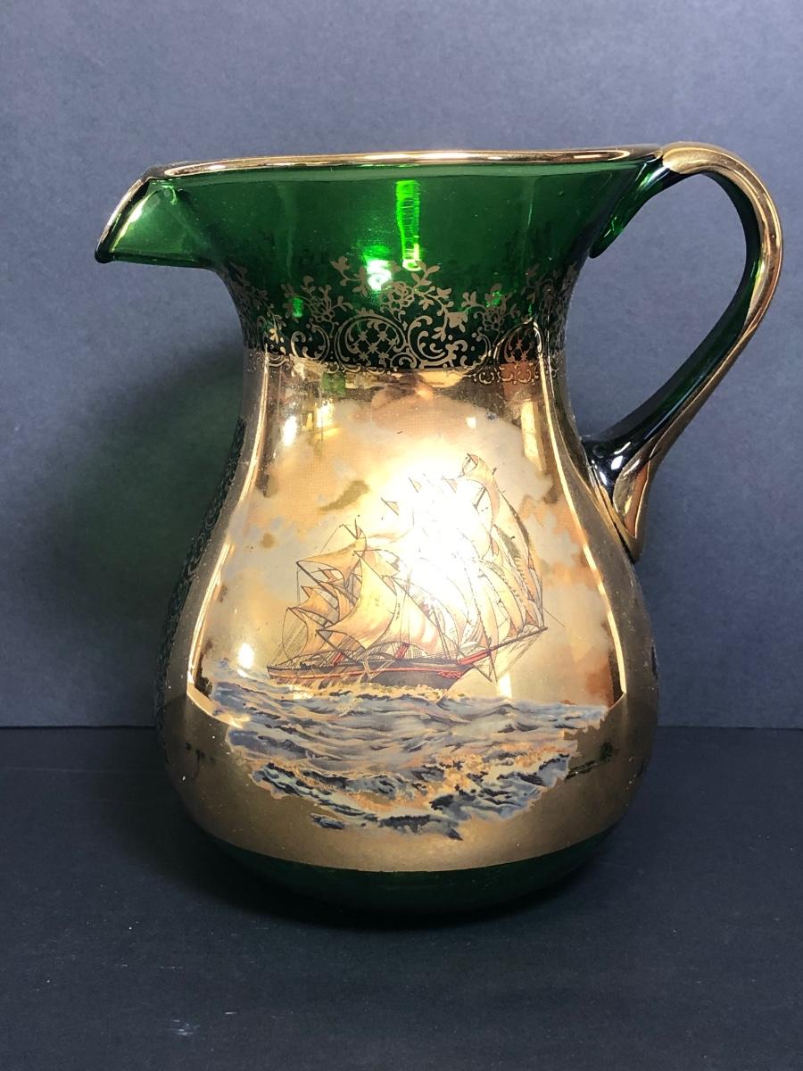 Six small red glass plates, one large plate, a green glass pitcher with a ship, two green glass cups and a beaded picture of a harbor.