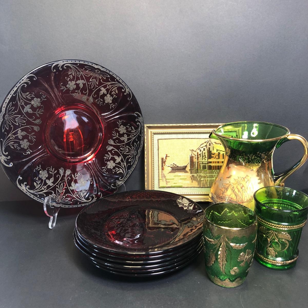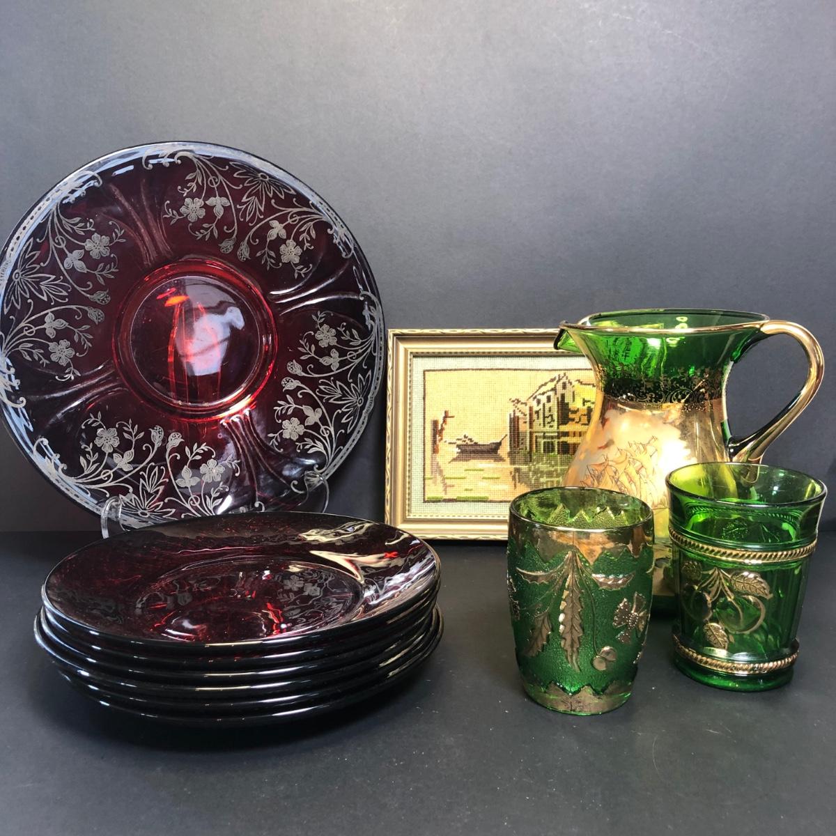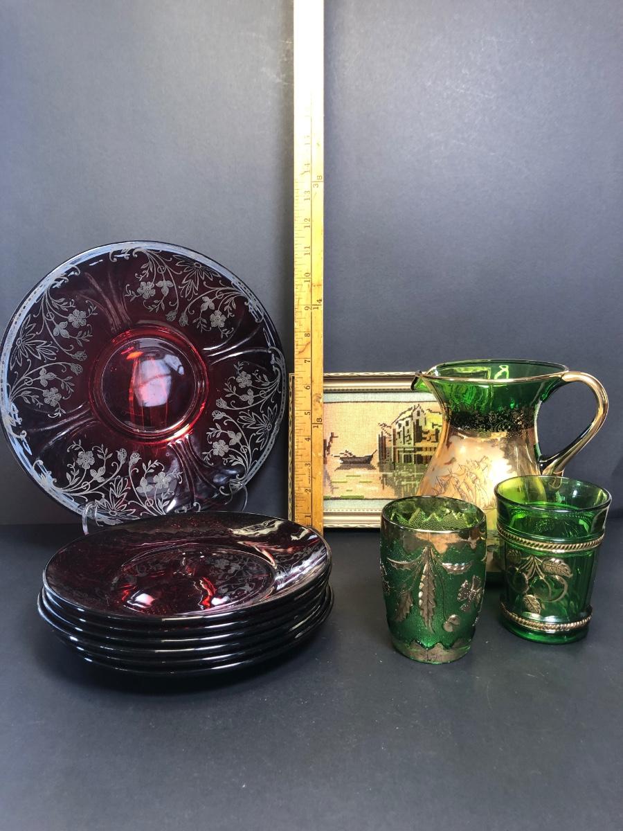 LOT106M: Red Glass Plates, Framed Harbor Picture, Green Glass Pitcher & Cups