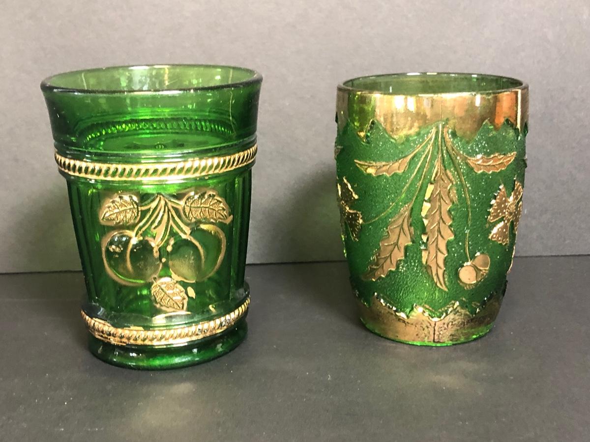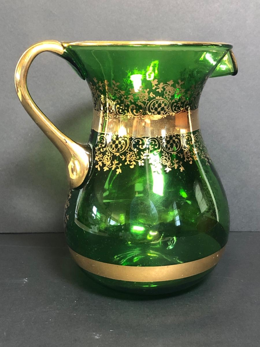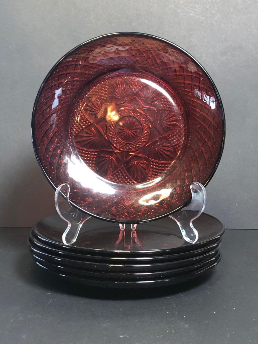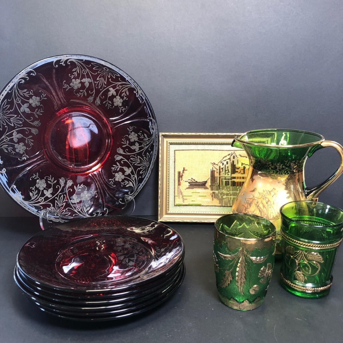 LOT106M: Red Glass Plates, Framed Harbor Picture, Green Glass Pitcher & Cups