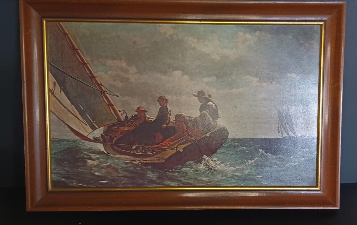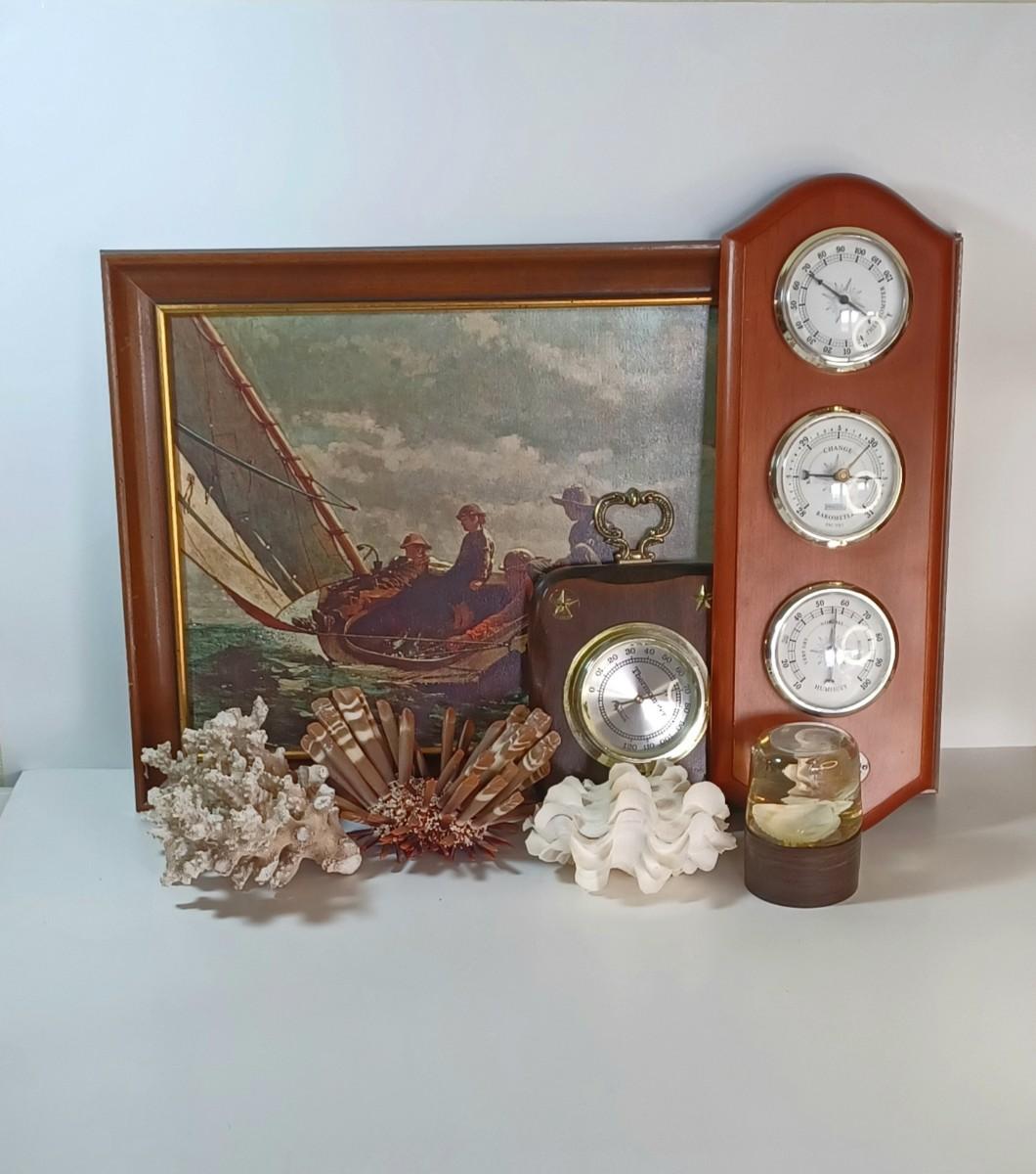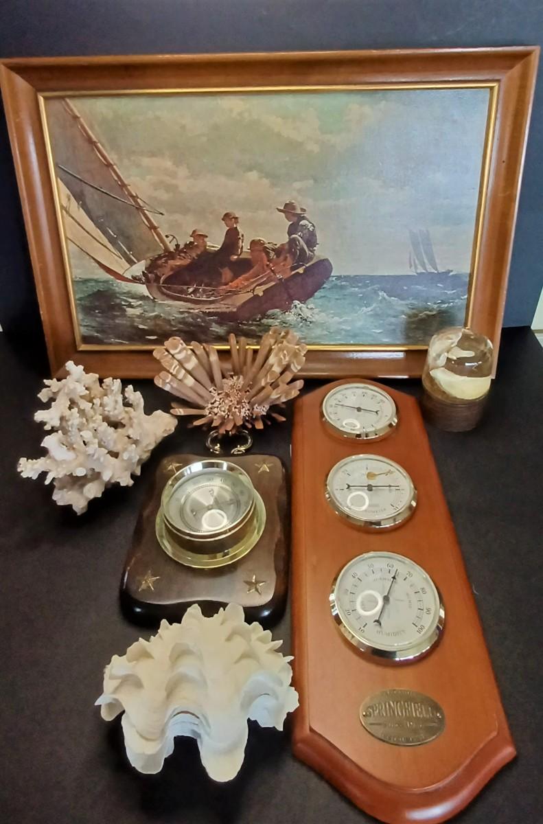 Framed Winslow Homer's "Breezing Up". Set of 4 different coral and shells. Springfield weather station with instructuction. Wooden wall mounting thermometer.