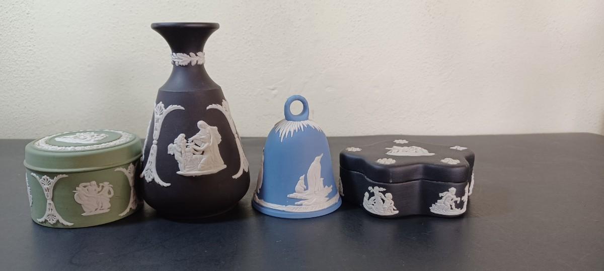 Different colored wedgewood pieces. 2pc Black,. 1 Green, 1 Purple, 6pcs Blue.
