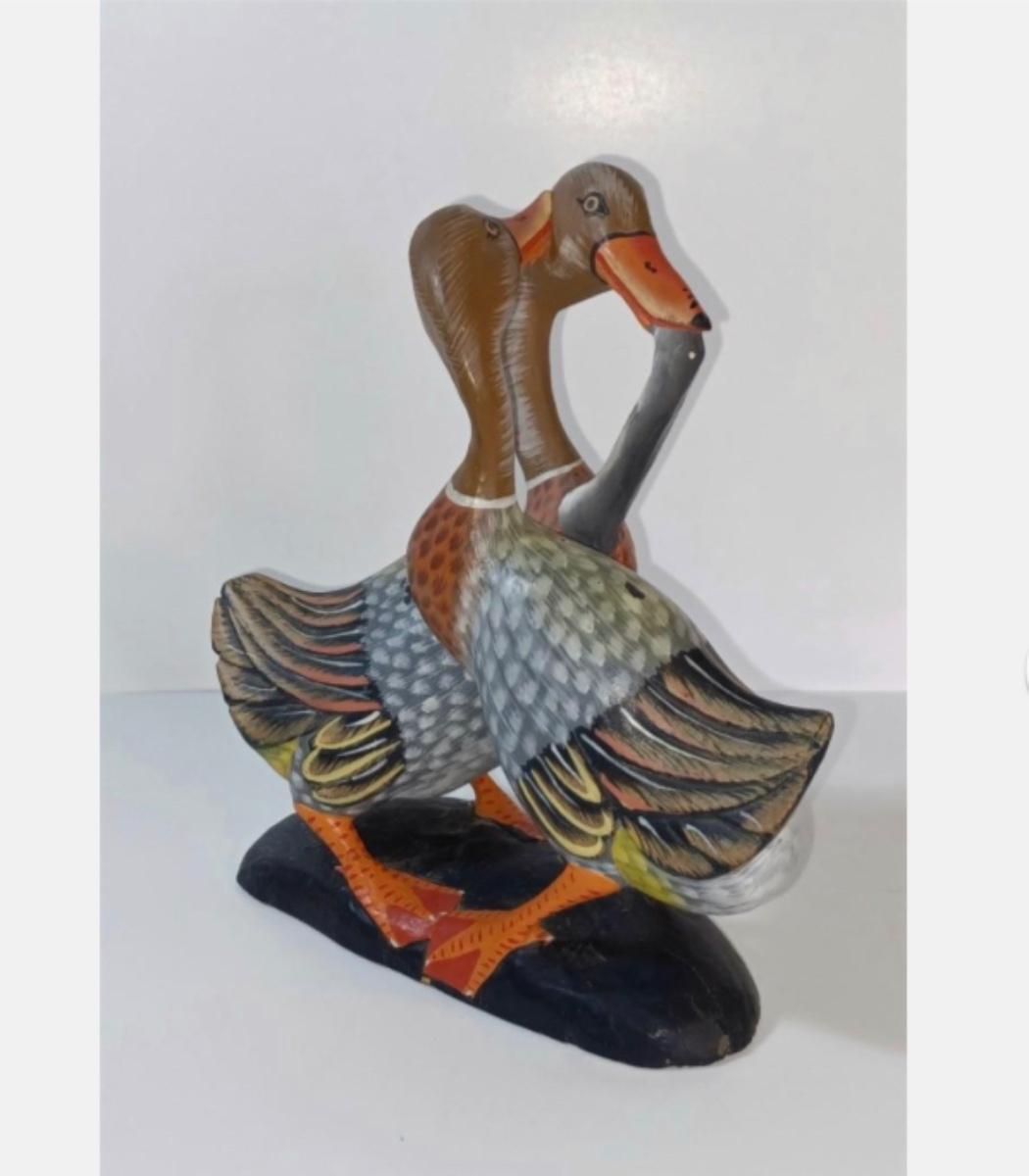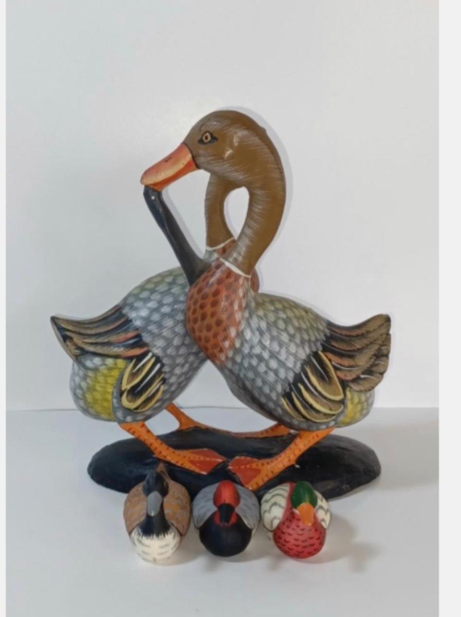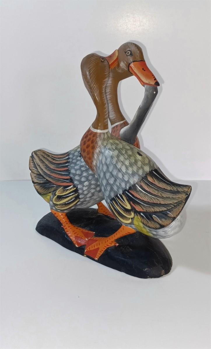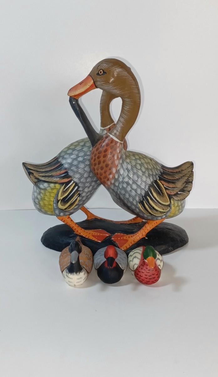 Set of decorative wooden ducks. Large wooden statue of two ducks cleaning each other. Two smaller ducks and a ornamental goose.