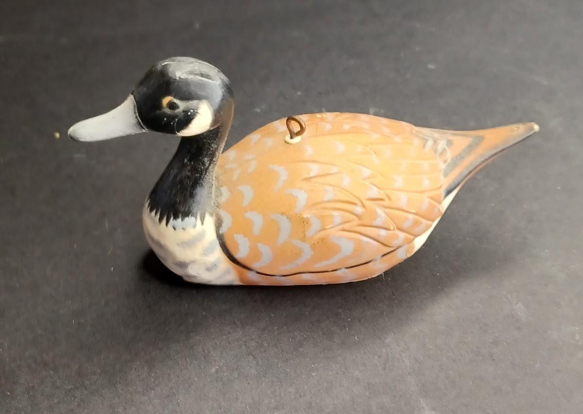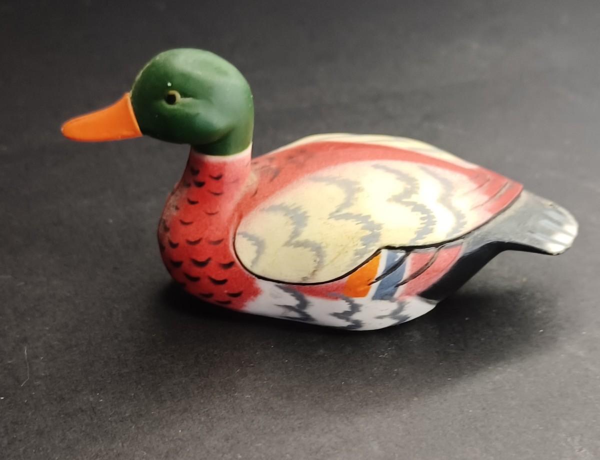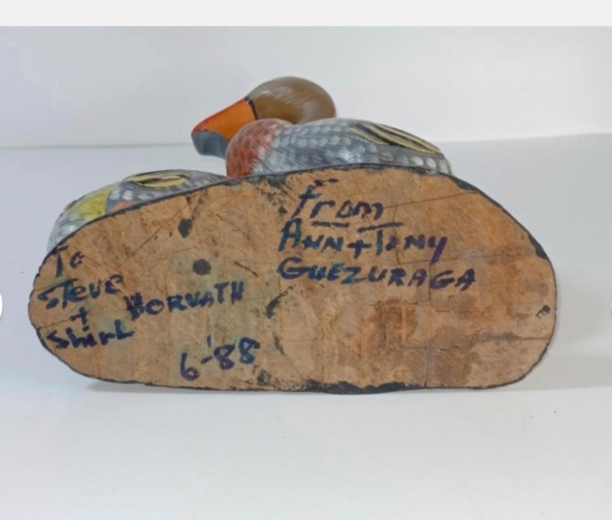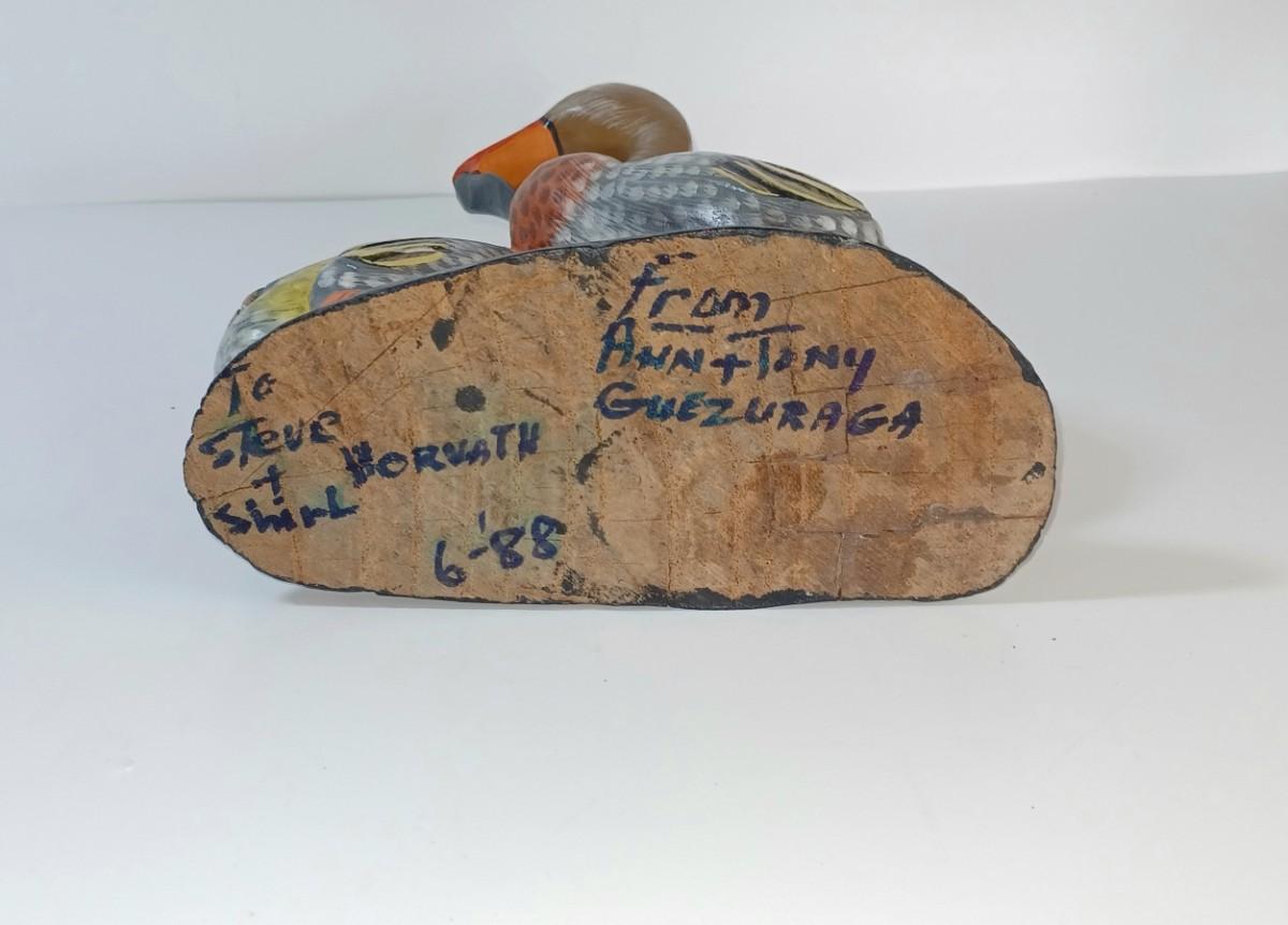 Set of decorative wooden ducks. Large wooden statue of two ducks cleaning each other. Two smaller ducks and a ornamental goose.