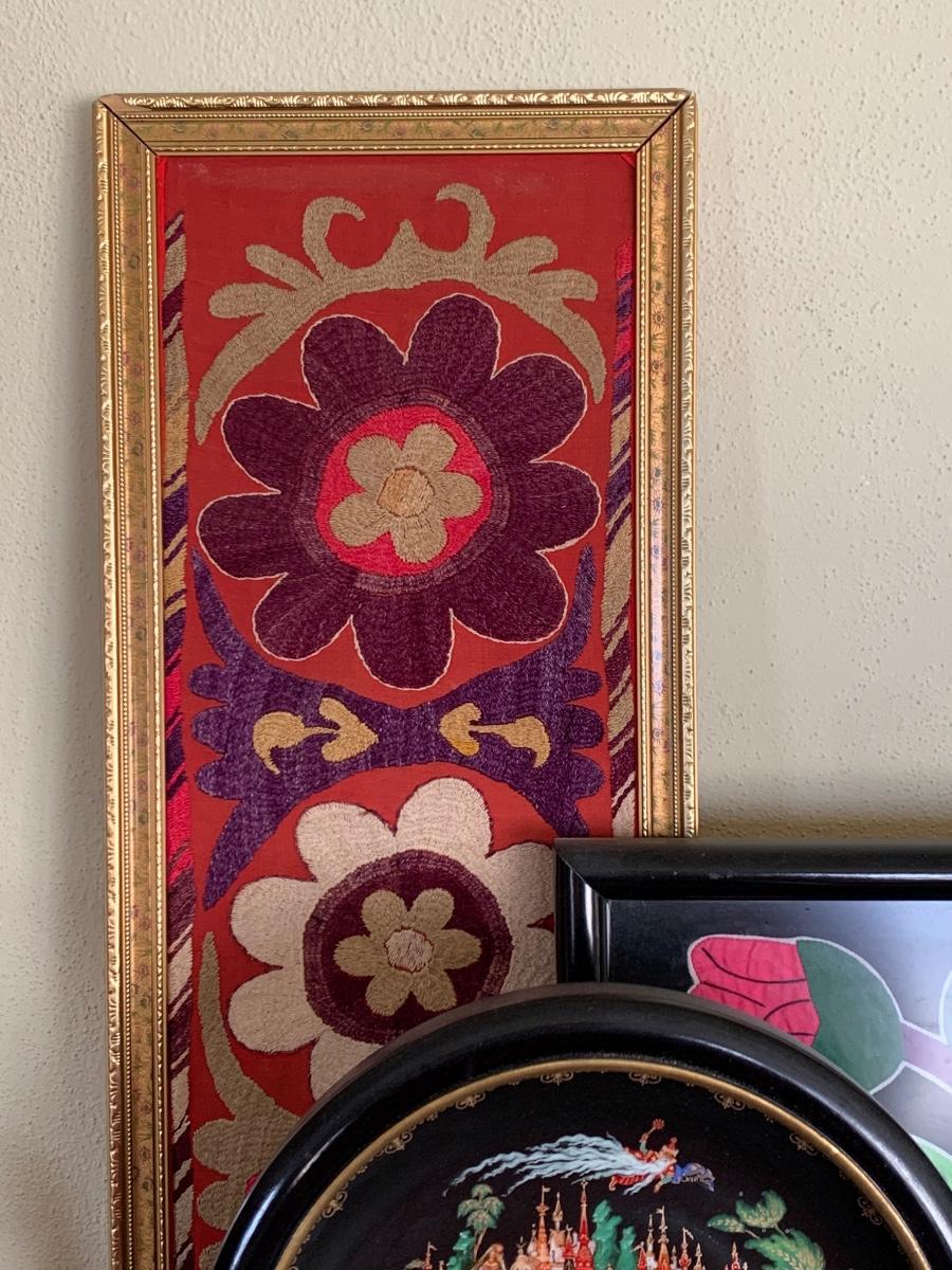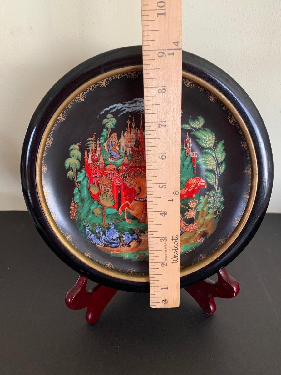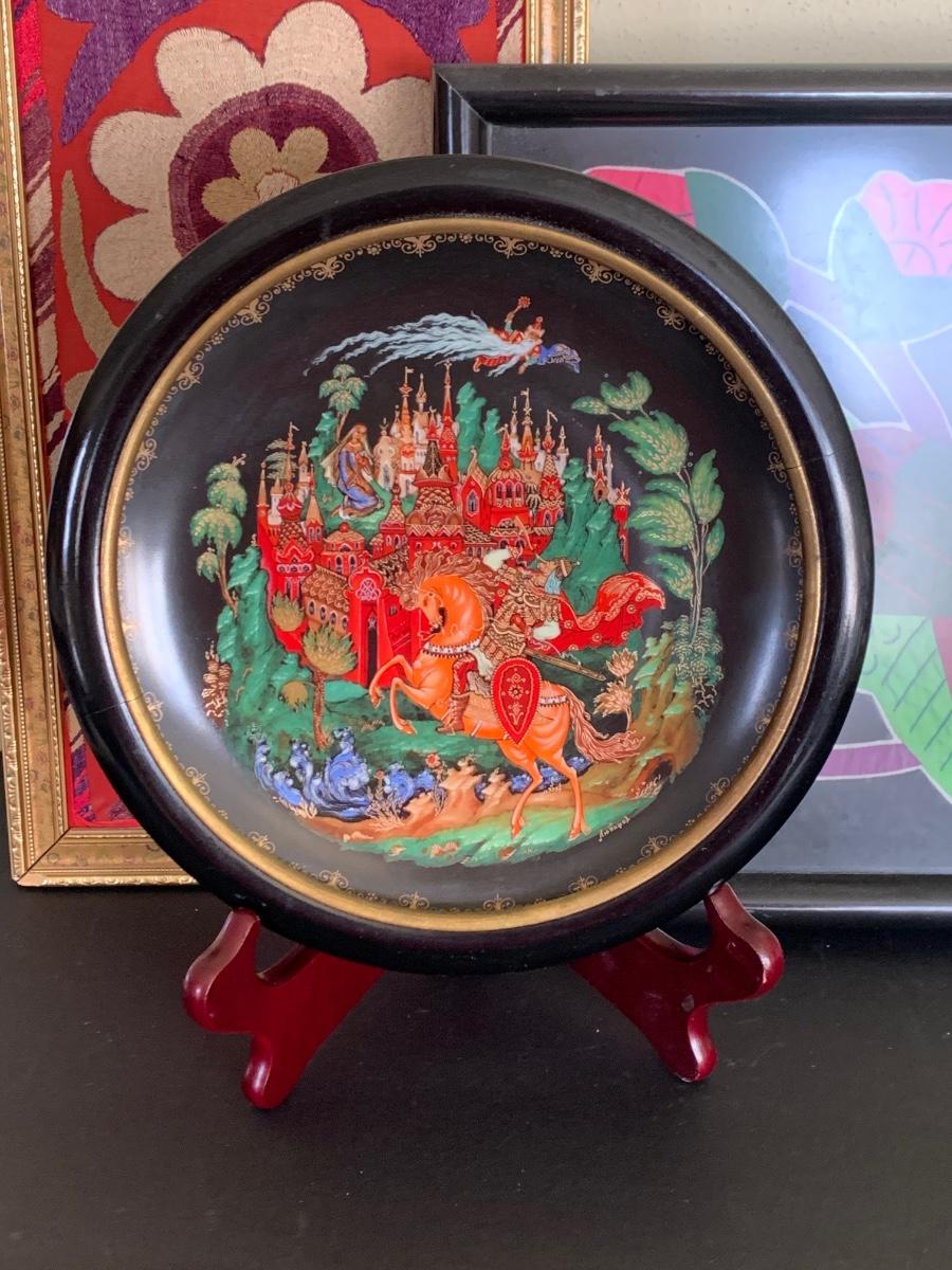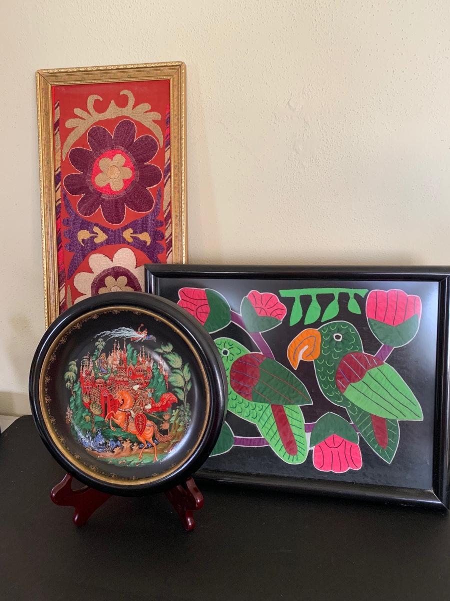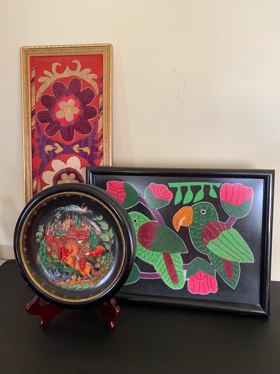 Framed tapestry into artwork, and collectible painted Russian plate. Please see all pictures as they are the best representation of the items. The pictures show condition, measurements if taken, and what is included in the lot. Due to the large amount that we photograph and the time frame, we are not always able to take measurements. All items unless noted, are pre-owned and have been used. If you purchased furniture, you must bring help. We do not allow one person to carry large furniture out on their own. Bring help, tools and a truck for the safety of our client’s homes, and your personal safety. Any damages that result to the property including walls, and floors due to moving of the furniture will be charged to the buyer. Company policy. Thank you.
