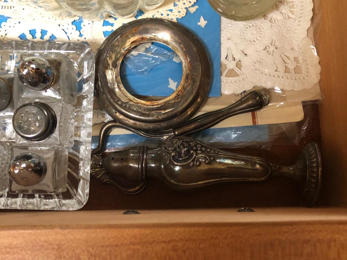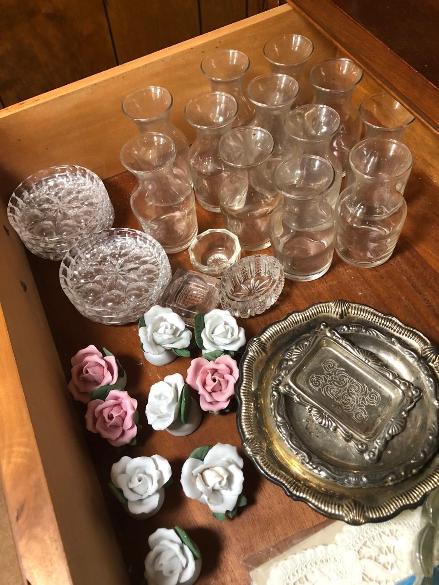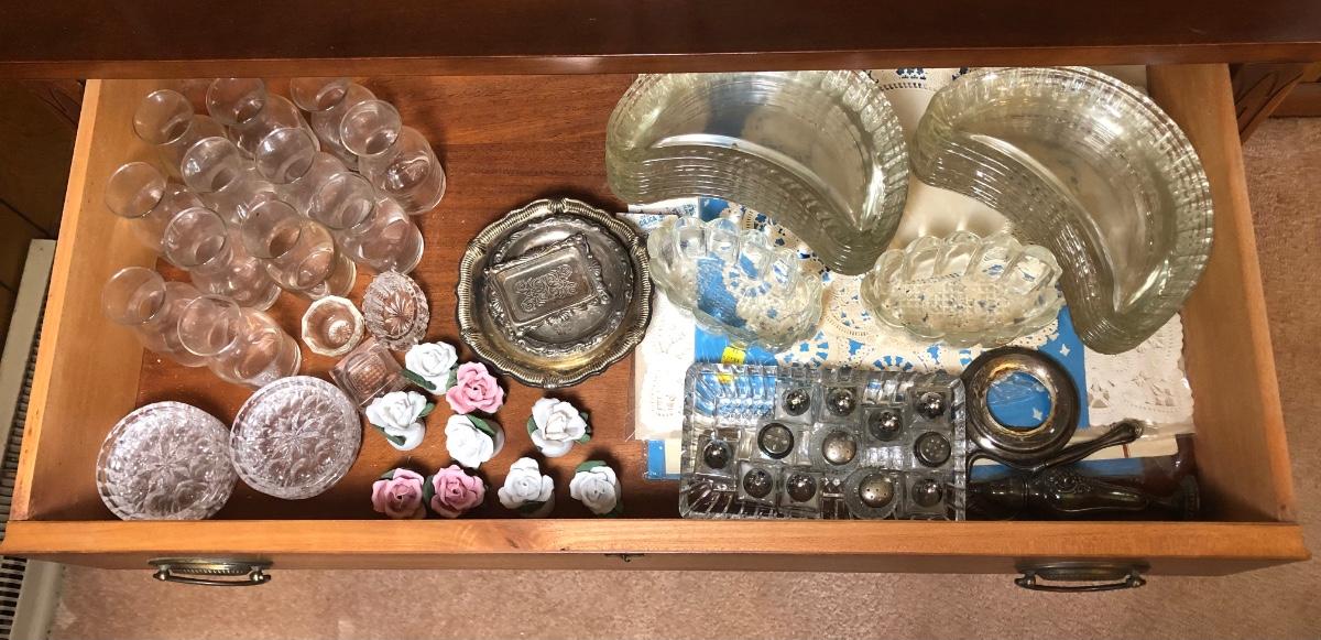 Includes the contents of the drawer and cabinet pictured in the photographs. Does not include furniture.