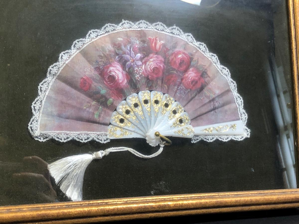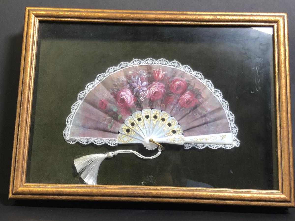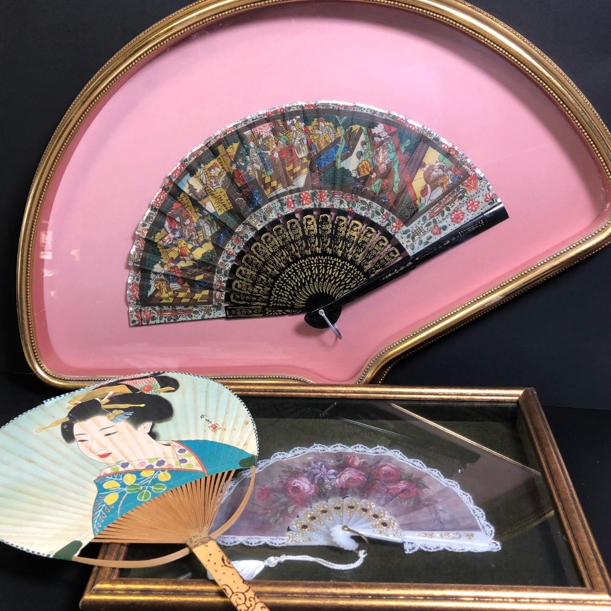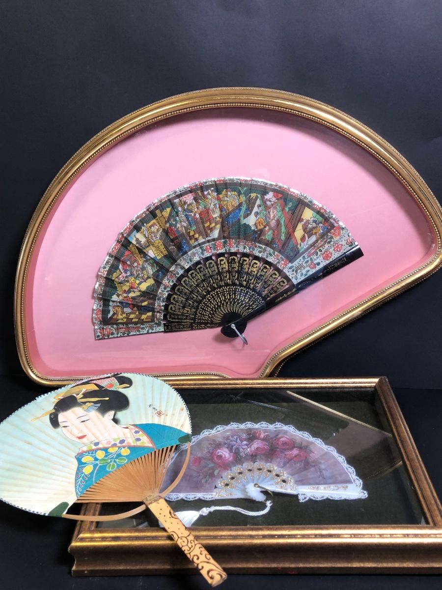 Includes two framed fans with elaborate designs and a beautiful paper fan that has small rip in it.