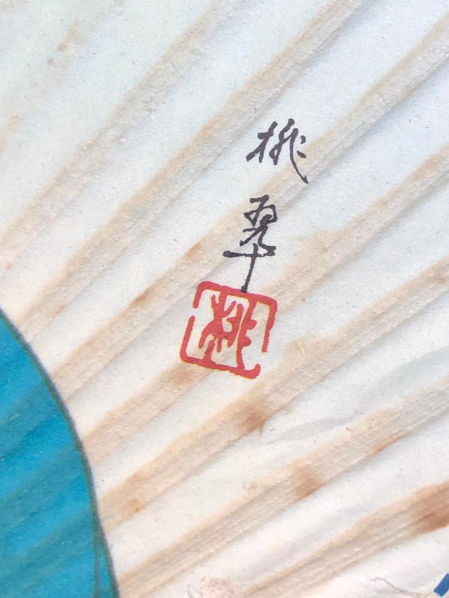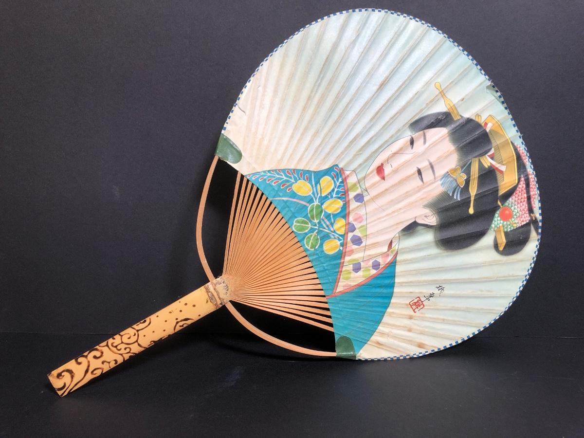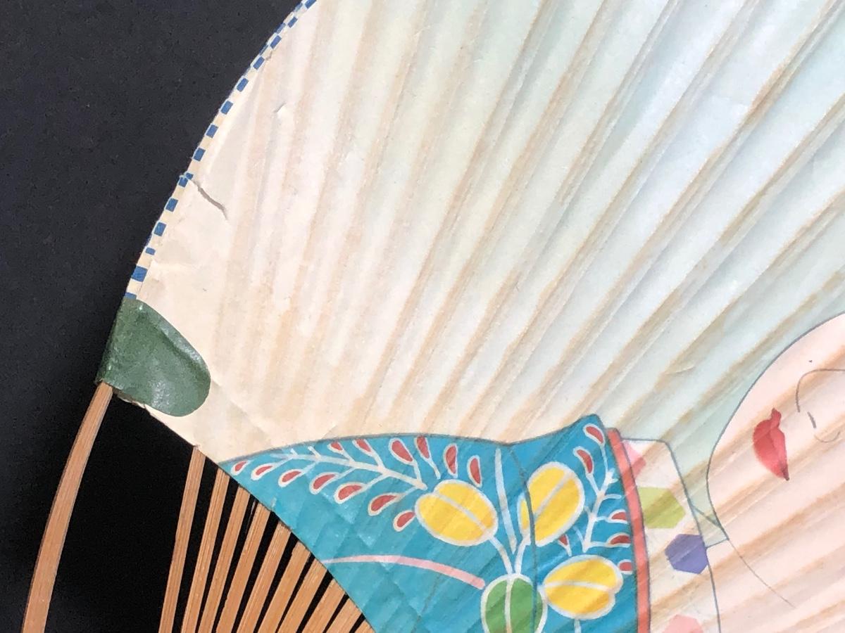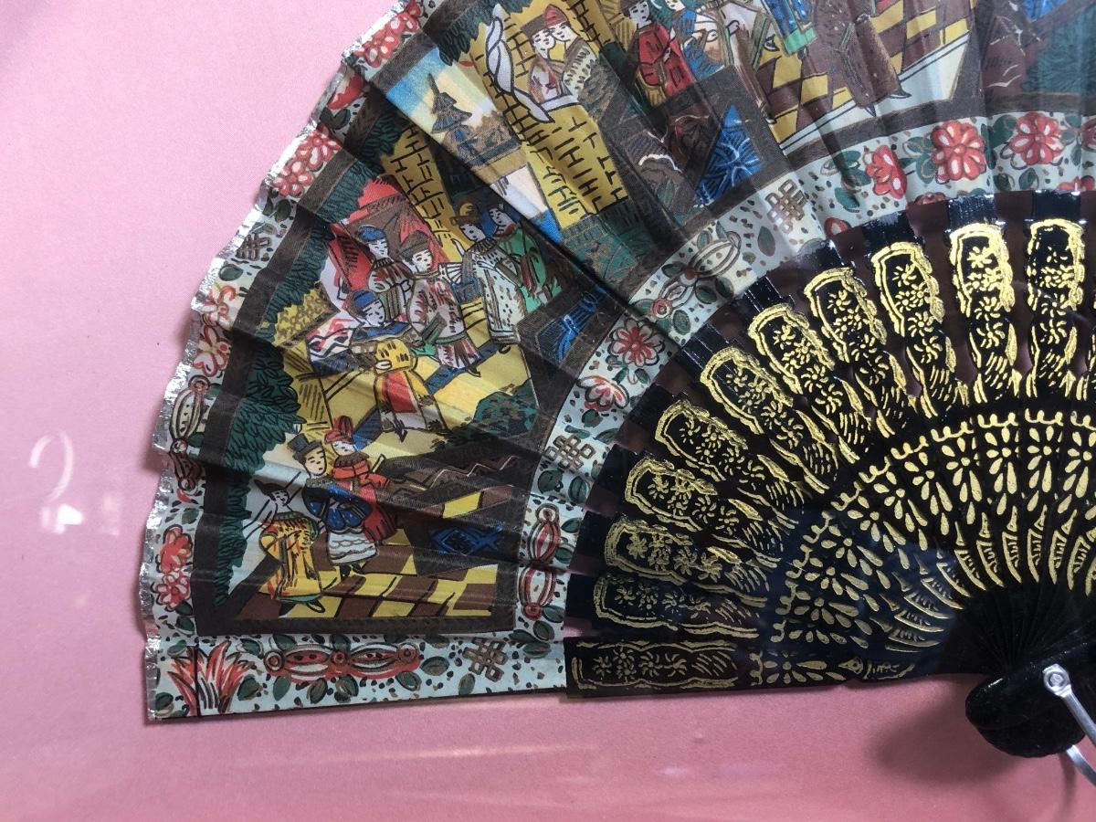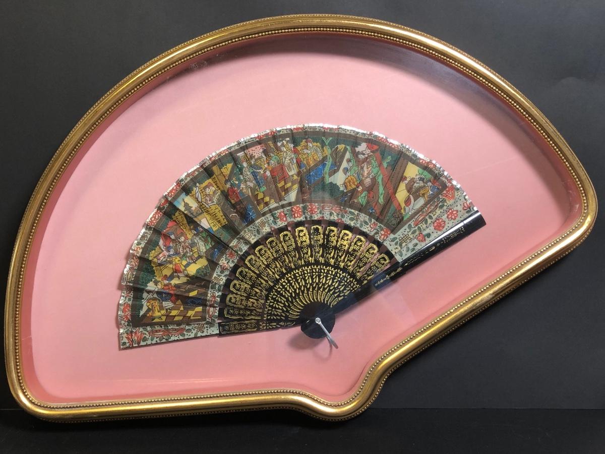 Includes two framed fans with elaborate designs and a beautiful paper fan that has small rip in it.