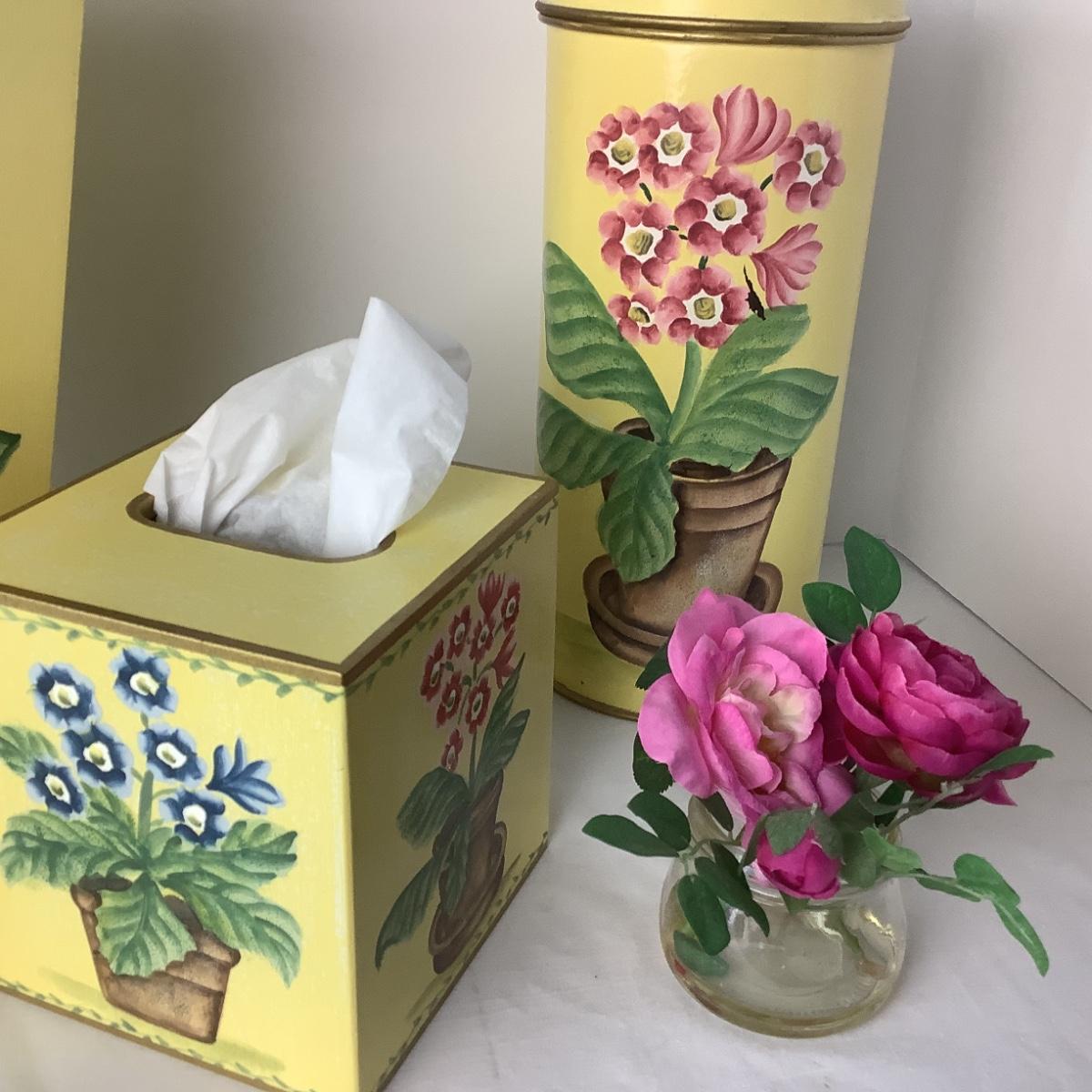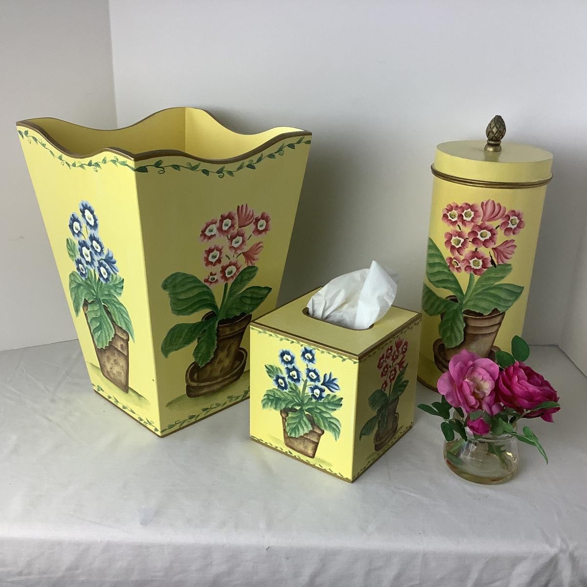 Lot. 8332. Handpainted Floral Waste Paper Basket, Tissue Box, and Canister Set