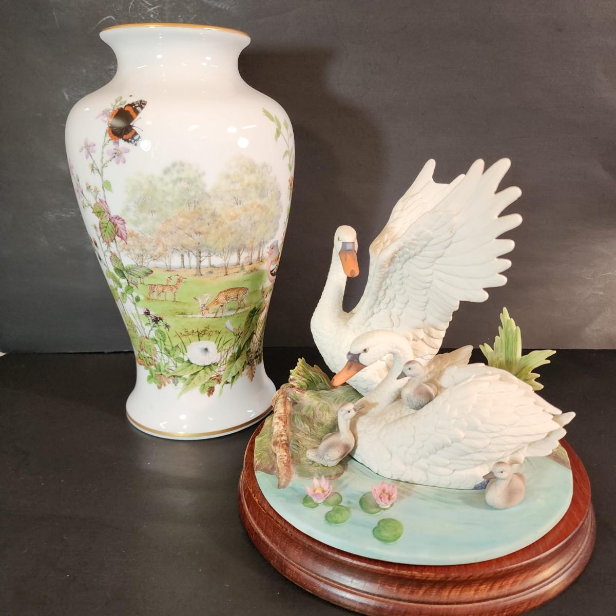 LOT 12:: Big and Beautiful-Mute Swan family by Andrea 10.25" H and Franklin Porcelain's Autumn Glen Vase by Peter Barrett Japan 12.5" H