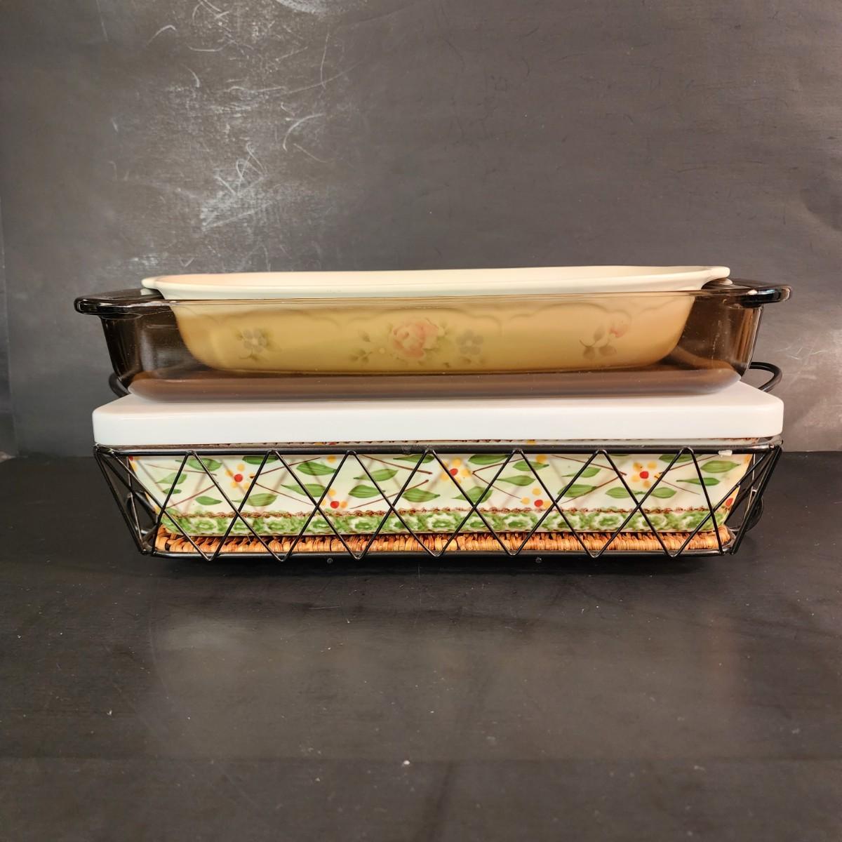 LOT 13:: Casserole Dishes- Temp-Tations by Tara with lid and caddy, Pfaltzgraff and Pyrex