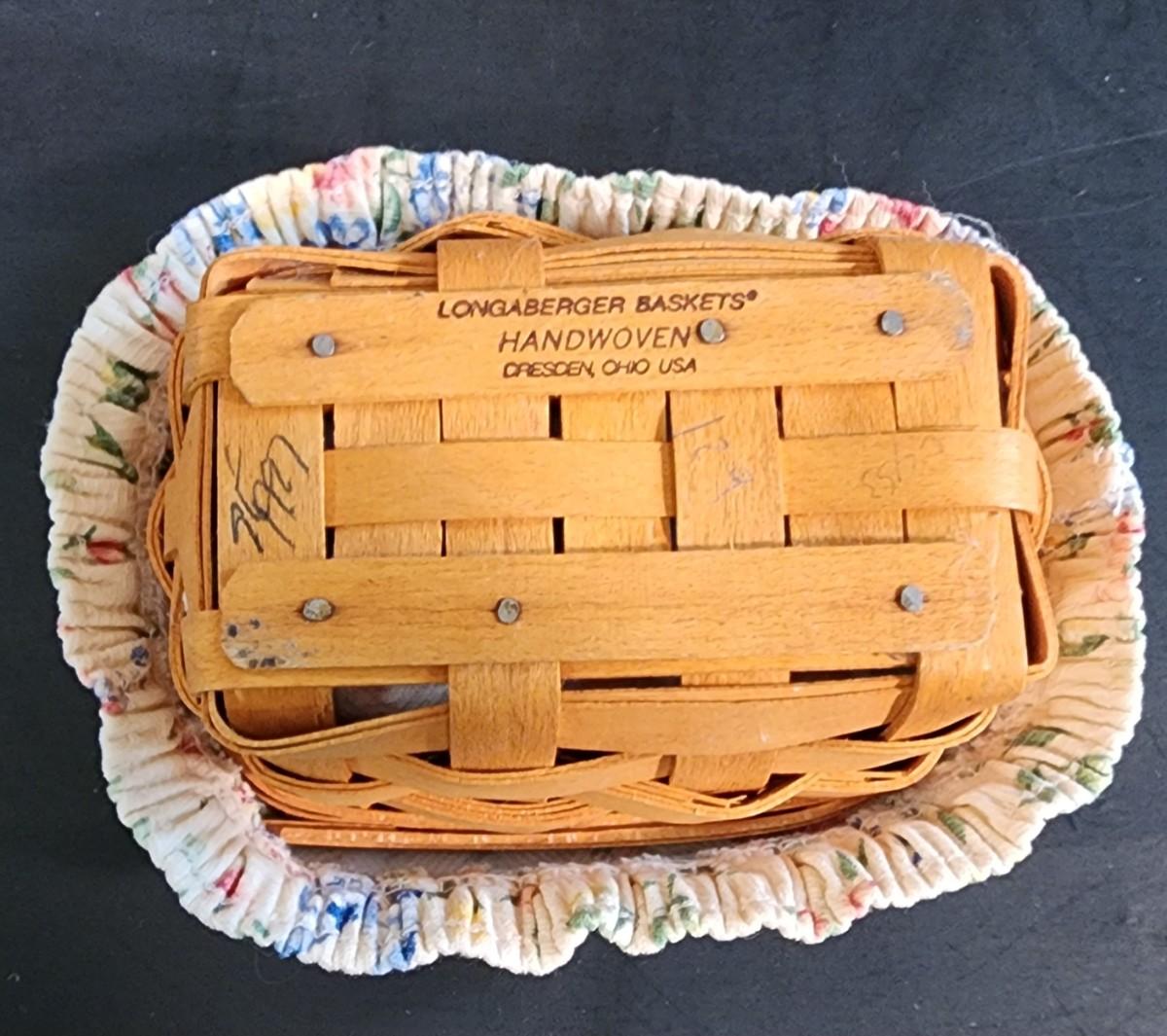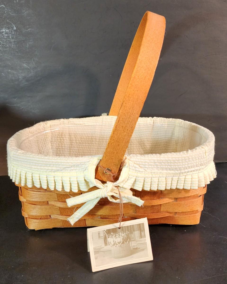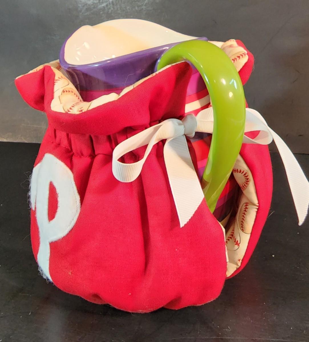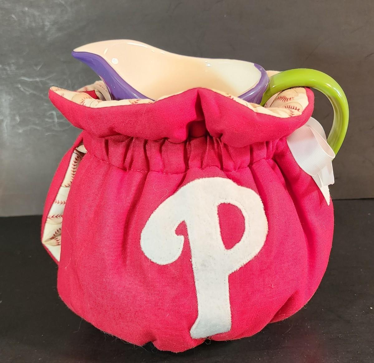 LOT 28:: Peterboro and Longaberger baskets with cloth liners, lil elephant thimble, ceramic cats, water pitcher with Phillies quilt cover and Laundry sign