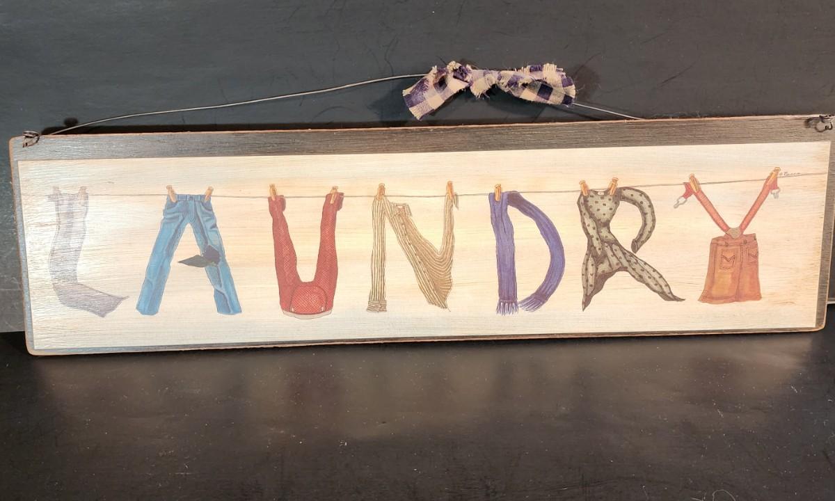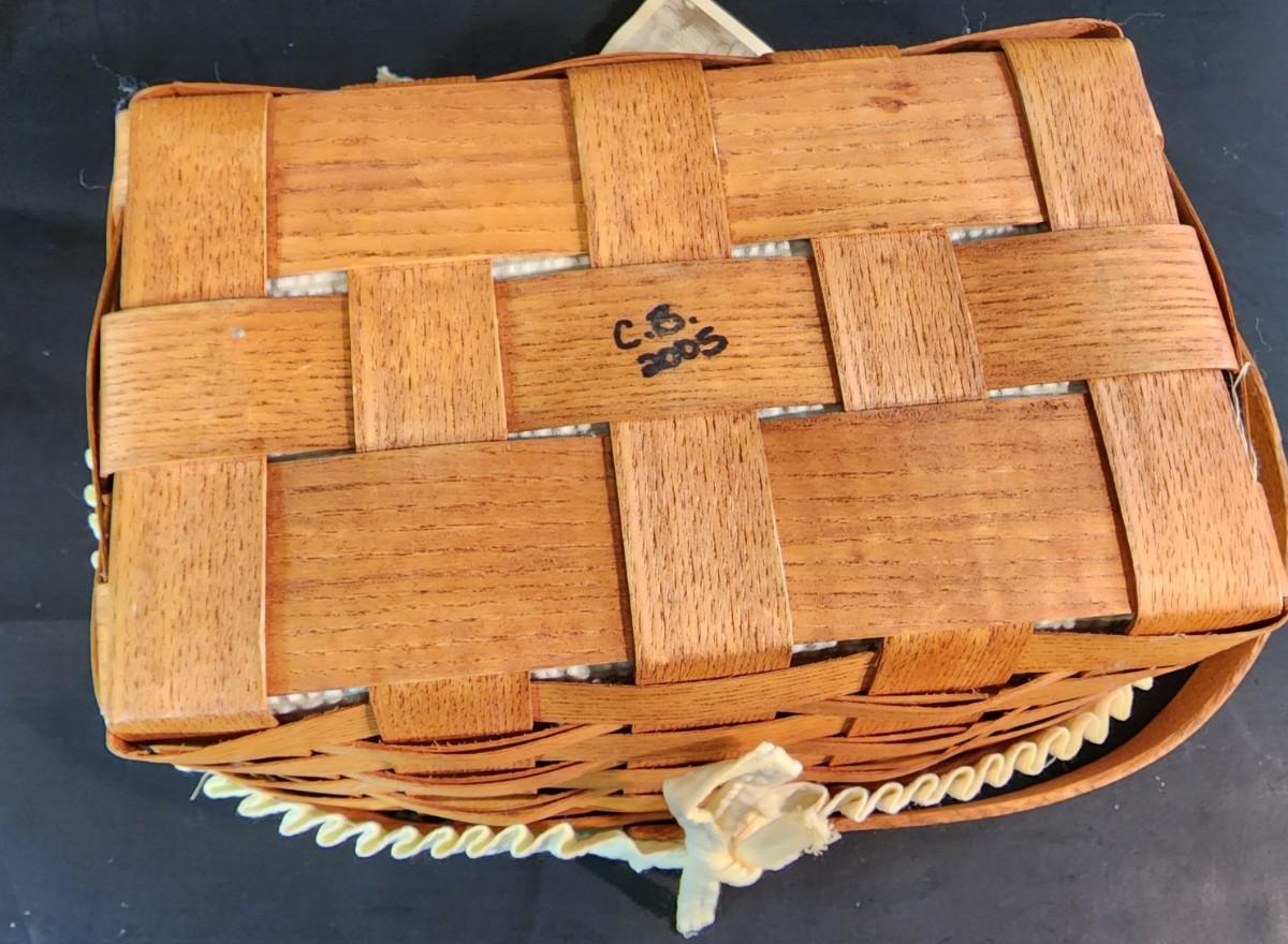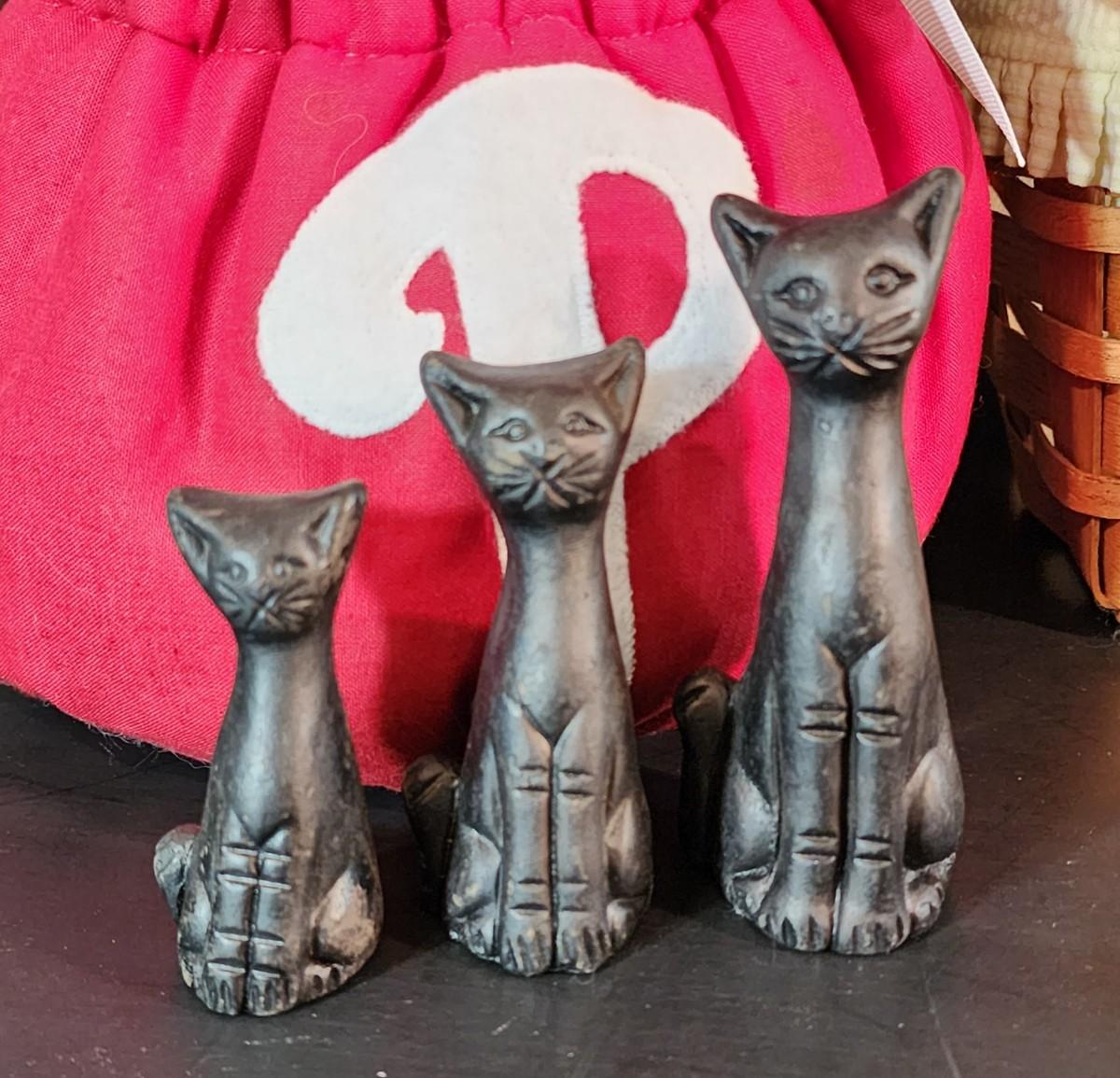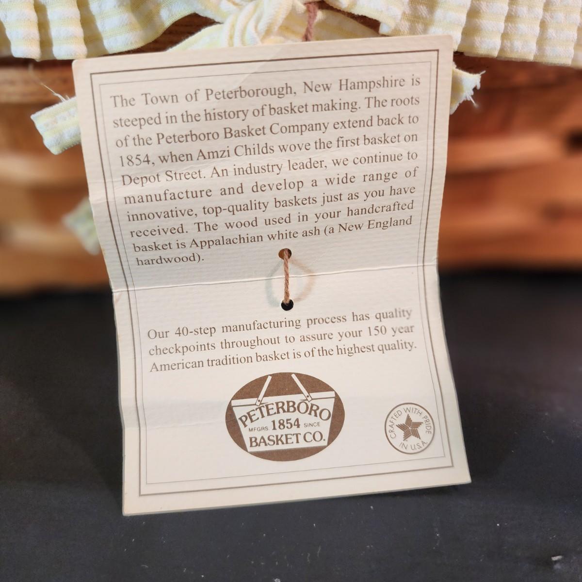 LOT 28:: Peterboro and Longaberger baskets with cloth liners, lil elephant thimble, ceramic cats, water pitcher with Phillies quilt cover and Laundry sign