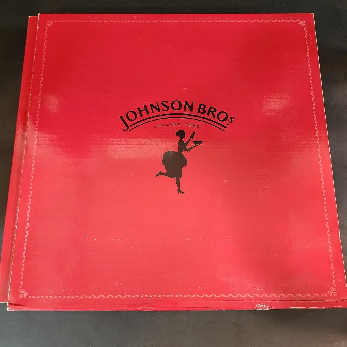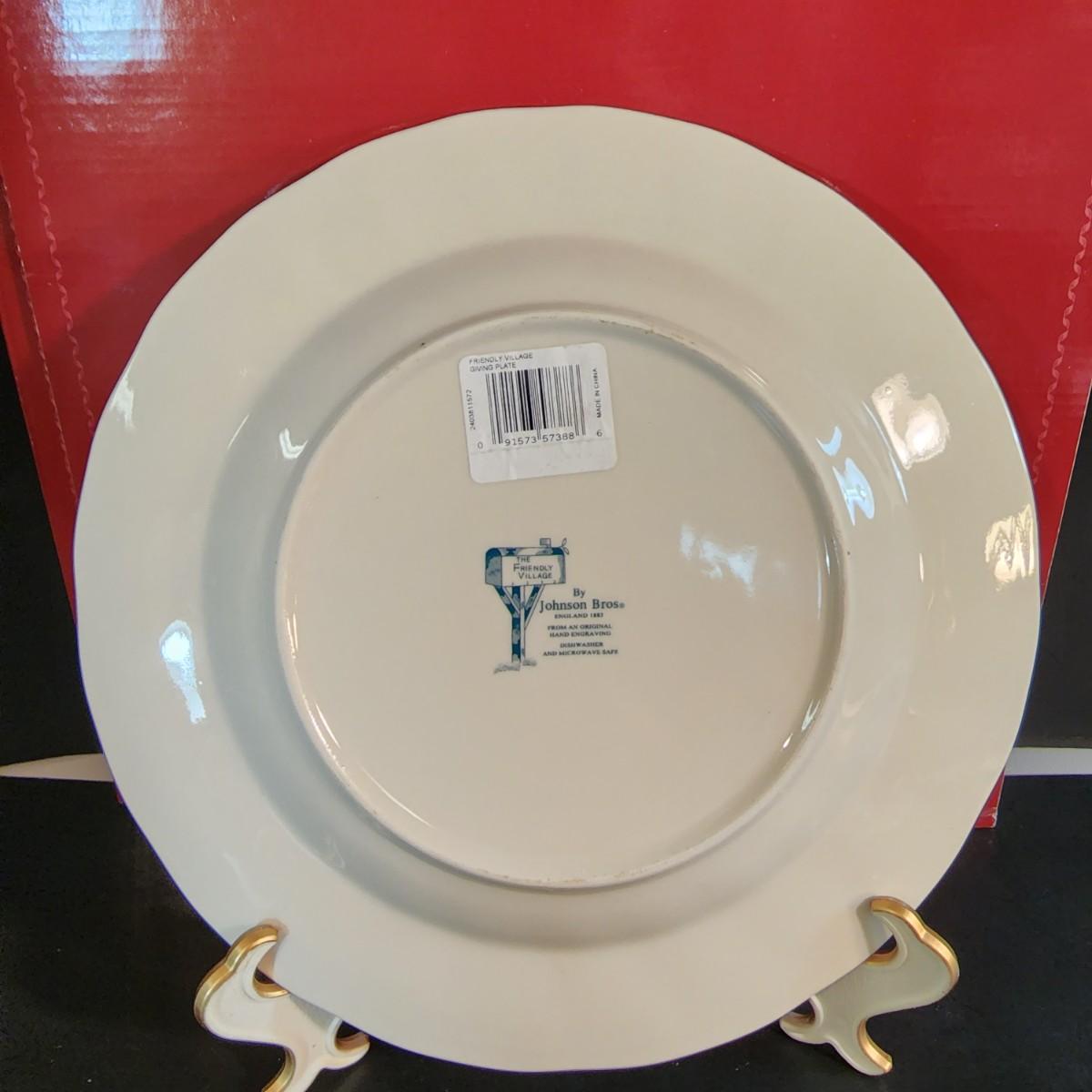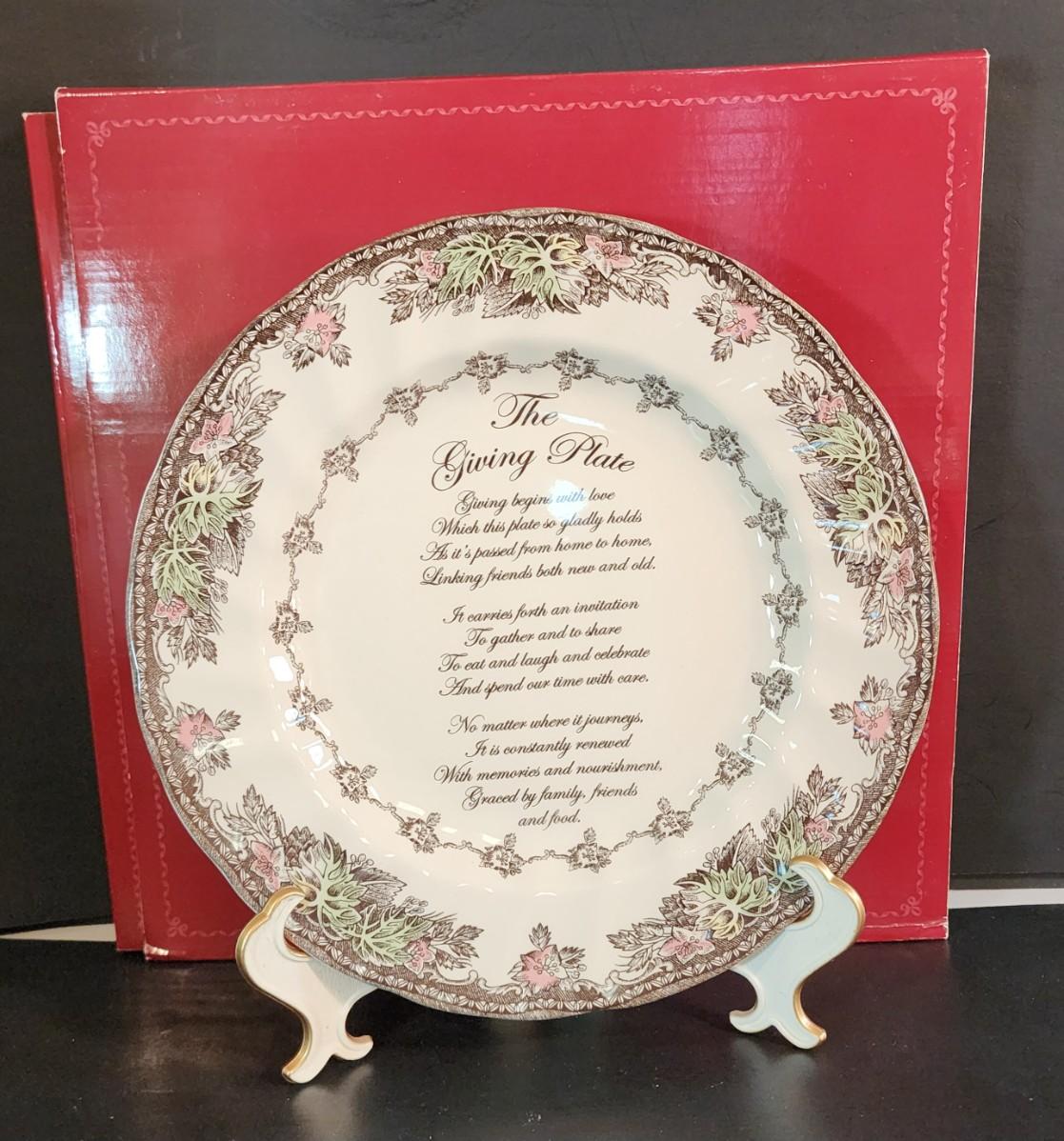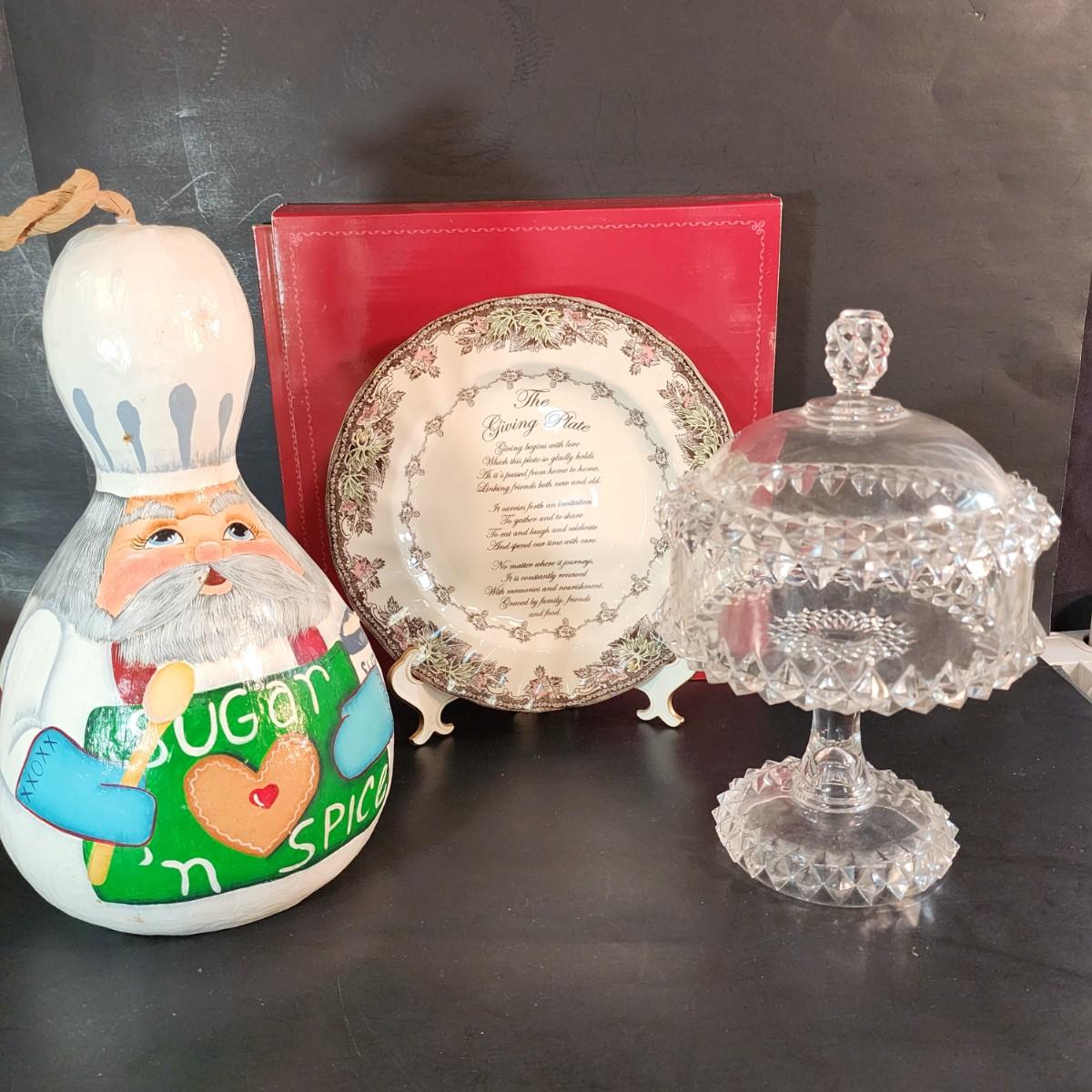 LOT29:: Johnson Brothers Giving plate, new in box, cut glass pedestal candy dish and large handpainted gourd