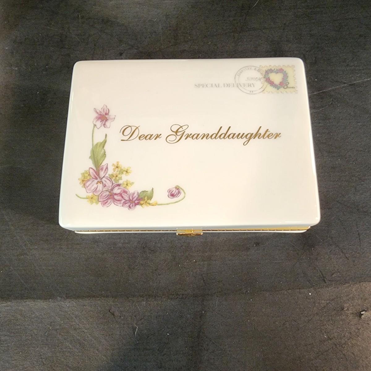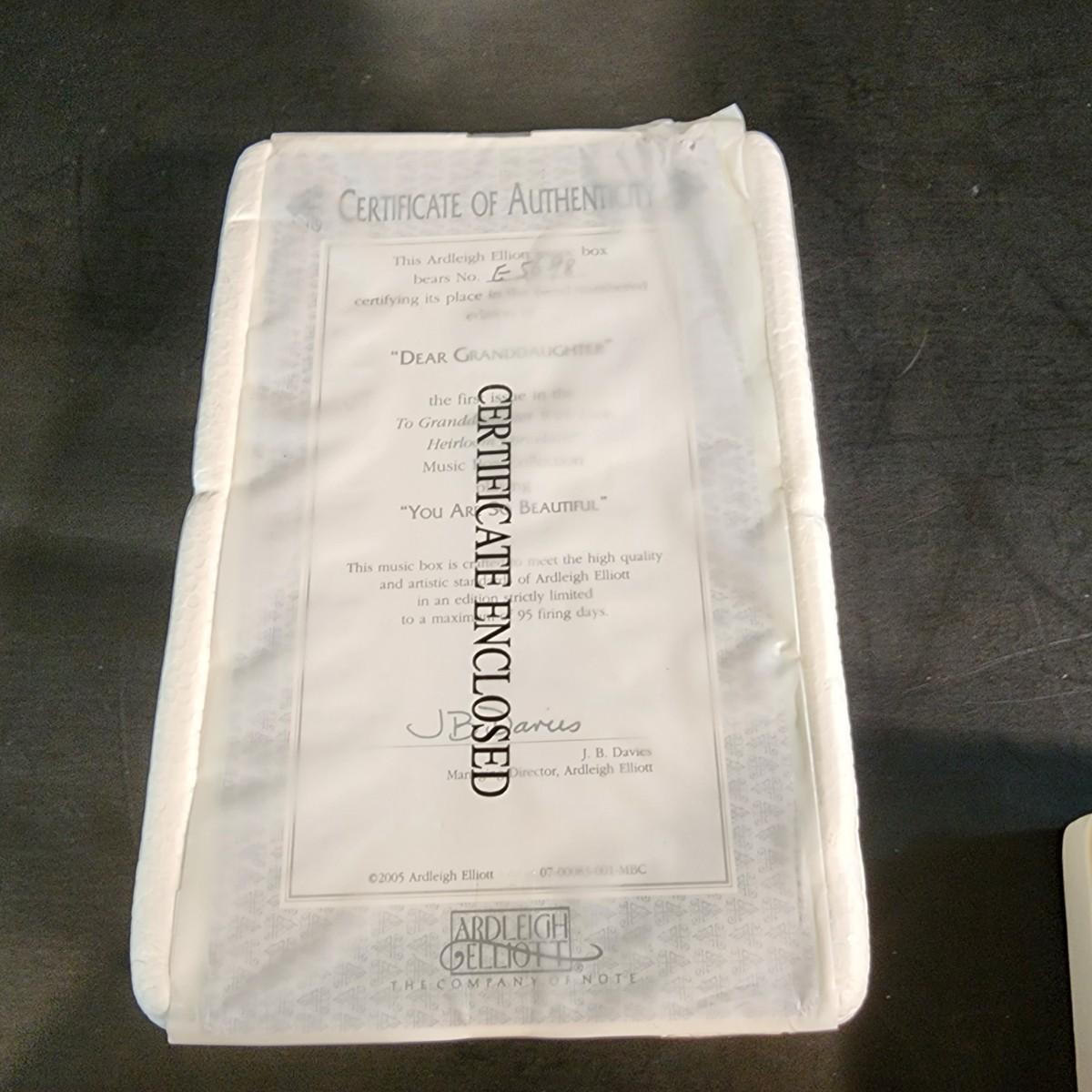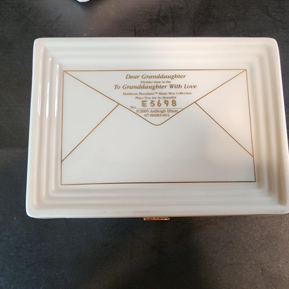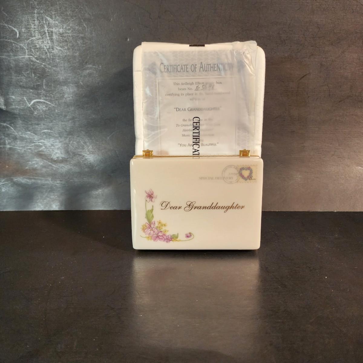 LOT 35:: Ardleigh Elliot NEW with COA Porcelain Music Box- "Dear Granddaughter"