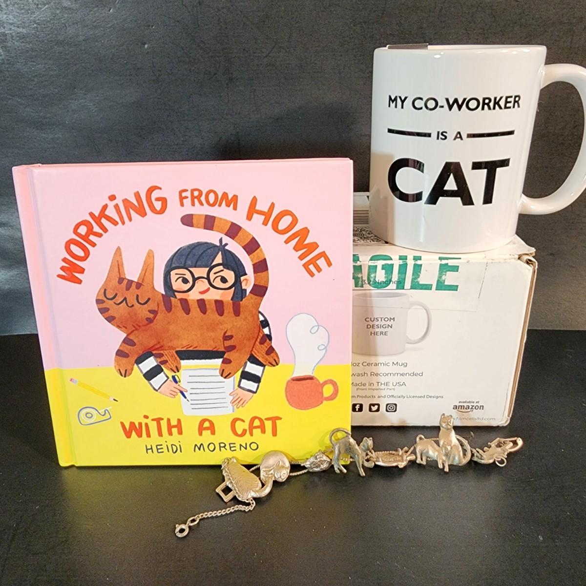 LOT 40:: Cat Lady Lot- New coffee mug, a lil book and 7" L cat charm bracelet