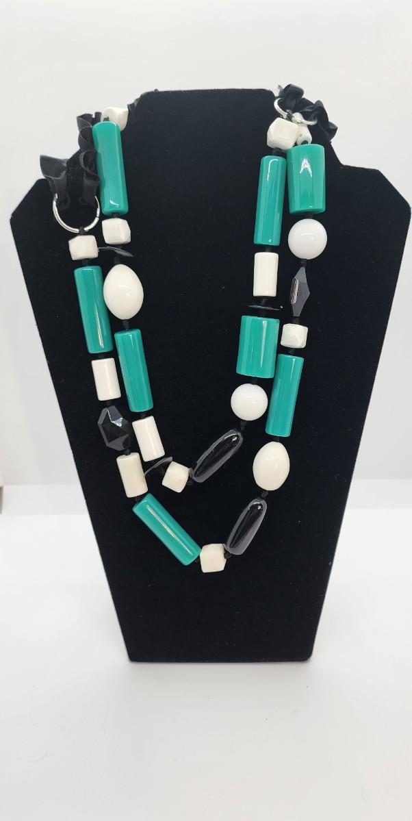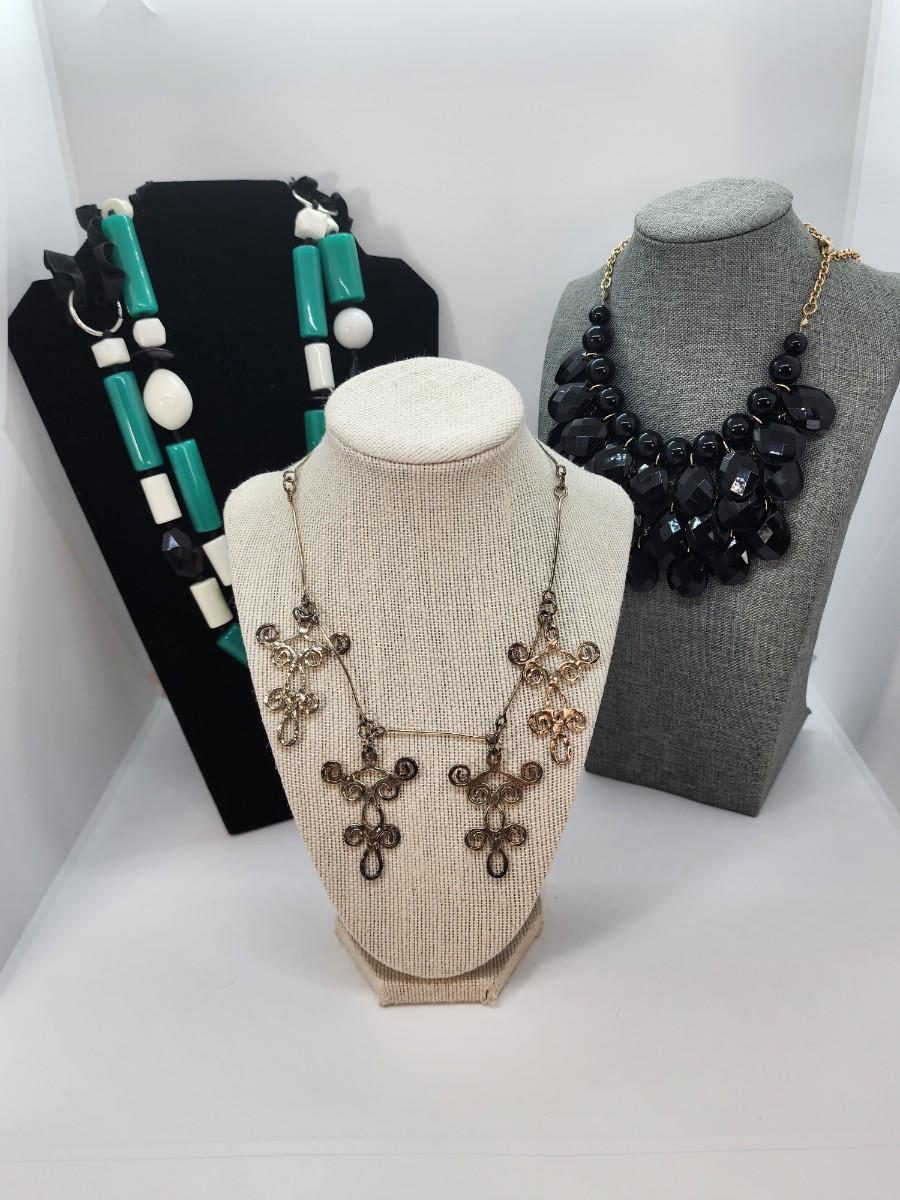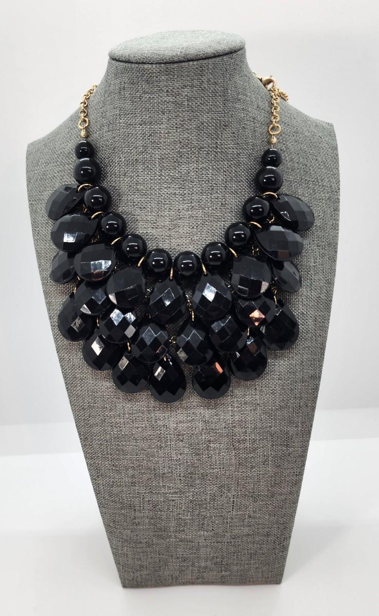 LOT:: Necklace LotGren, black, edited beads with ribbon back 54" L, silvertone 19" L statement Necklace and Black Bib Necklace 22" L