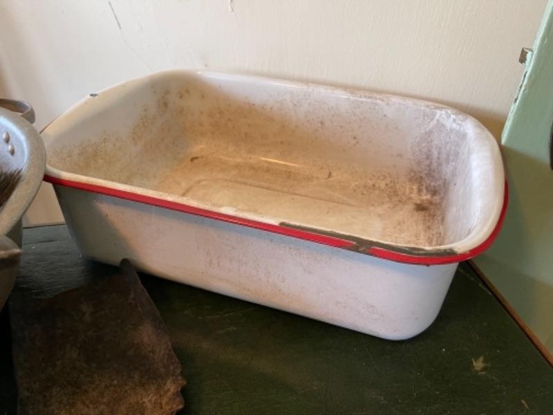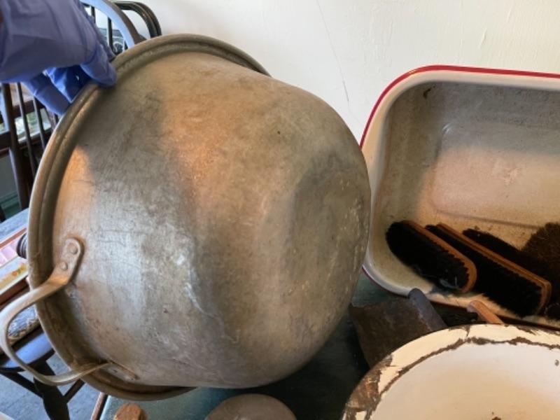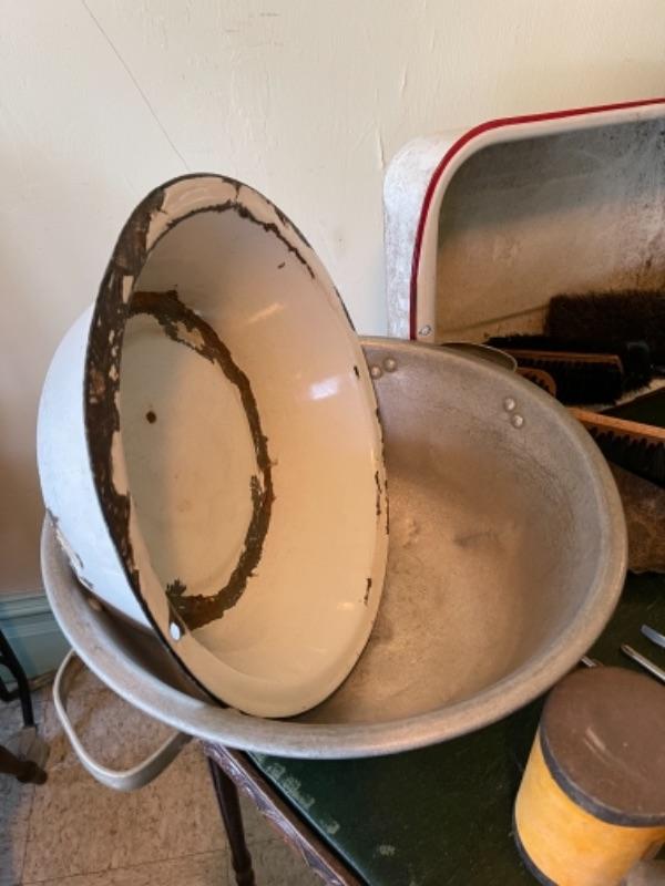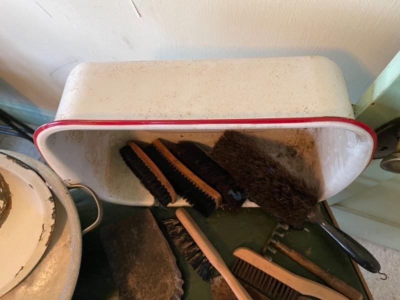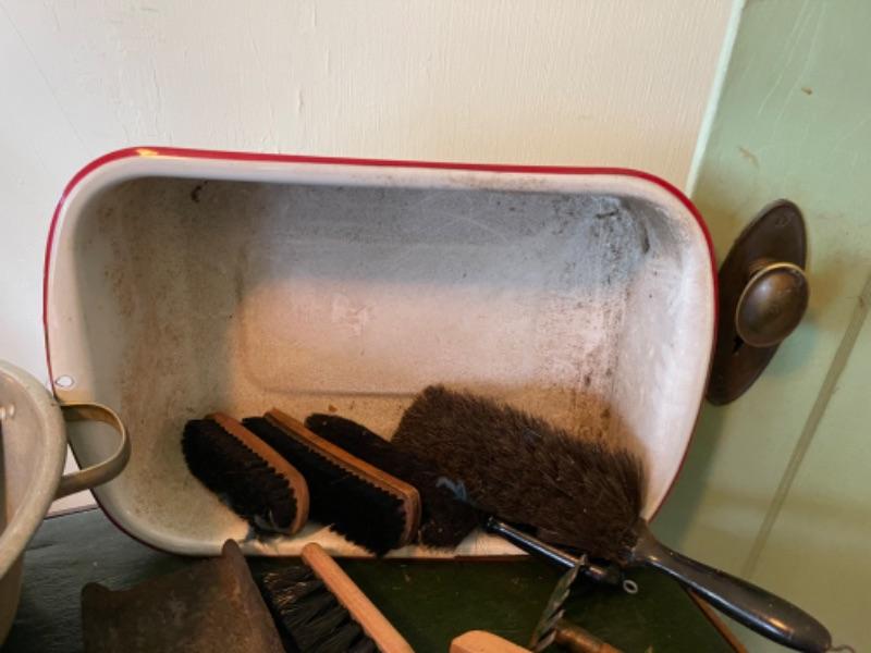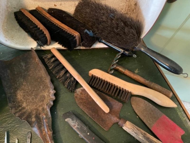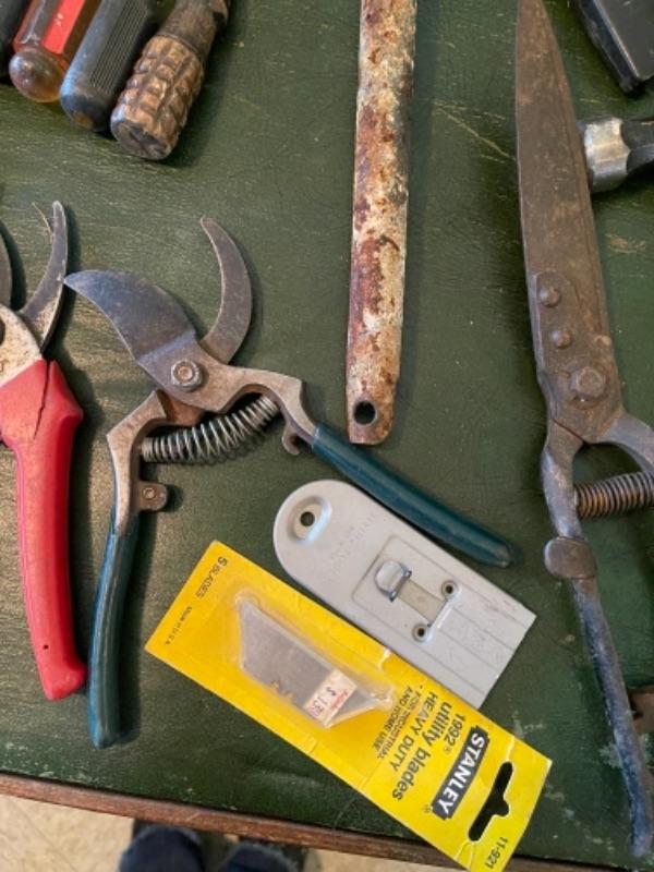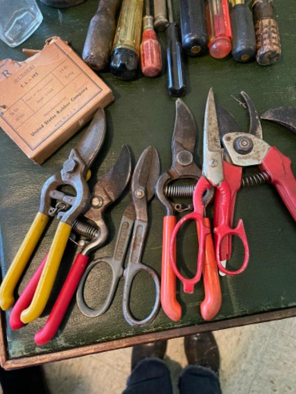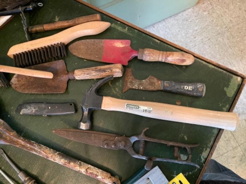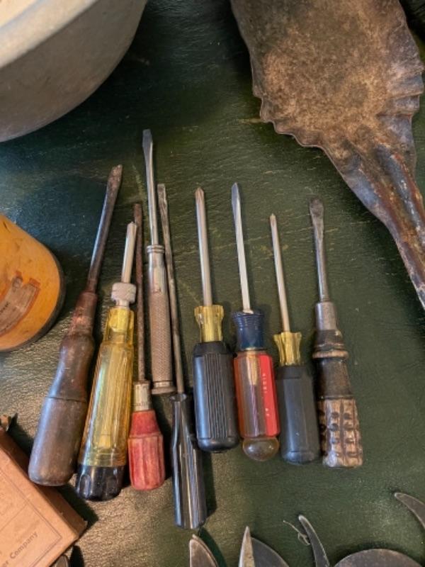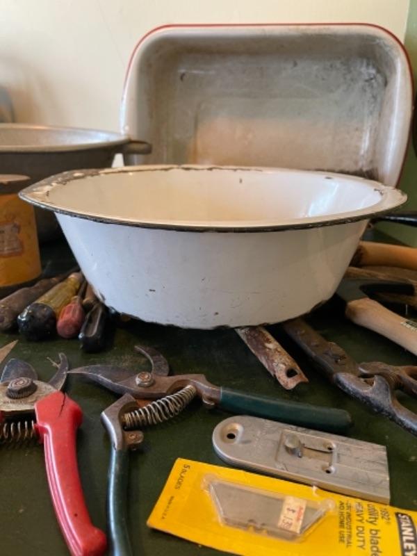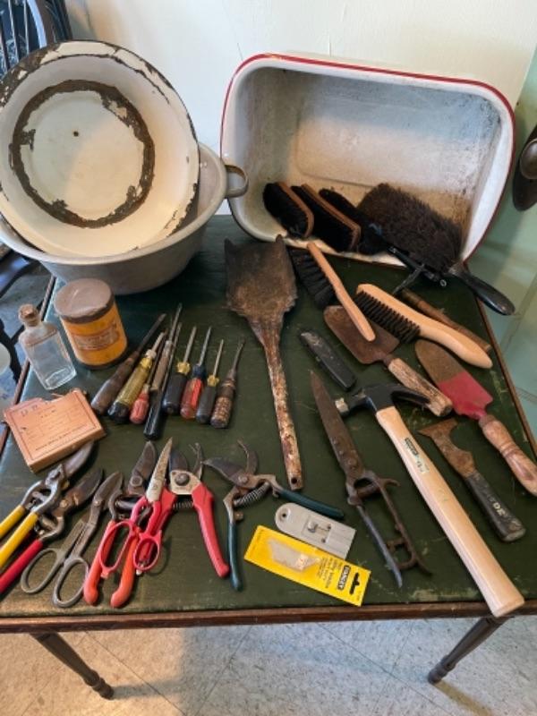 Lot 82K. Assortment of hand tools, enamel basins, screw drivers, brushes, shears, hammer, etc.--$55