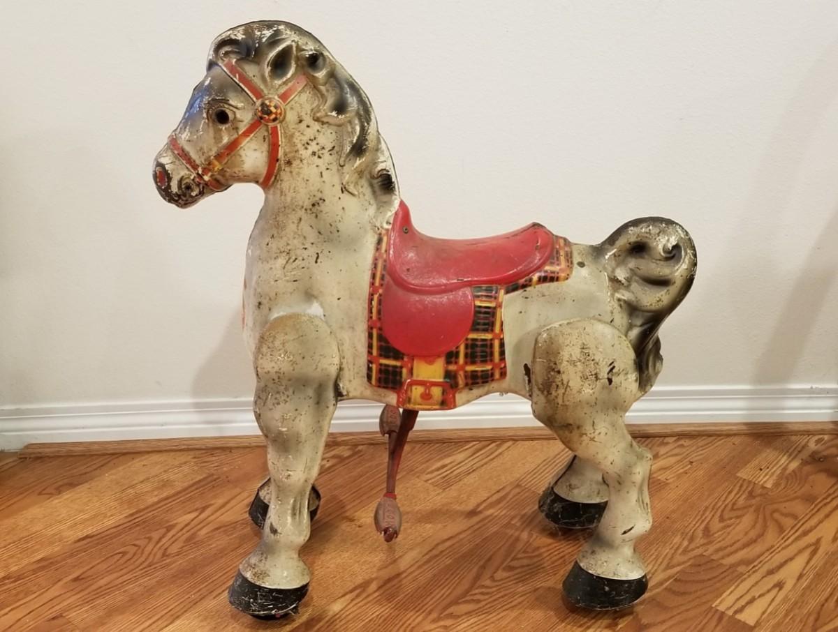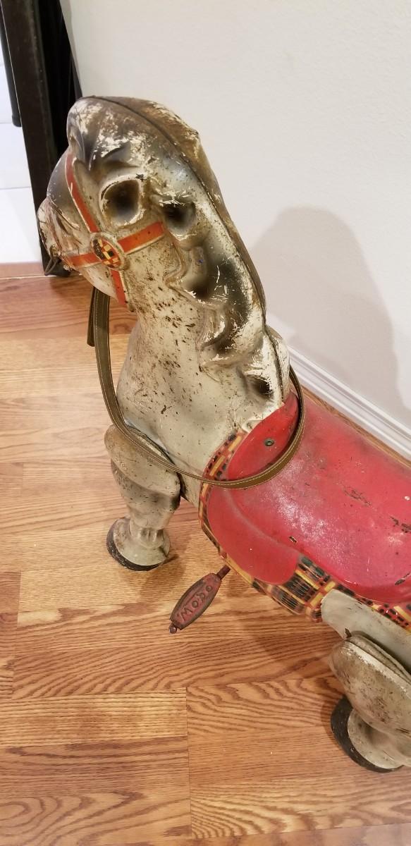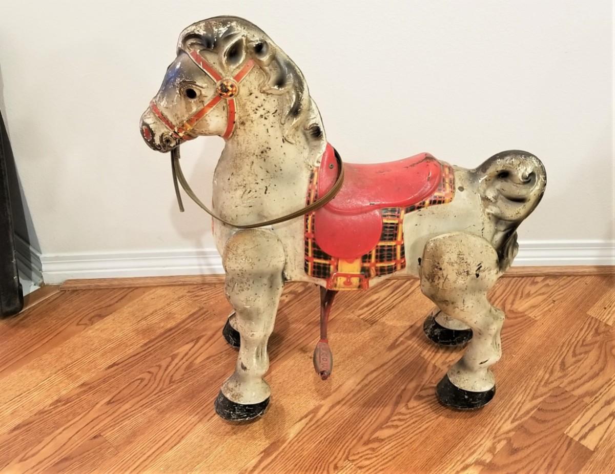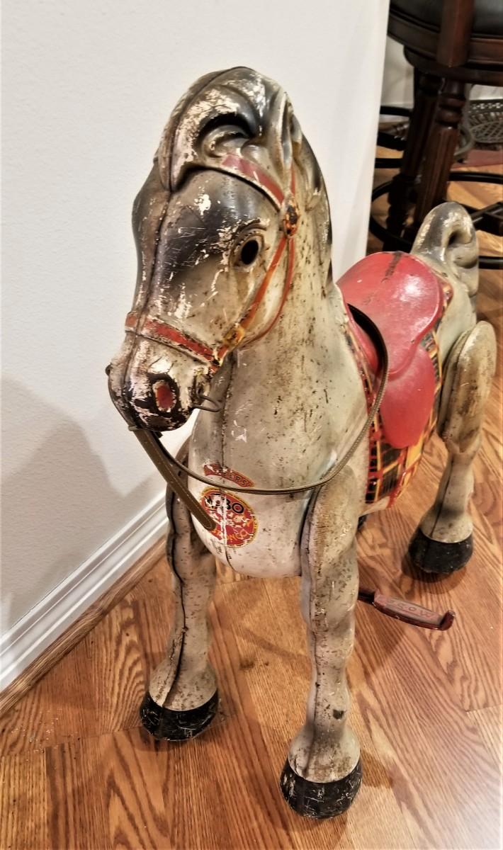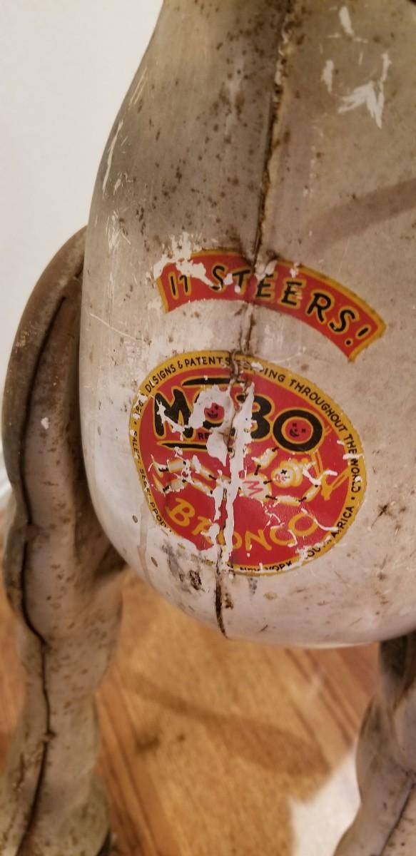 Metal (pressed tin) English made Mobo-Bronco, a 1950's-1960's bouncy horse. Still in working condition, not locked up - sit the kid on it, they bouncy up and down and off you go!. Well loved, but still has some "life" left in it - all original. 30.5" tall, 14" wide and 27" long. These routinely sell on Ebay in the $200-300 dollar range (plus shipping). First one I've seen in this area.