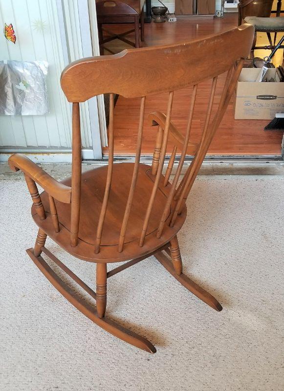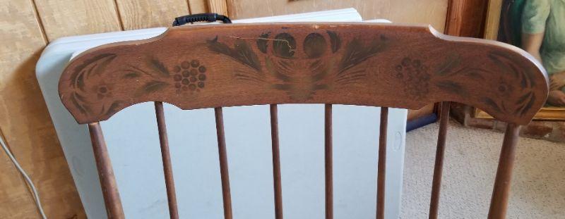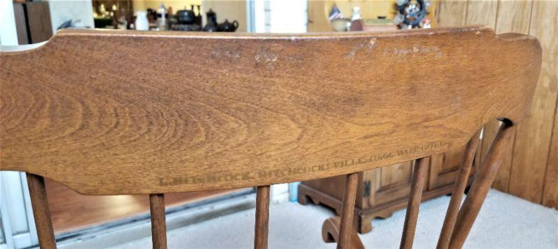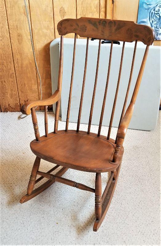 Collectible rocker made by the L. Hitchcock Chair Company (marked), painted decoration, solid maple - colonial style late 60's/early 70'sl. 24" across, 40.5" tall, 30" rockers. Good condition. Company is known for fine craftsmanship. This rocker was expensive when new.