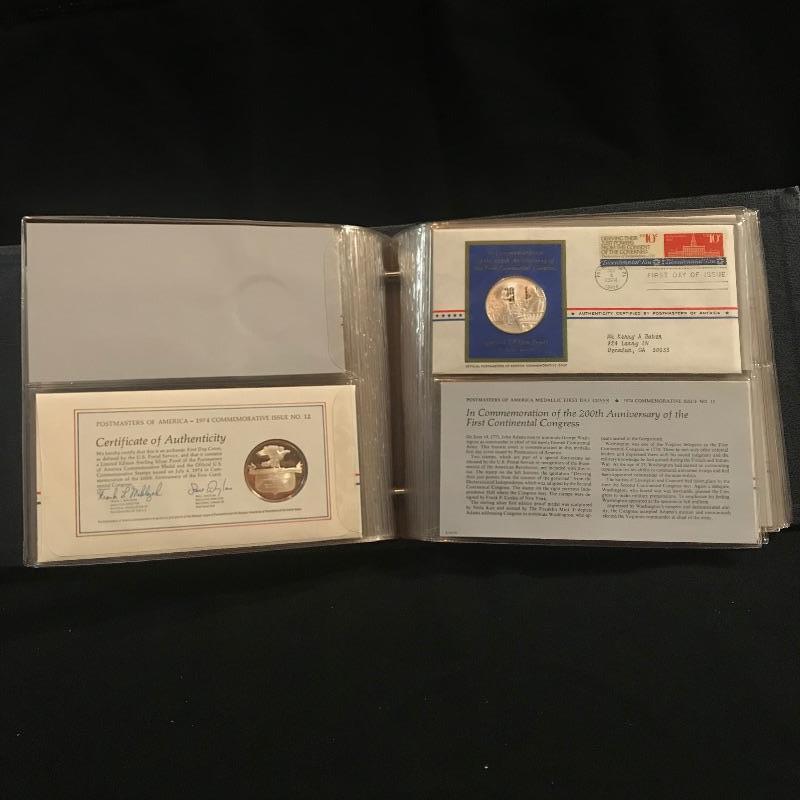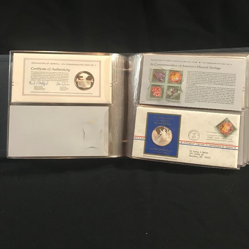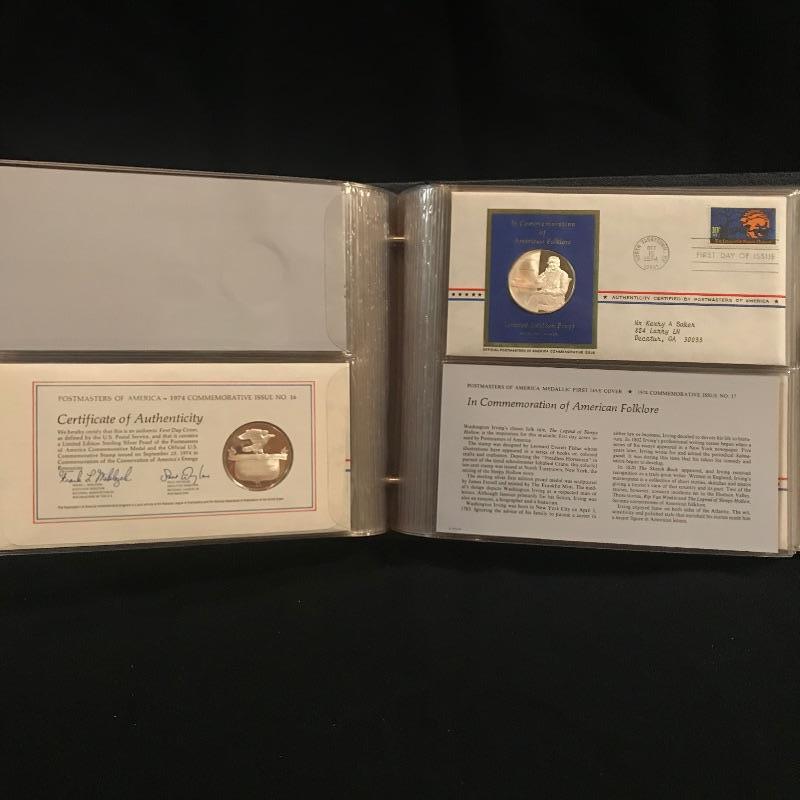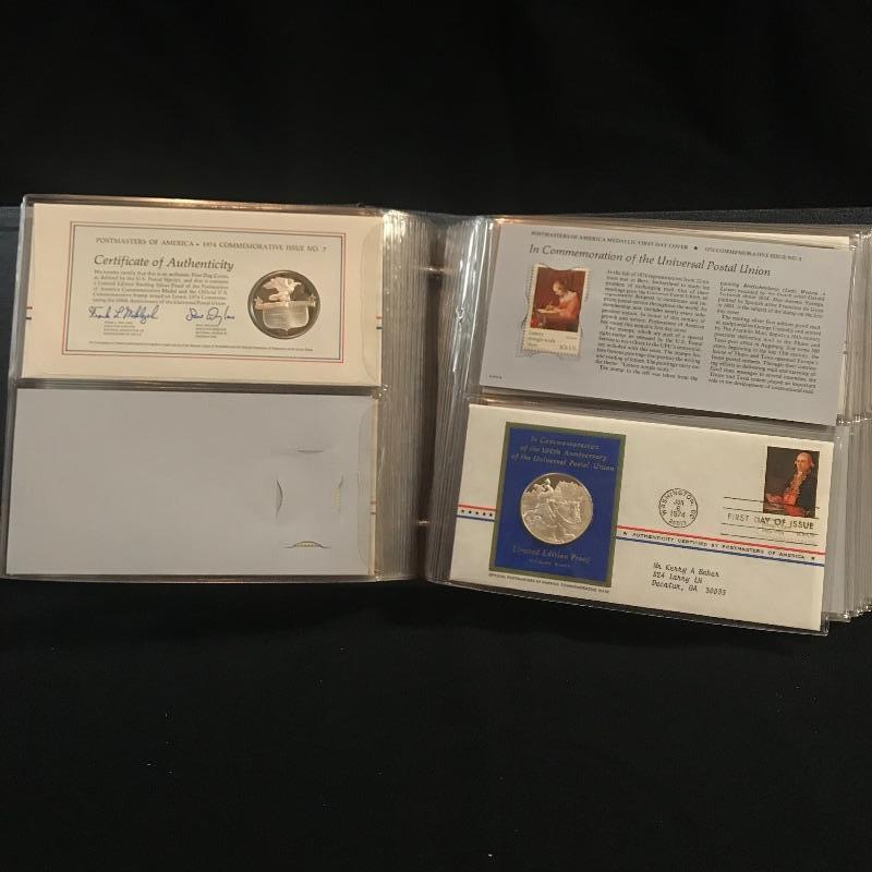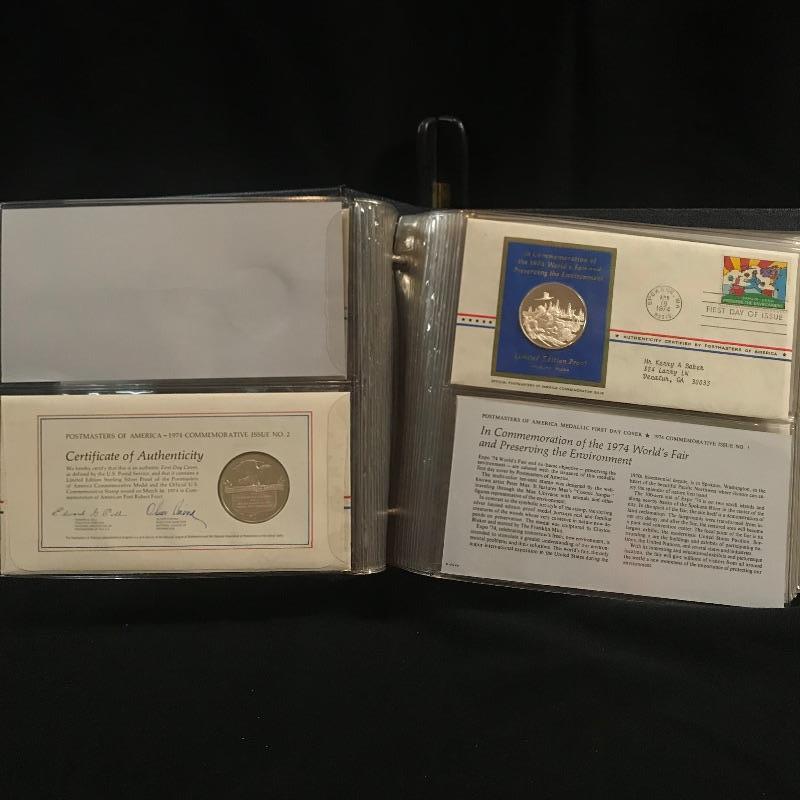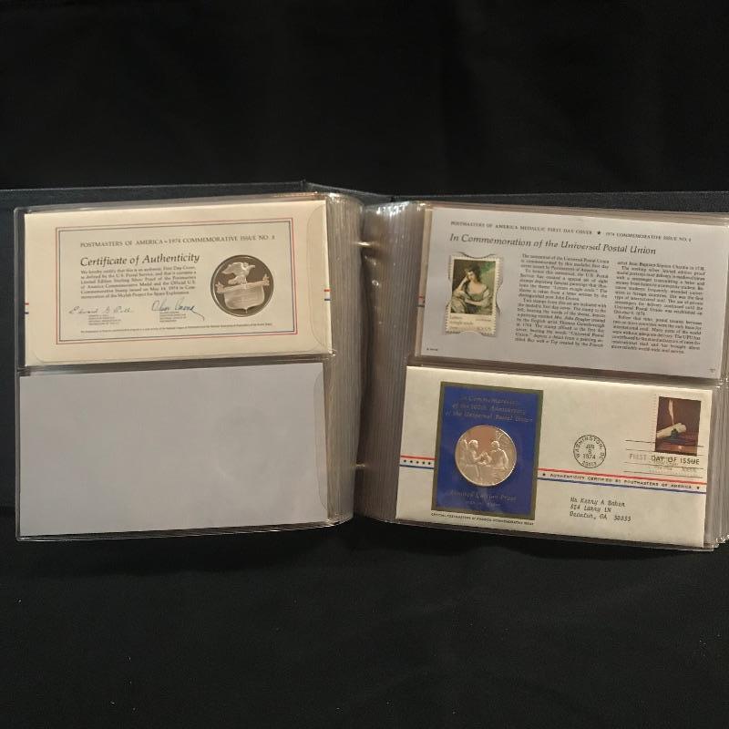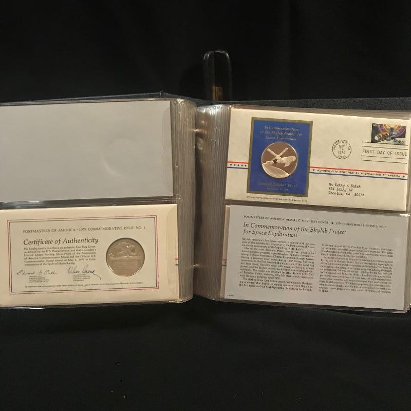 A black book full of 1974 commemorative 1st Day Issue stamps with Proof Sterling Silver Medallions. Most pages have COA on envelope. Lot also contains 1975 Commemoration of the Apollo-Soyuz Space Mission sterling silver coin and stamp set. Starting price due to melt value of coins.