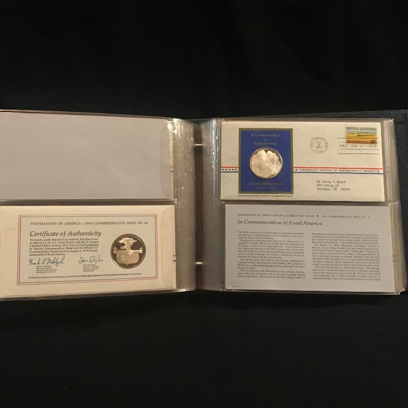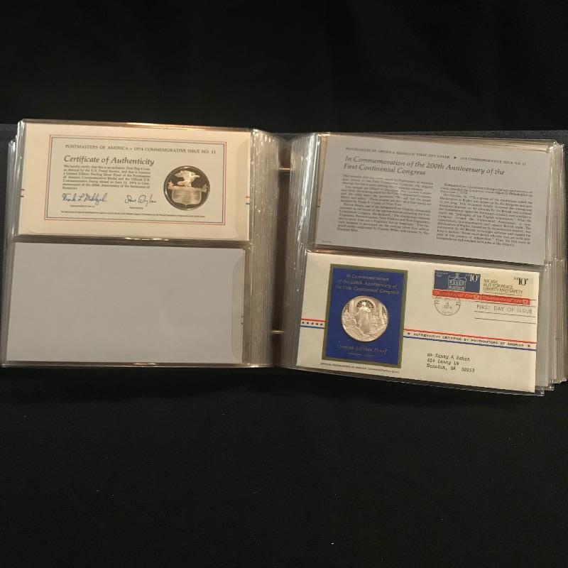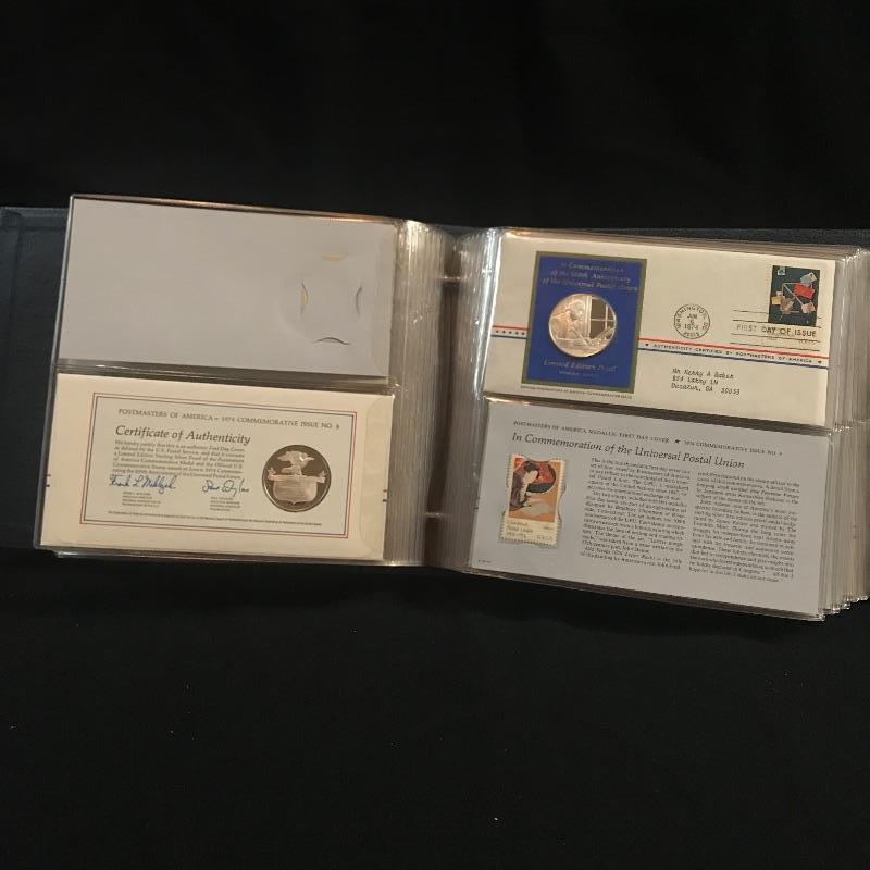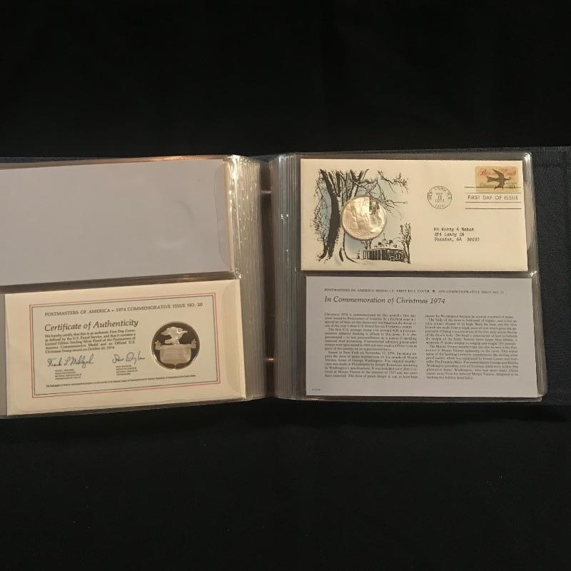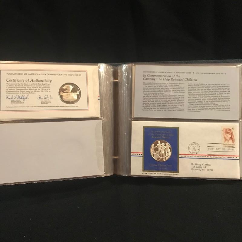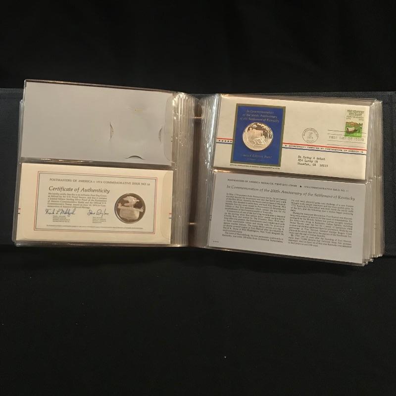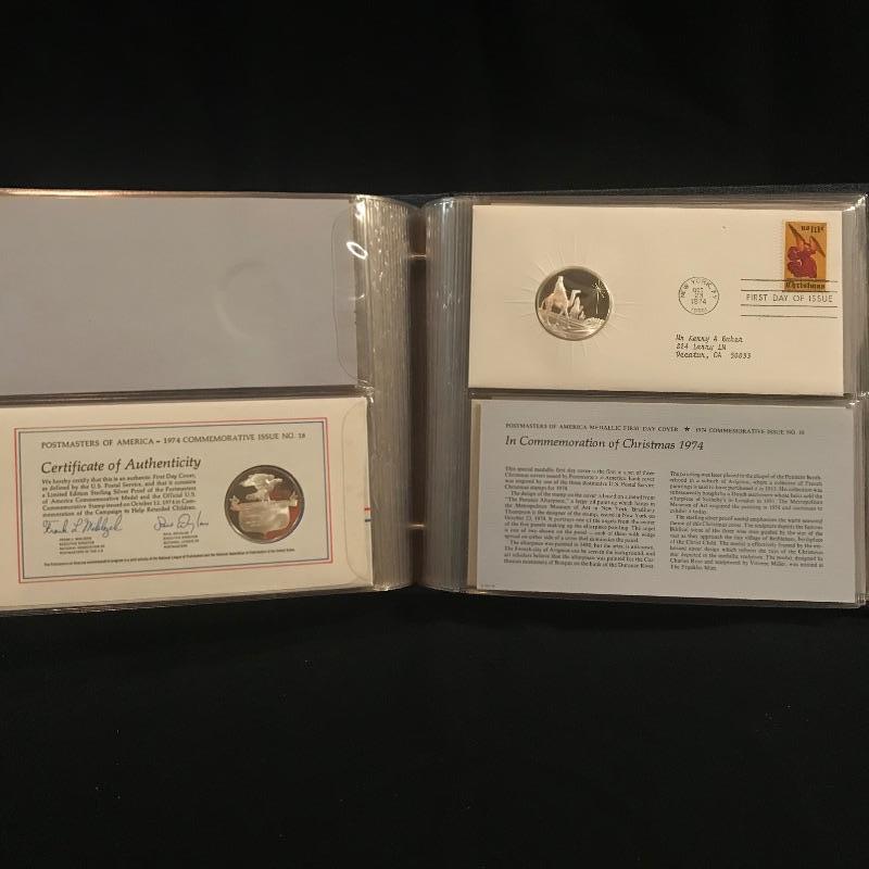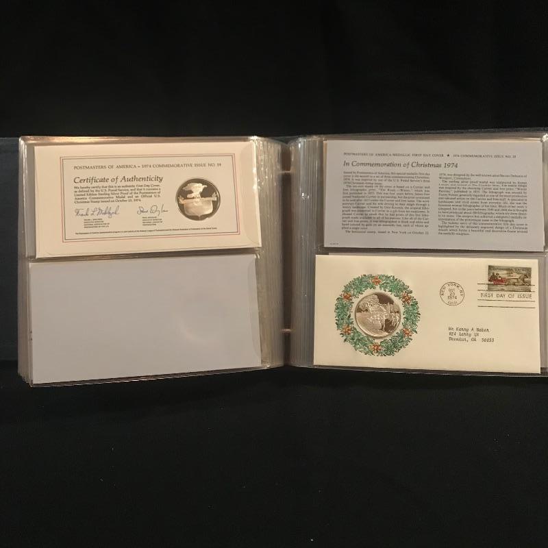 A black book full of 1974 commemorative 1st Day Issue stamps with Proof Sterling Silver Medallions. Most pages have COA on envelope. Lot also contains 1975 Commemoration of the Apollo-Soyuz Space Mission sterling silver coin and stamp set. Starting price due to melt value of coins.