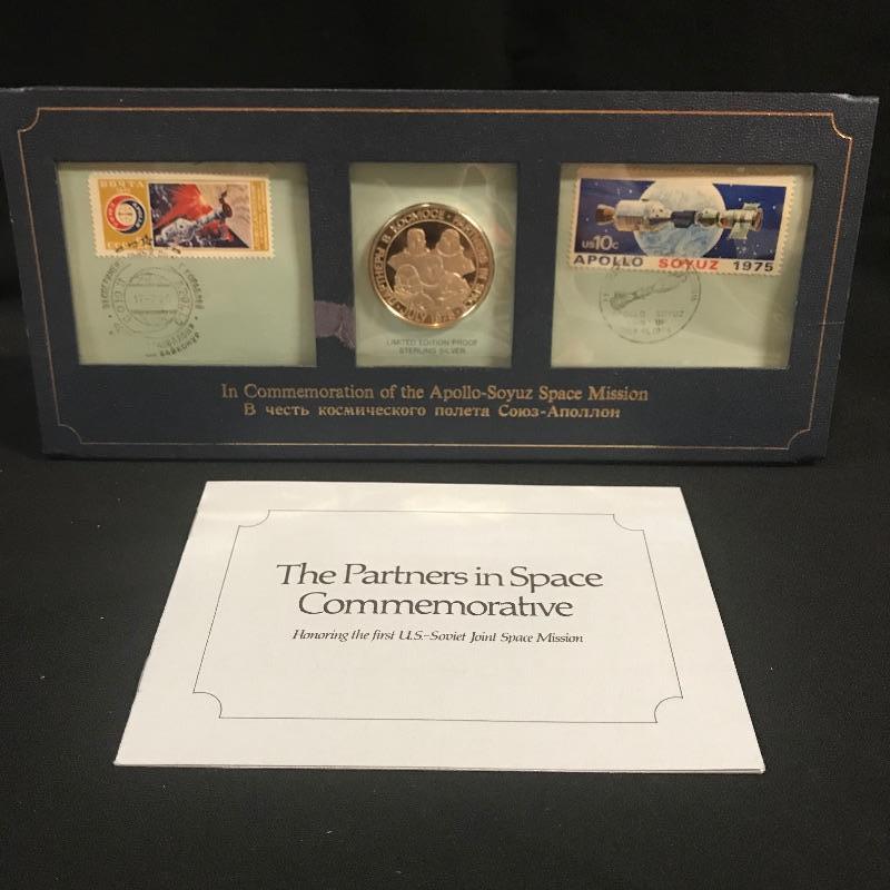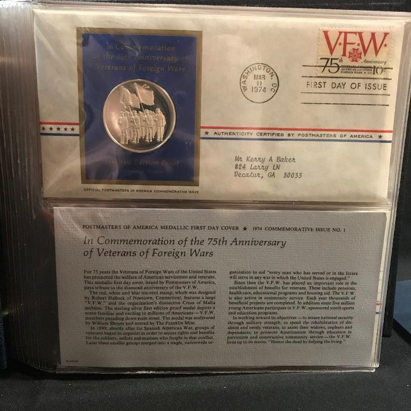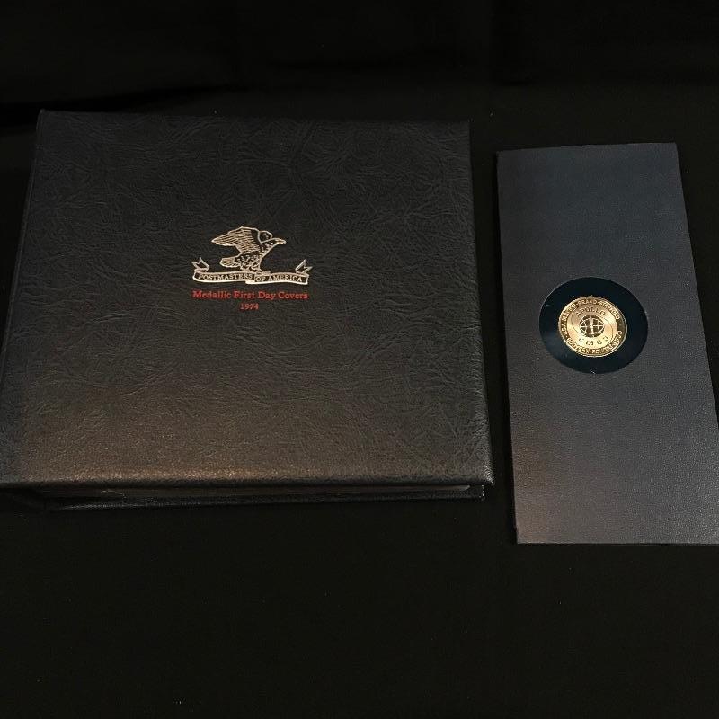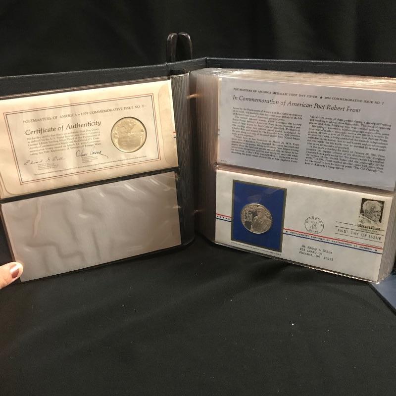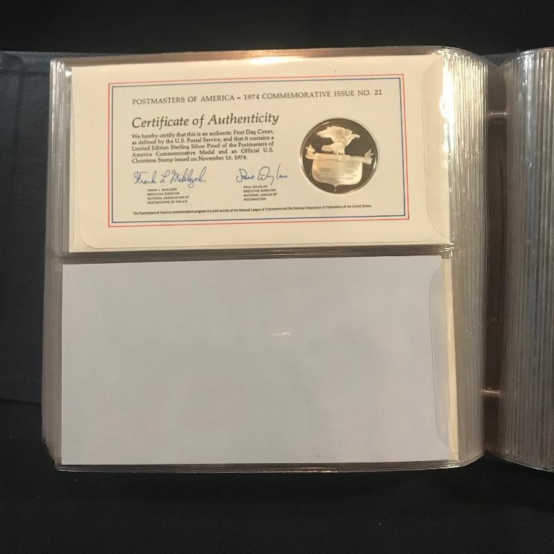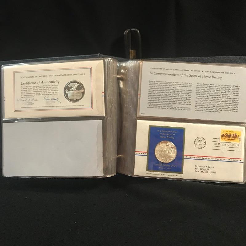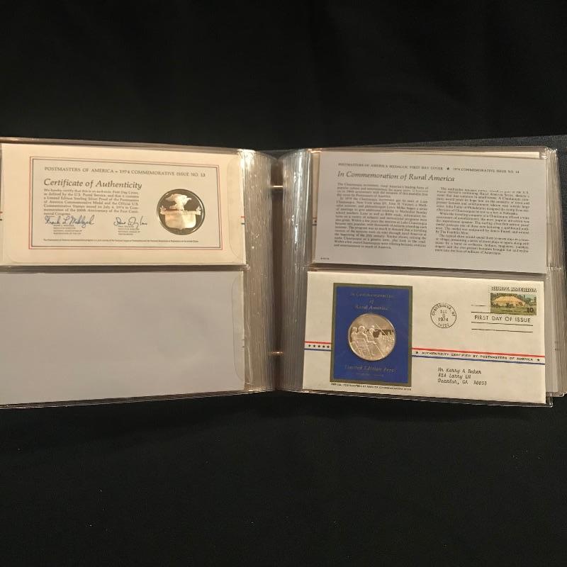 A black book full of 1974 commemorative 1st Day Issue stamps with Proof Sterling Silver Medallions. Most pages have COA on envelope. Lot also contains 1975 Commemoration of the Apollo-Soyuz Space Mission sterling silver coin and stamp set. Starting price due to melt value of coins.