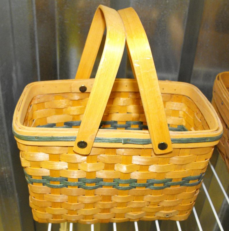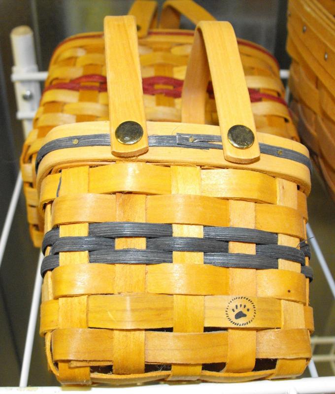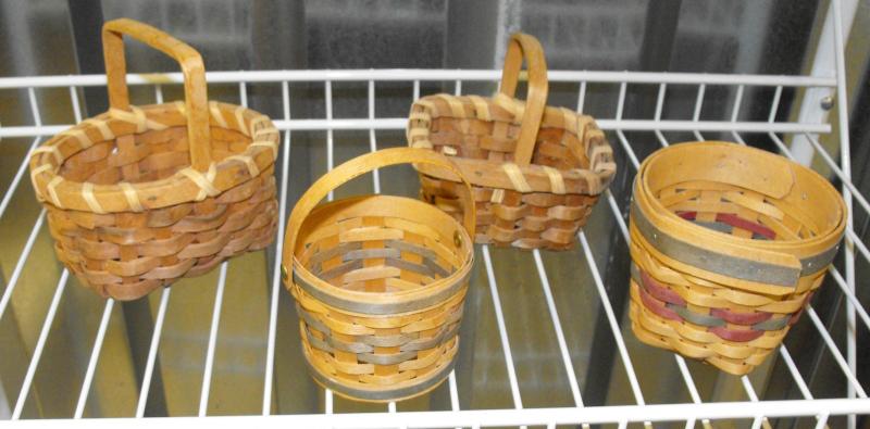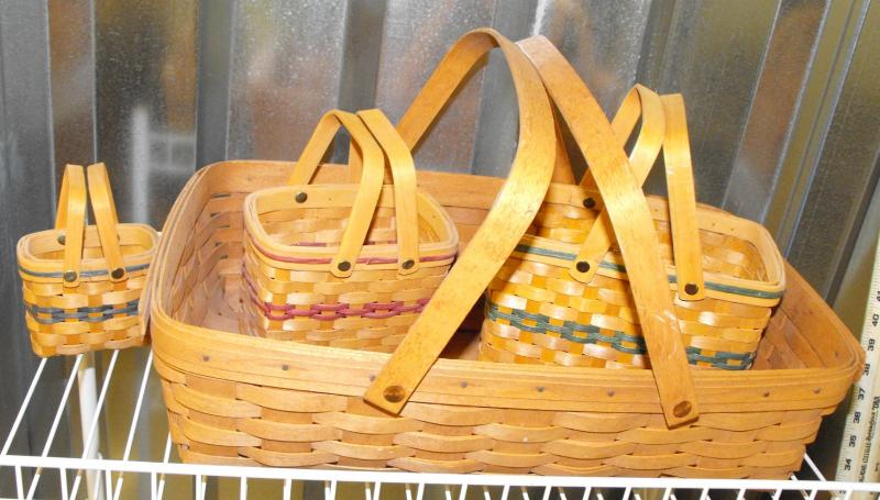 The largest basket is a Longaberger, the other 3 have a sticker with a Paw print on it I haven't been able to find the maker with that logo. The 4 smallest baskets 1 is Longaberger the others are not marked All VG