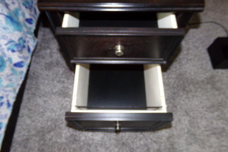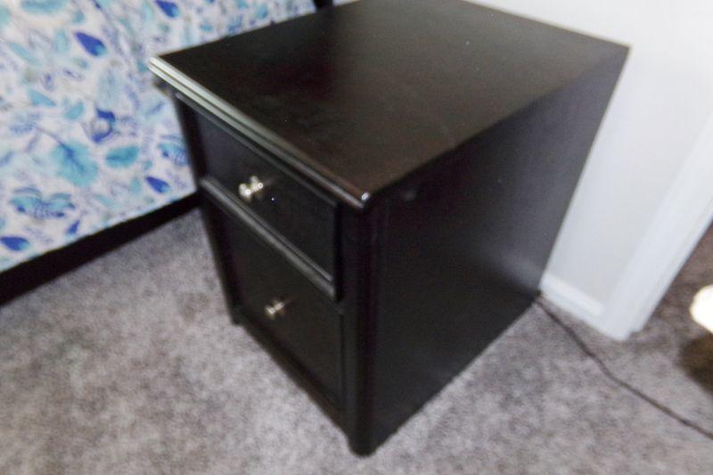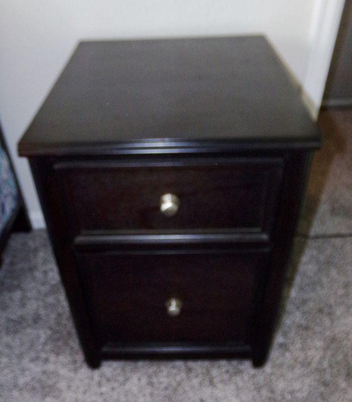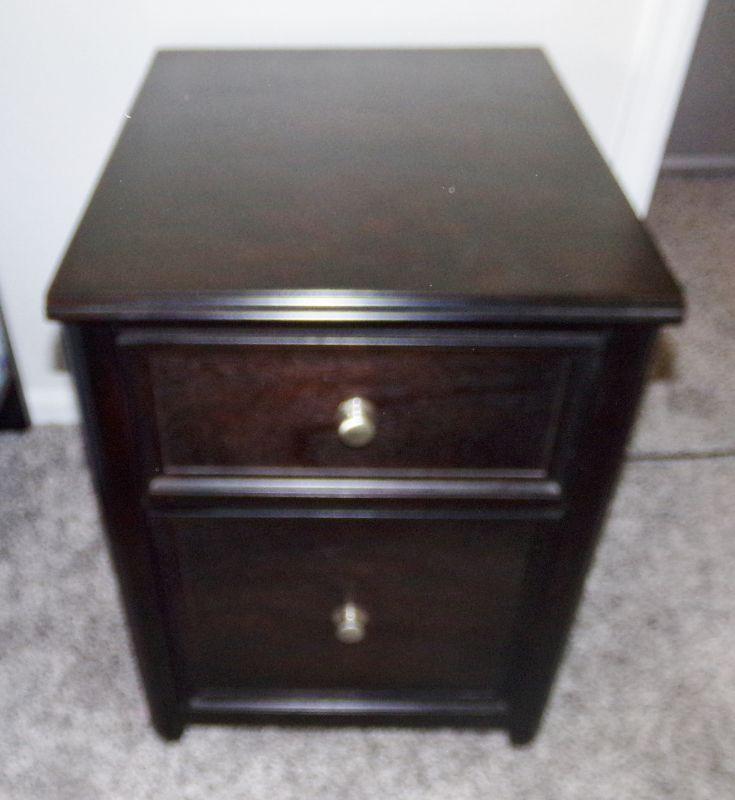 2 DRAWERS WITH THE BOTTOM ONE BEING A FILE CABINET THE TOP DRAWER FOR STORAGE. MEASURES 17" X 22" X 24"